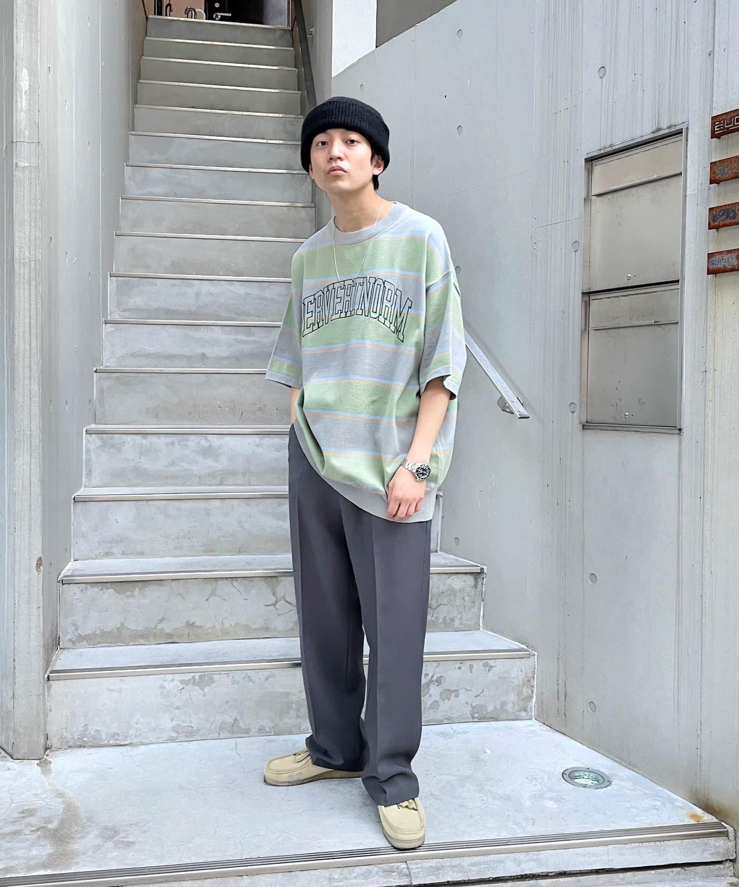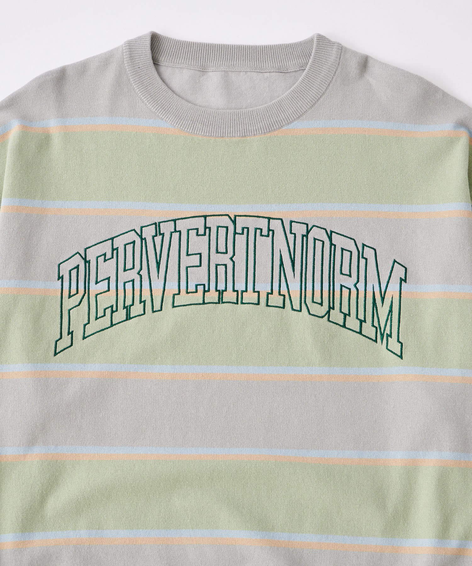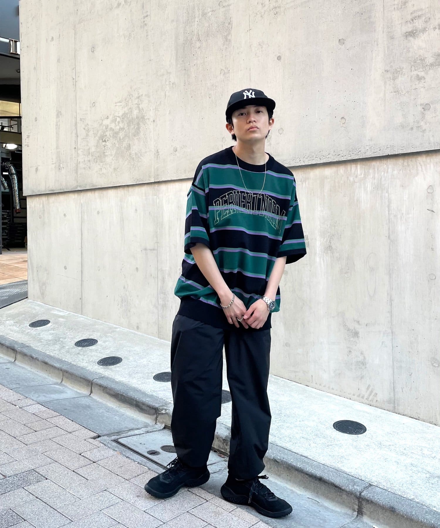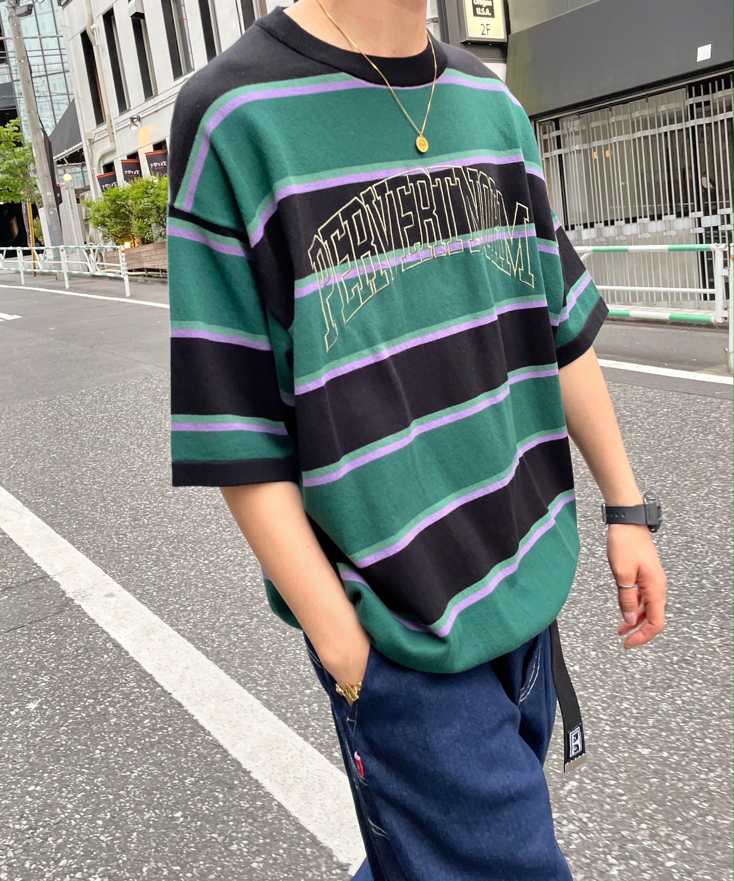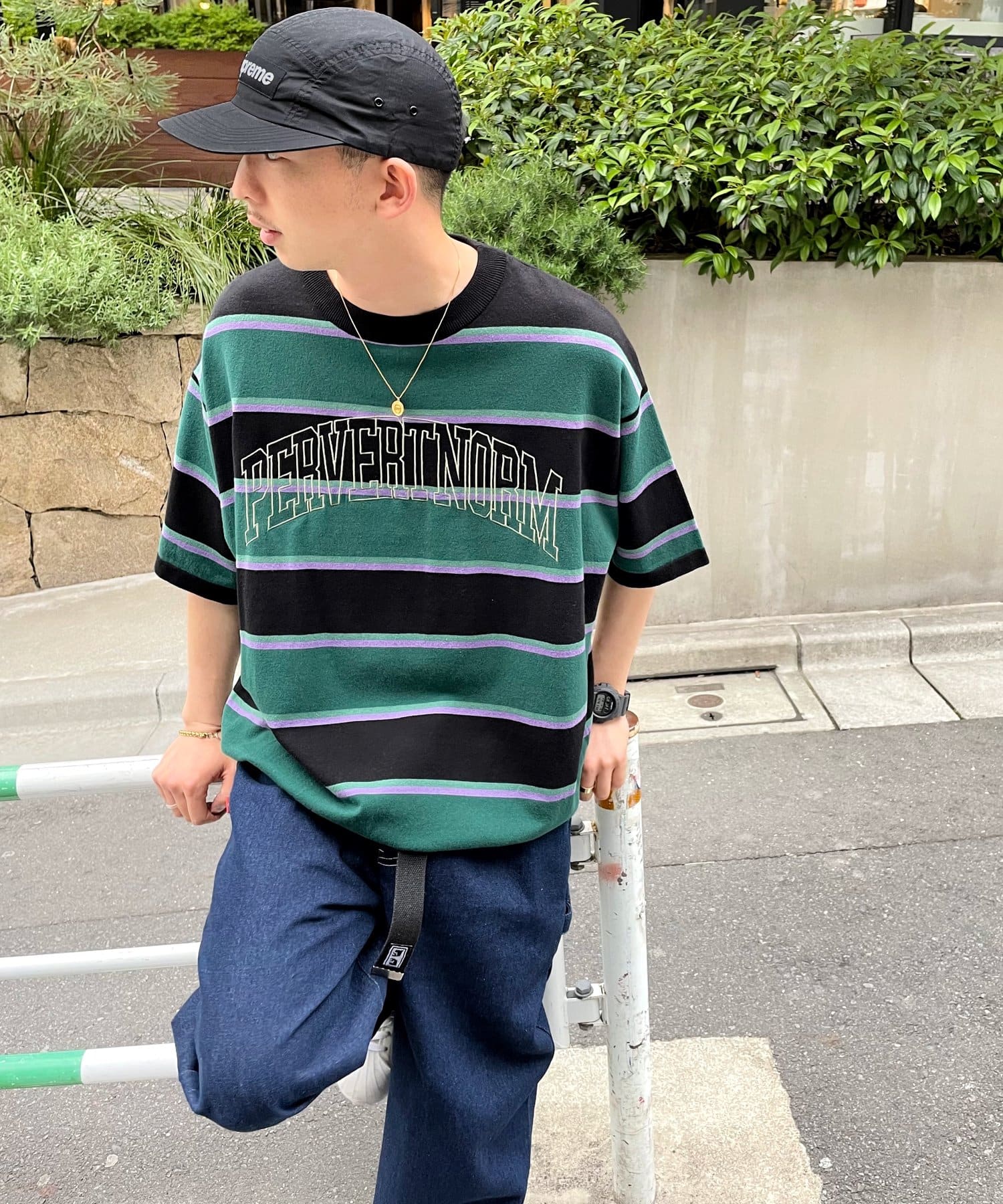 ・90年代彷彿させるレトロなボーダーとマッチする、刺繍ロゴの“PERVERTNORM”。目立ちすぎない存在感がコーデの雰囲気と相性もバツグン◎