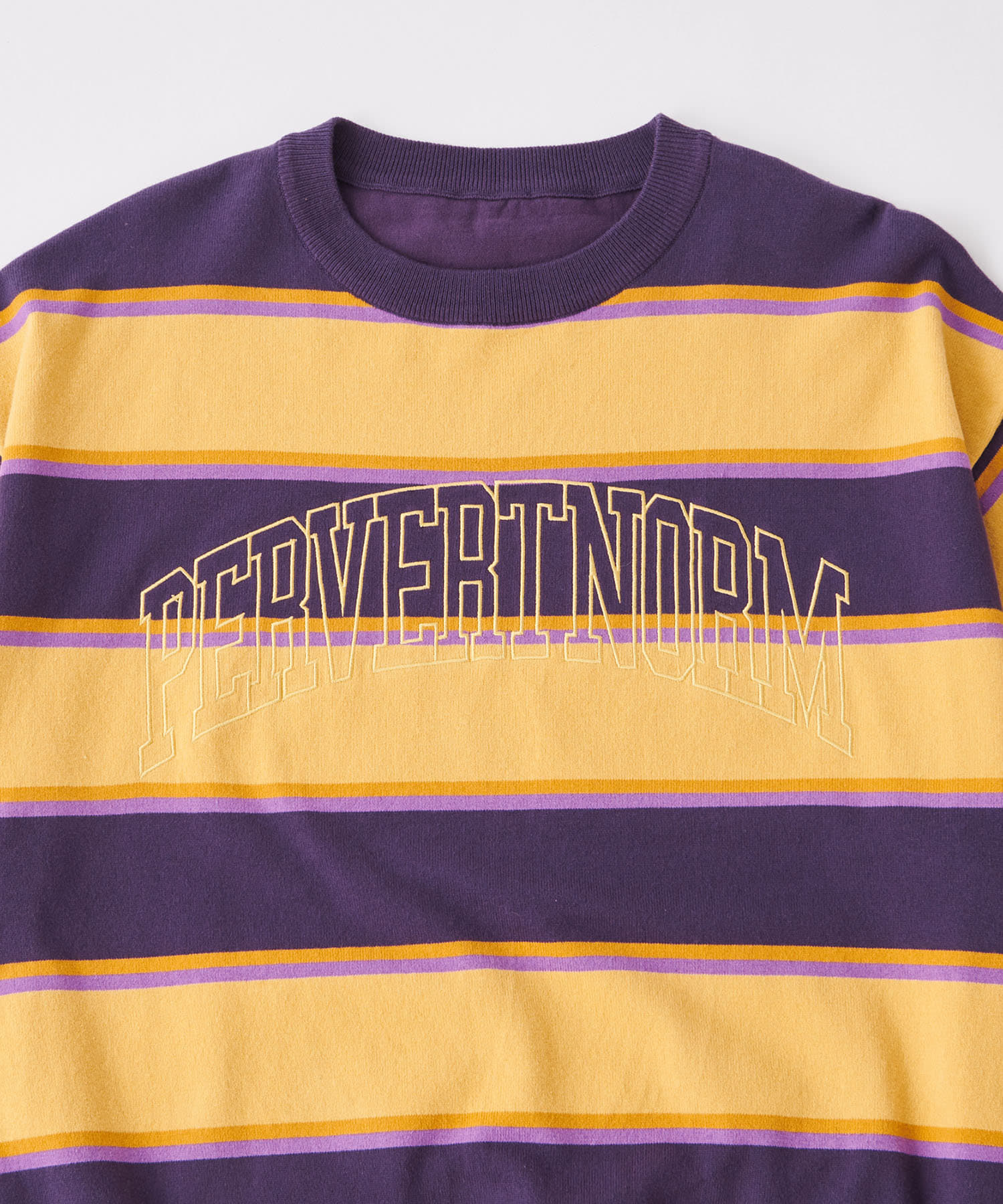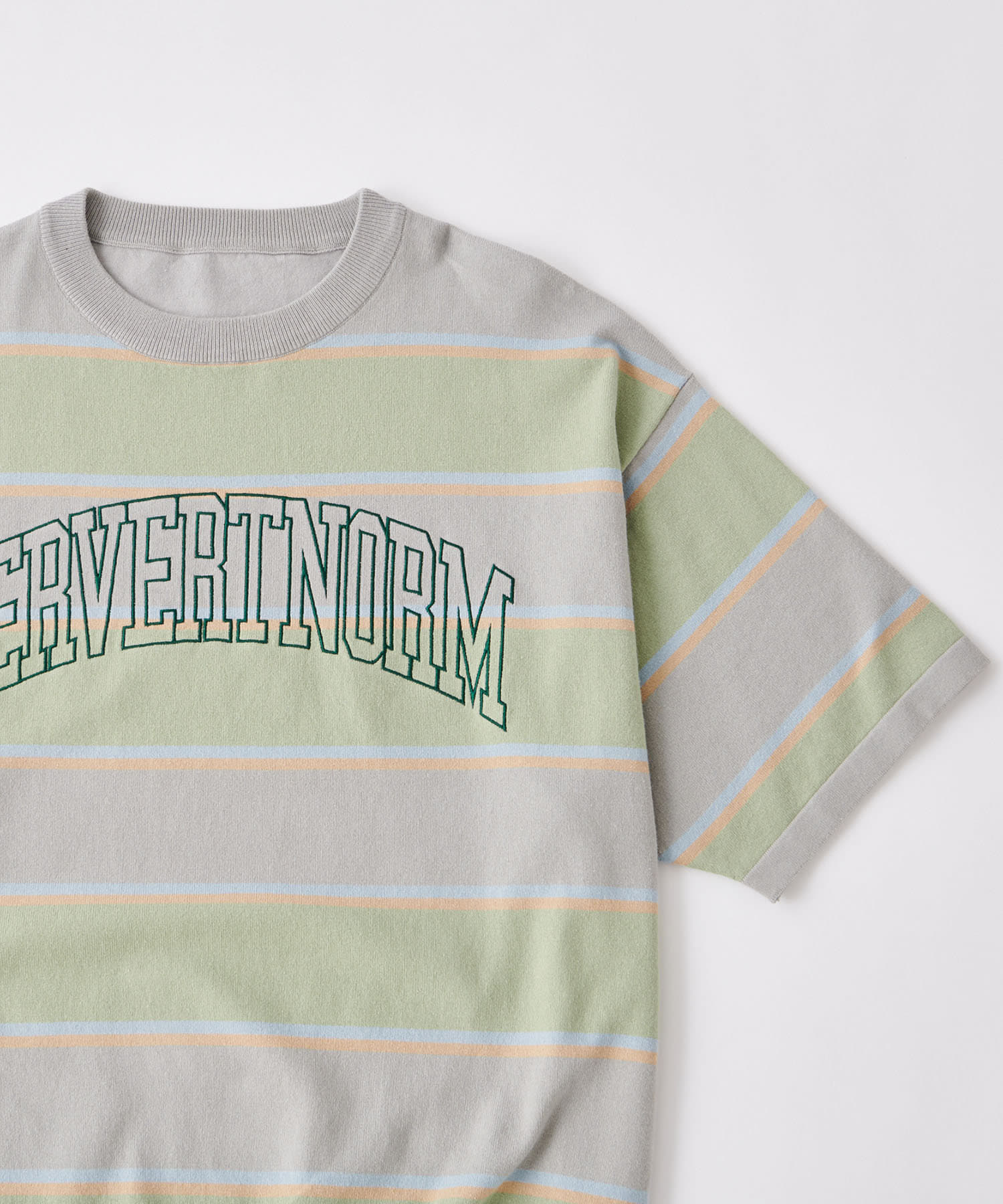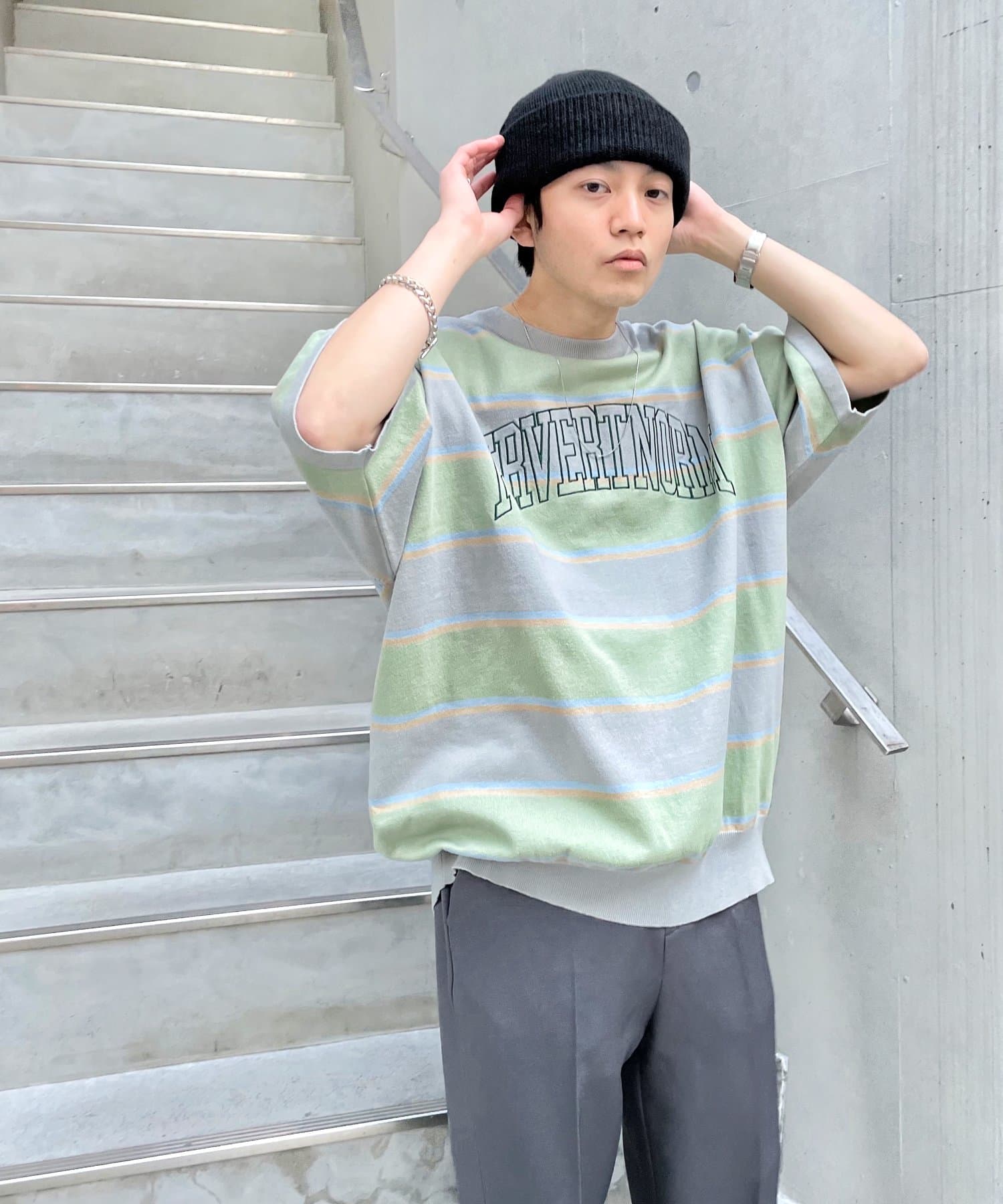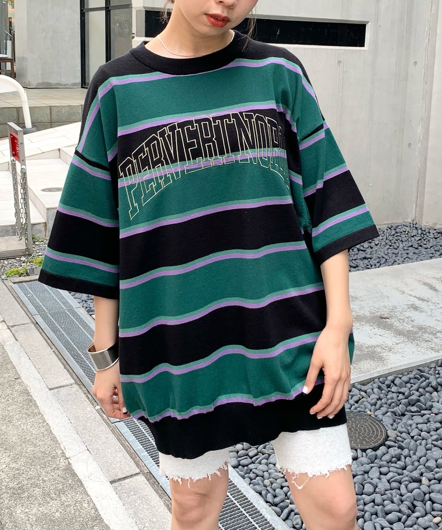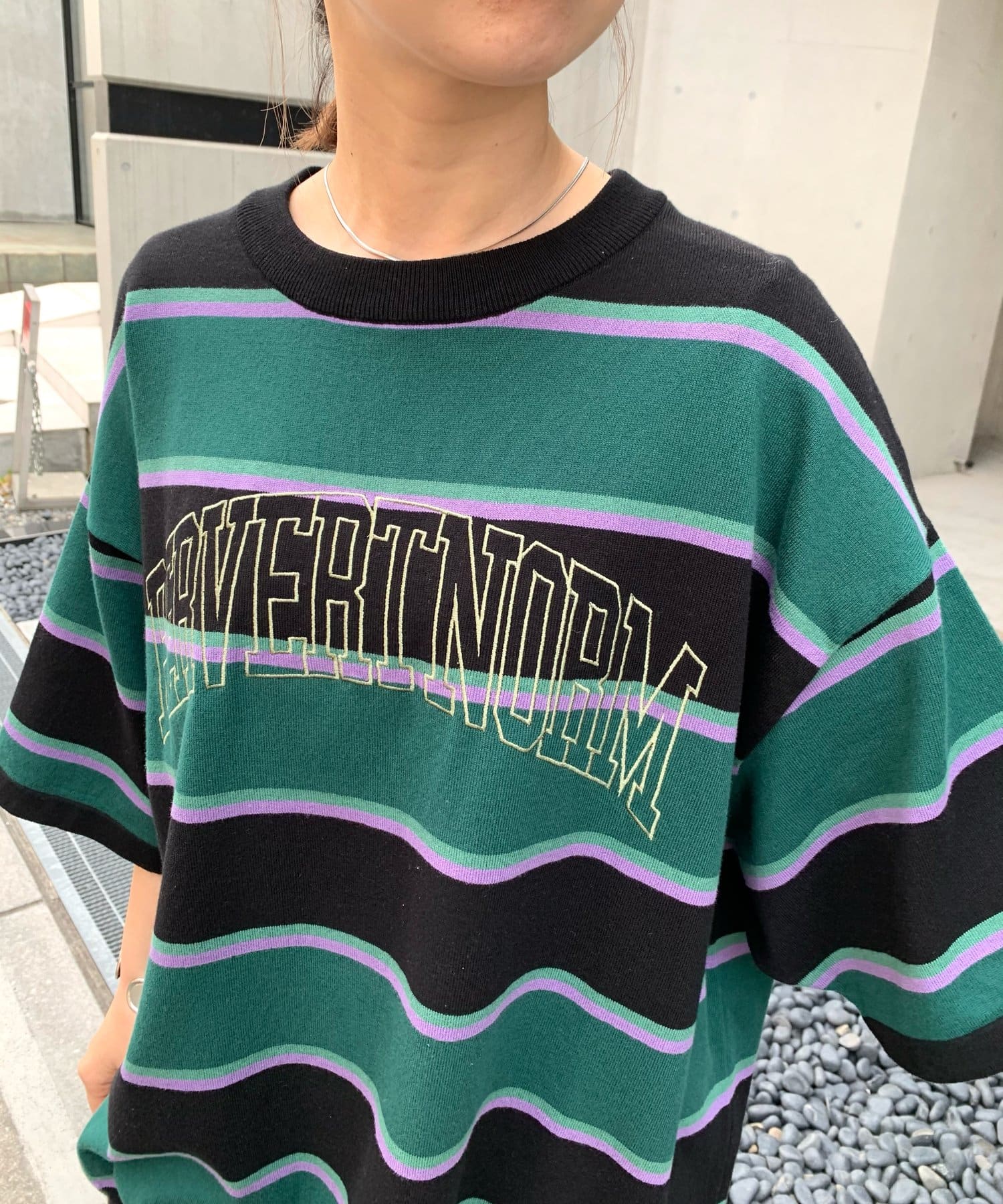 ・90年代彷彿させるレトロなボーダーとマッチする、刺繍ロゴの“PERVERTNORM”。目立ちすぎない存在感がコーデの雰囲気と相性もバツグン◎