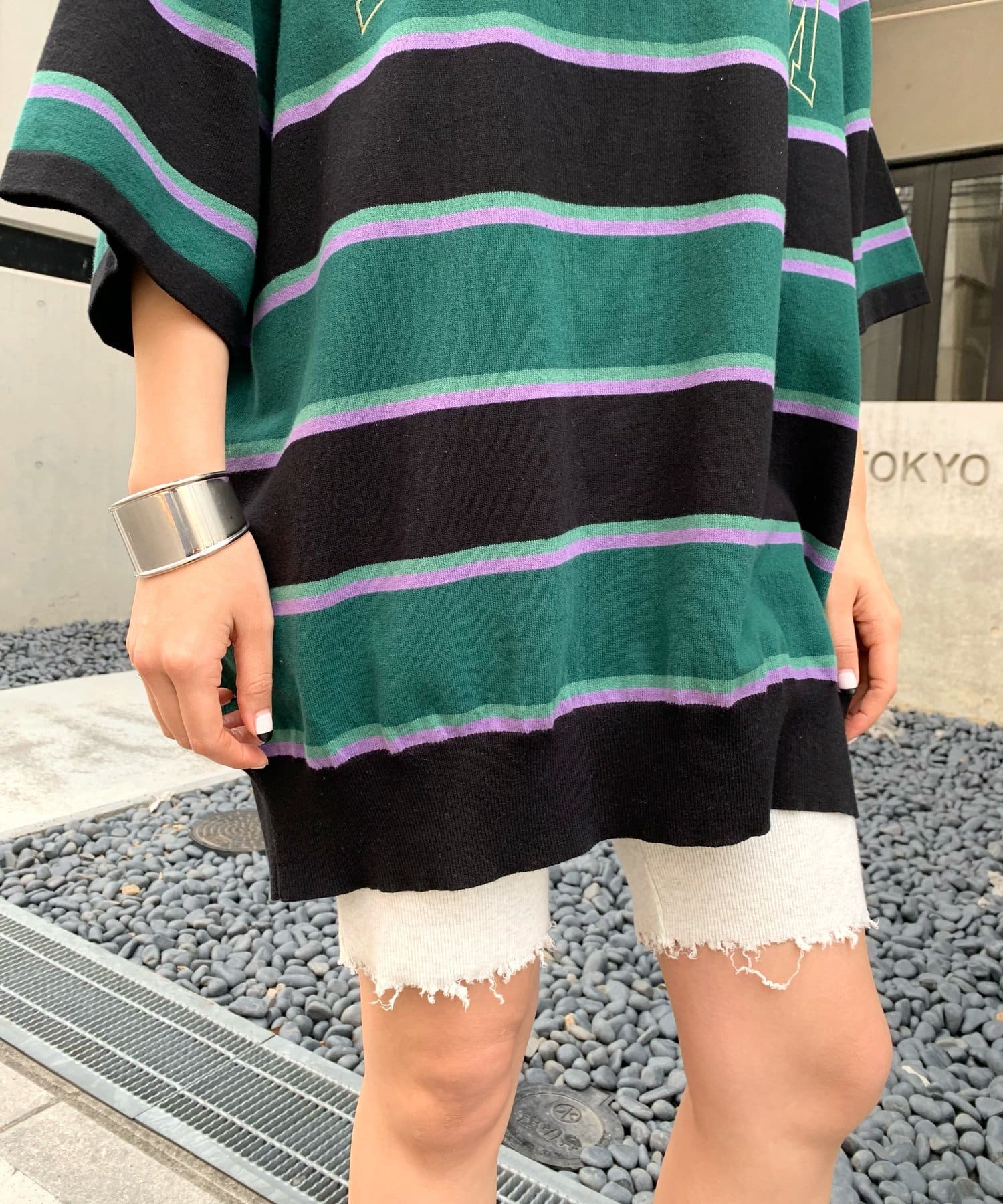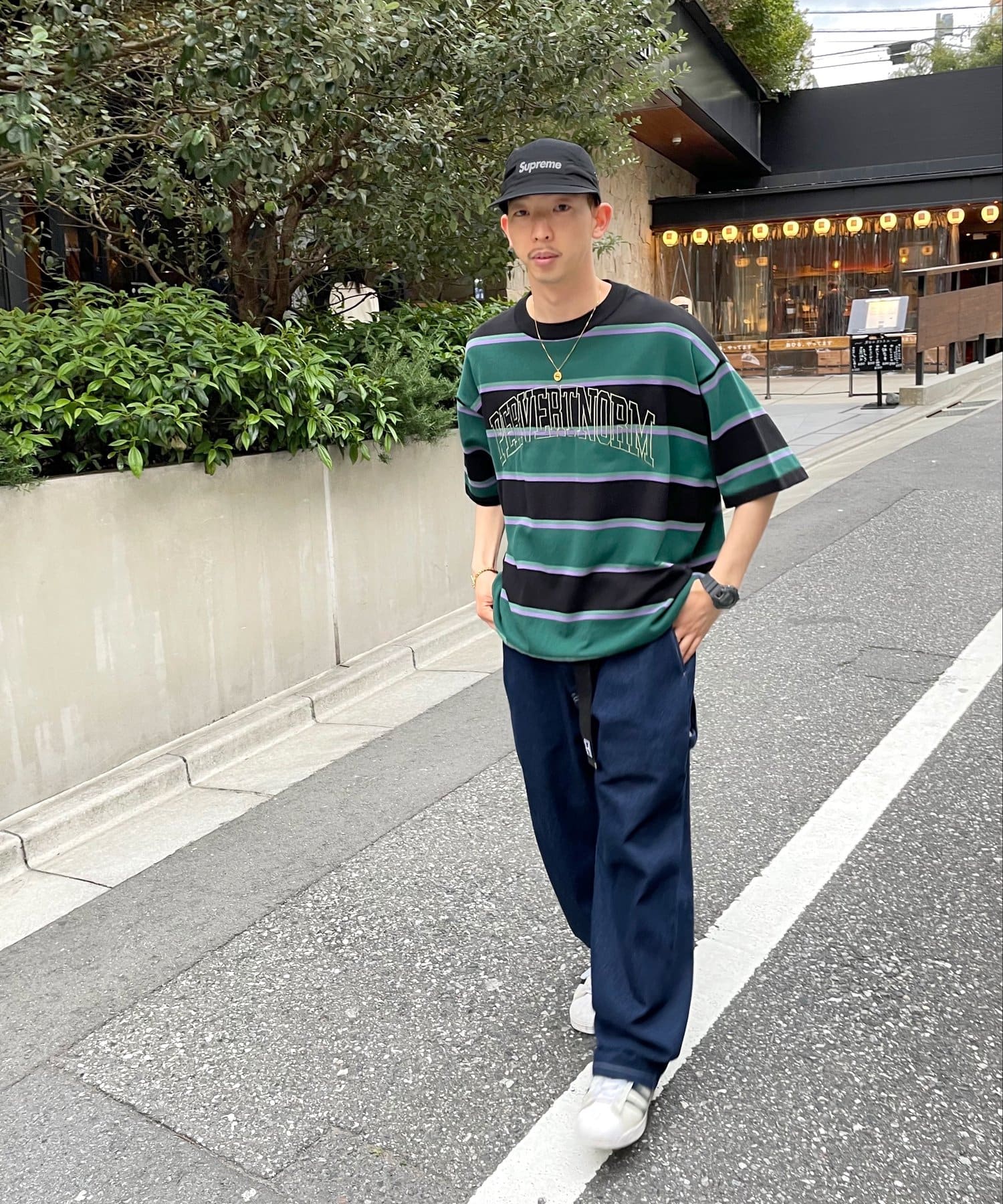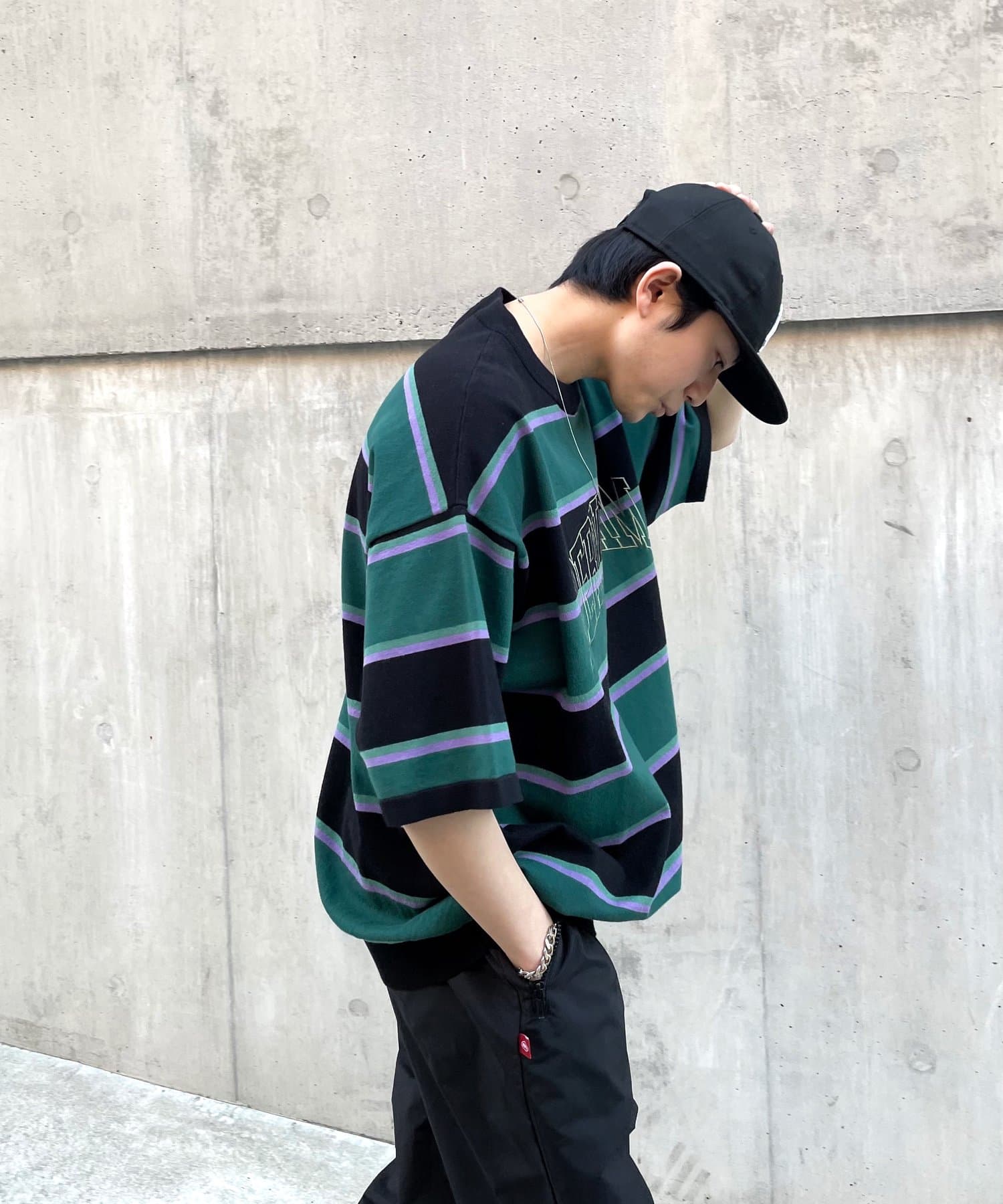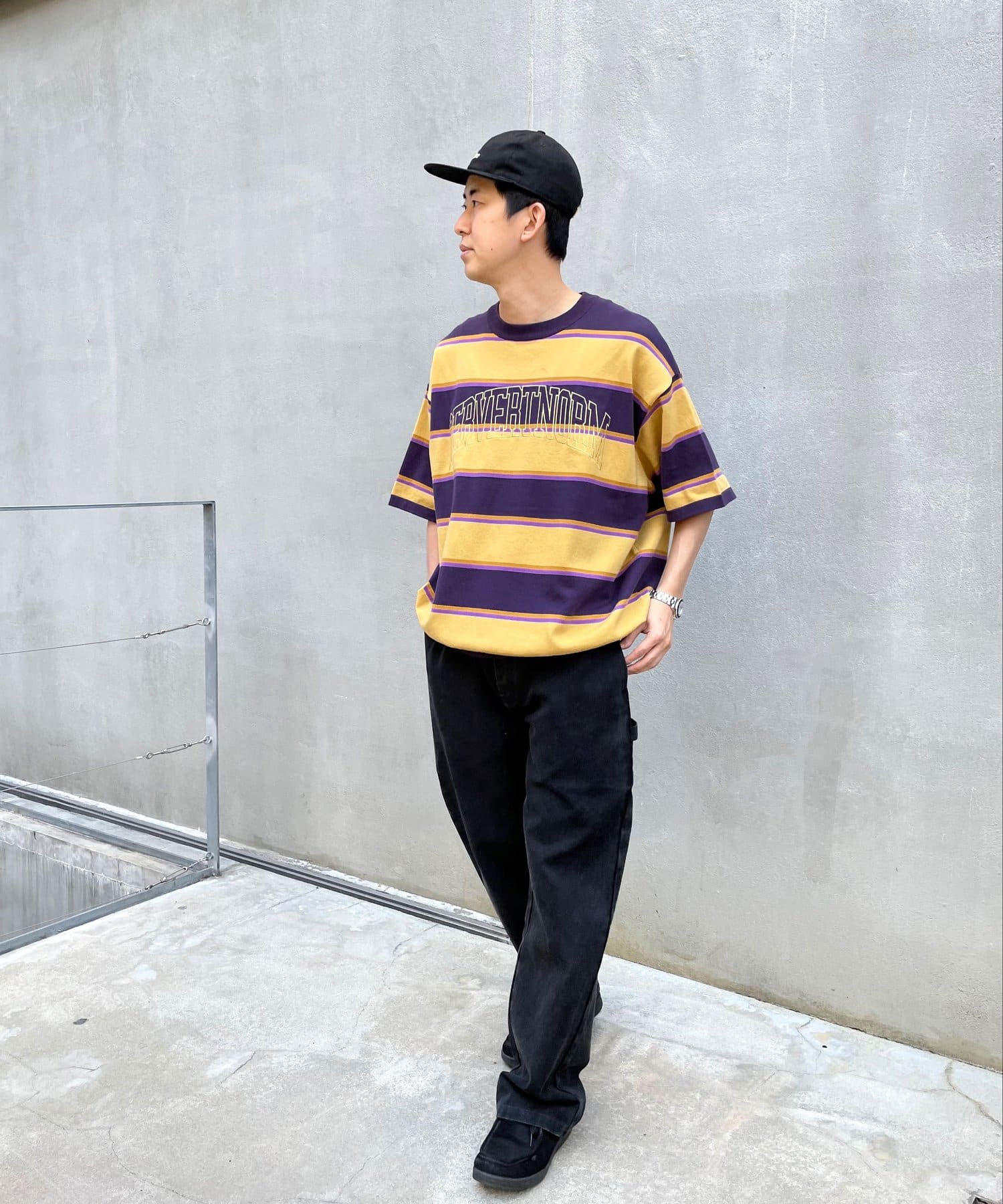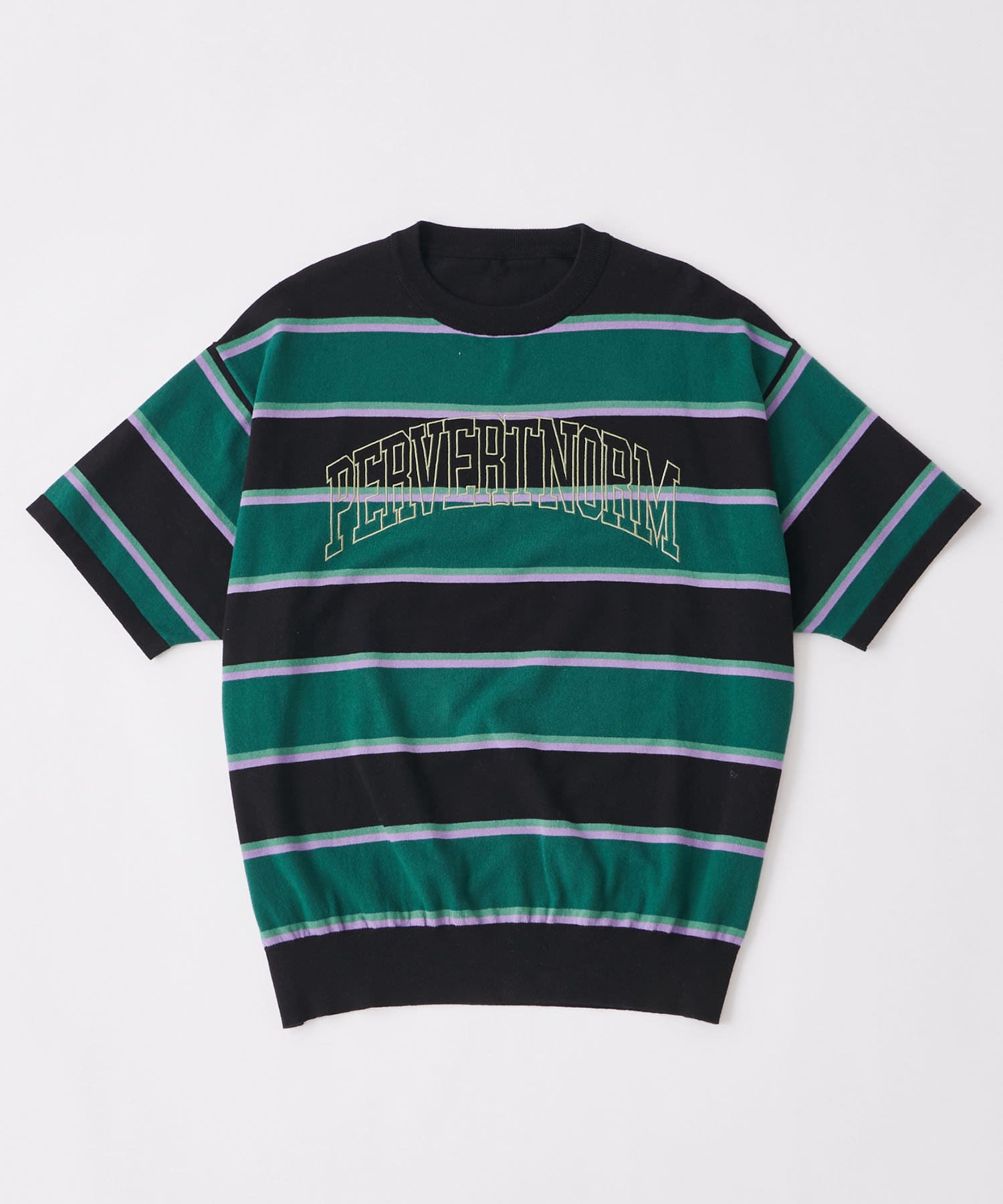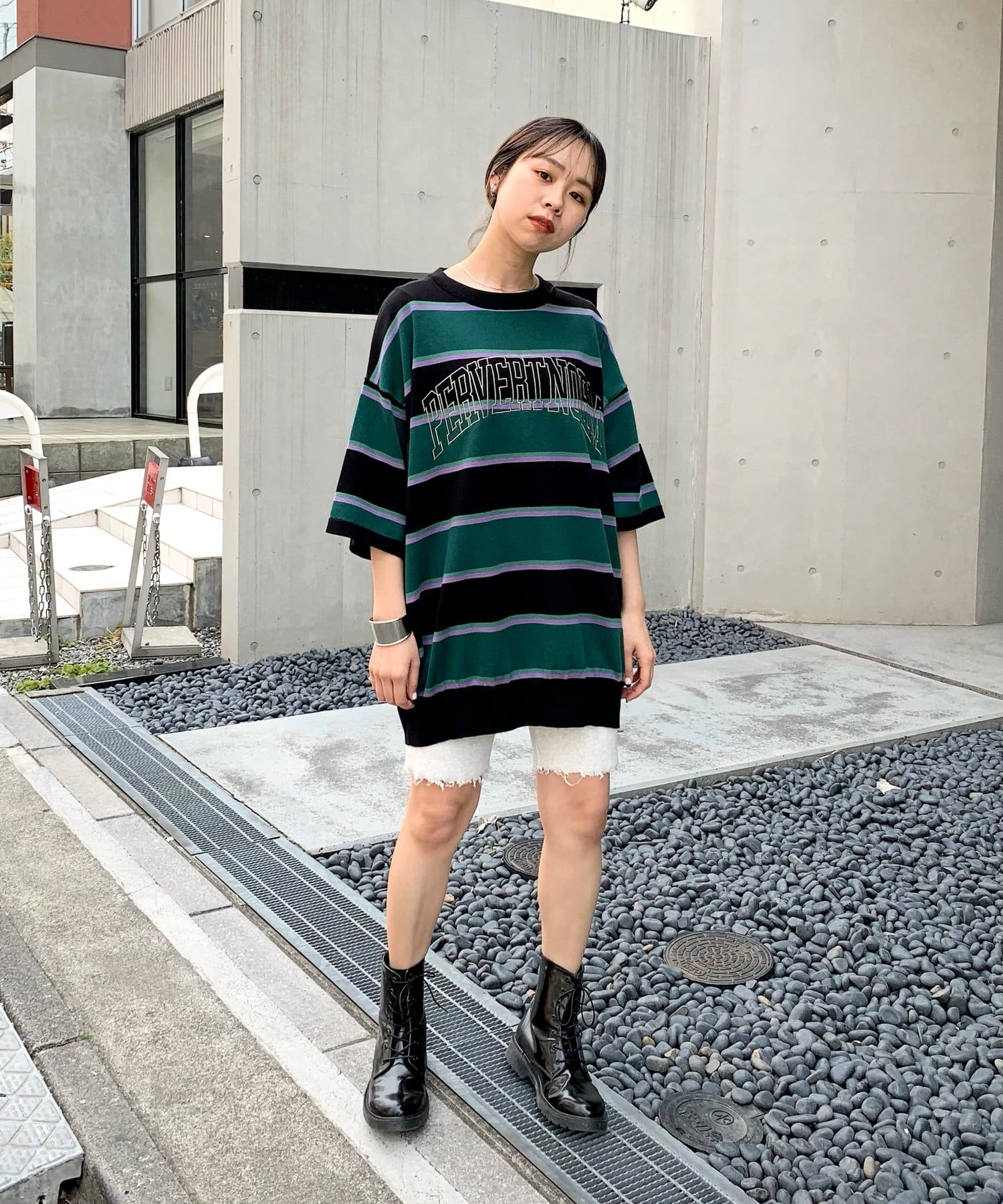 ・90年代彷彿させるレトロなボーダーとマッチする、刺繍ロゴの“PERVERTNORM”。目立ちすぎない存在感がコーデの雰囲気と相性もバツグン◎