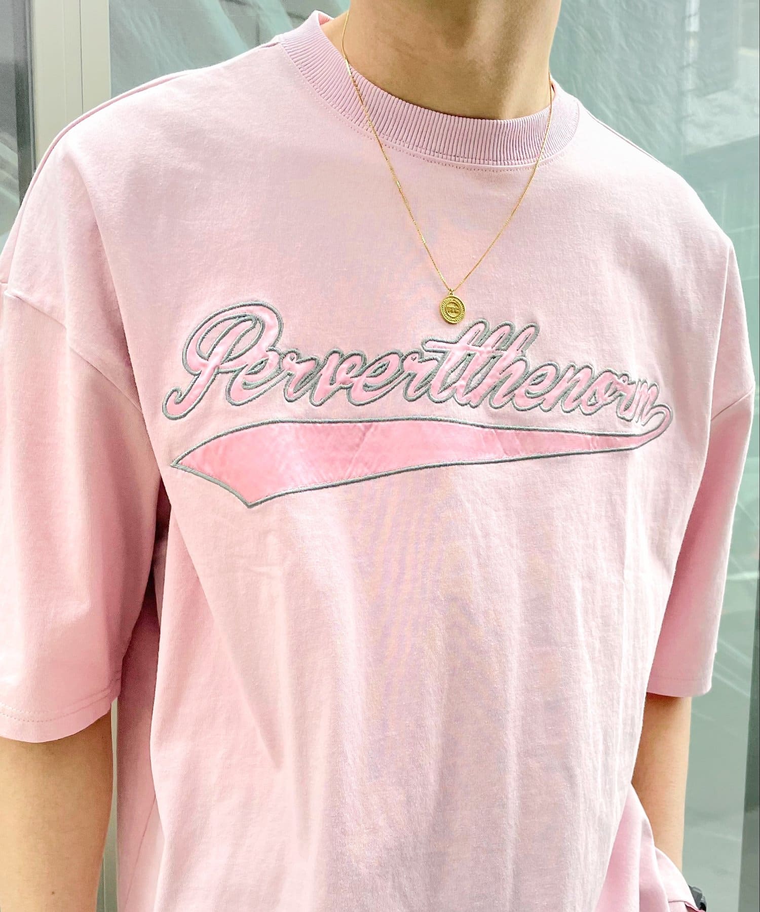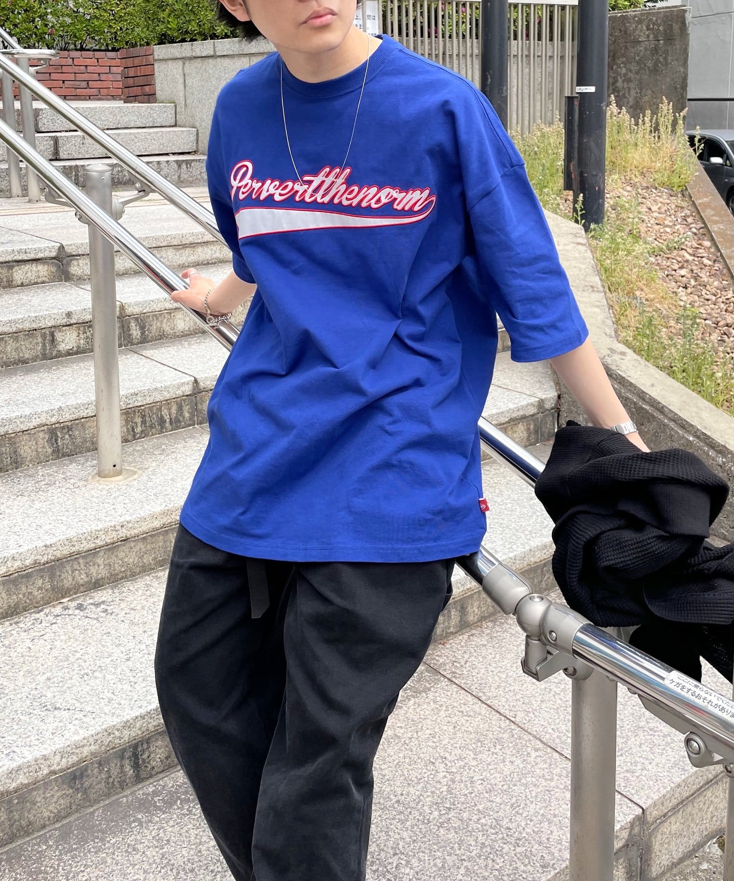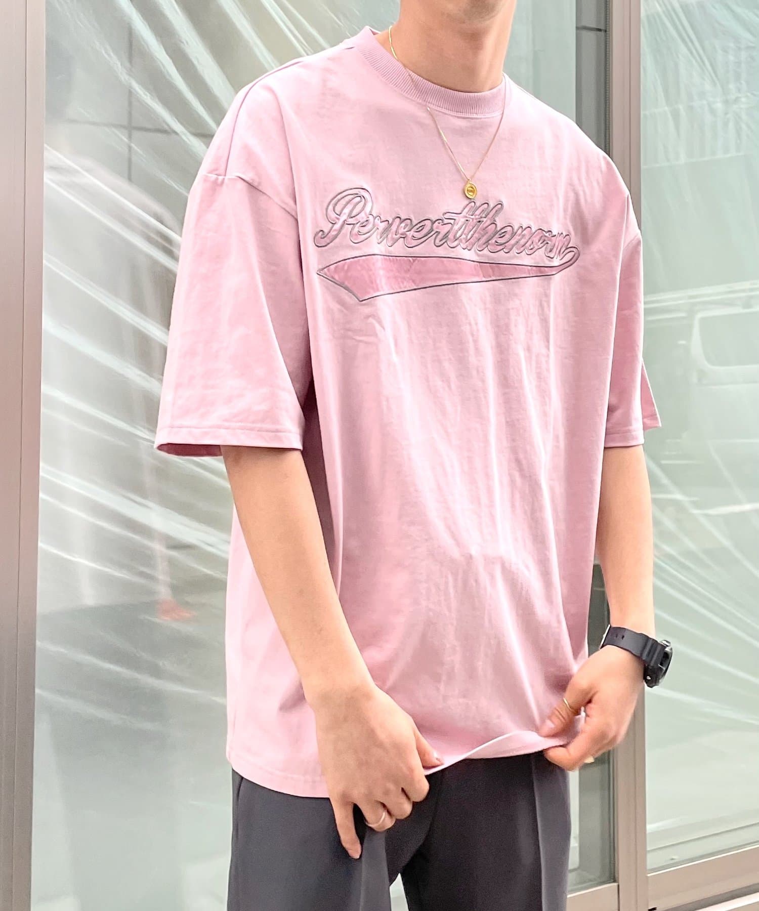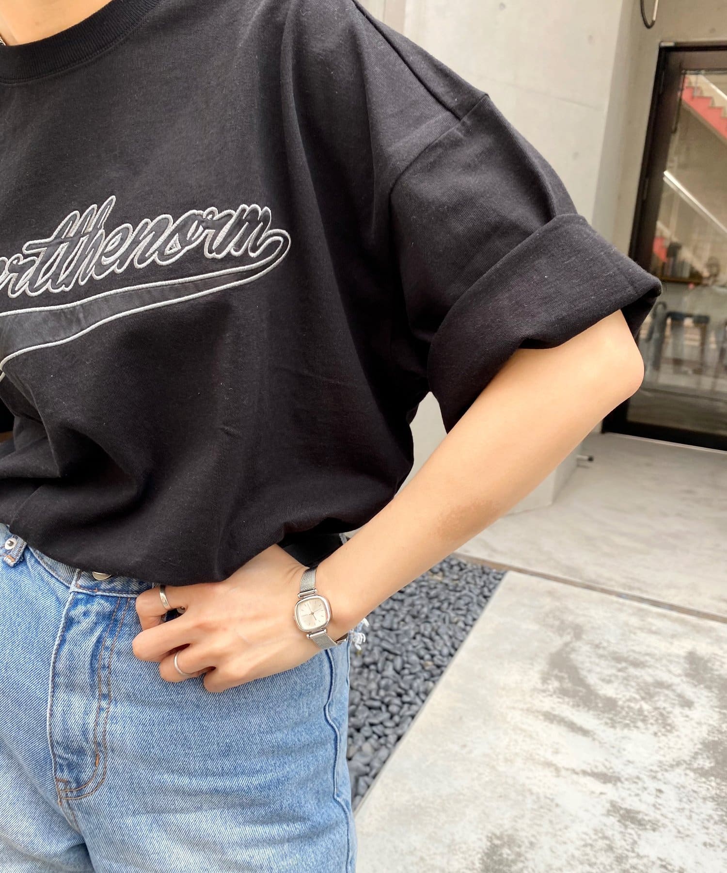 ・身頃に馴染むカラーのロゴは、一枚着でも存在感がありながら、柄物と合わせても程よいマッチ感。