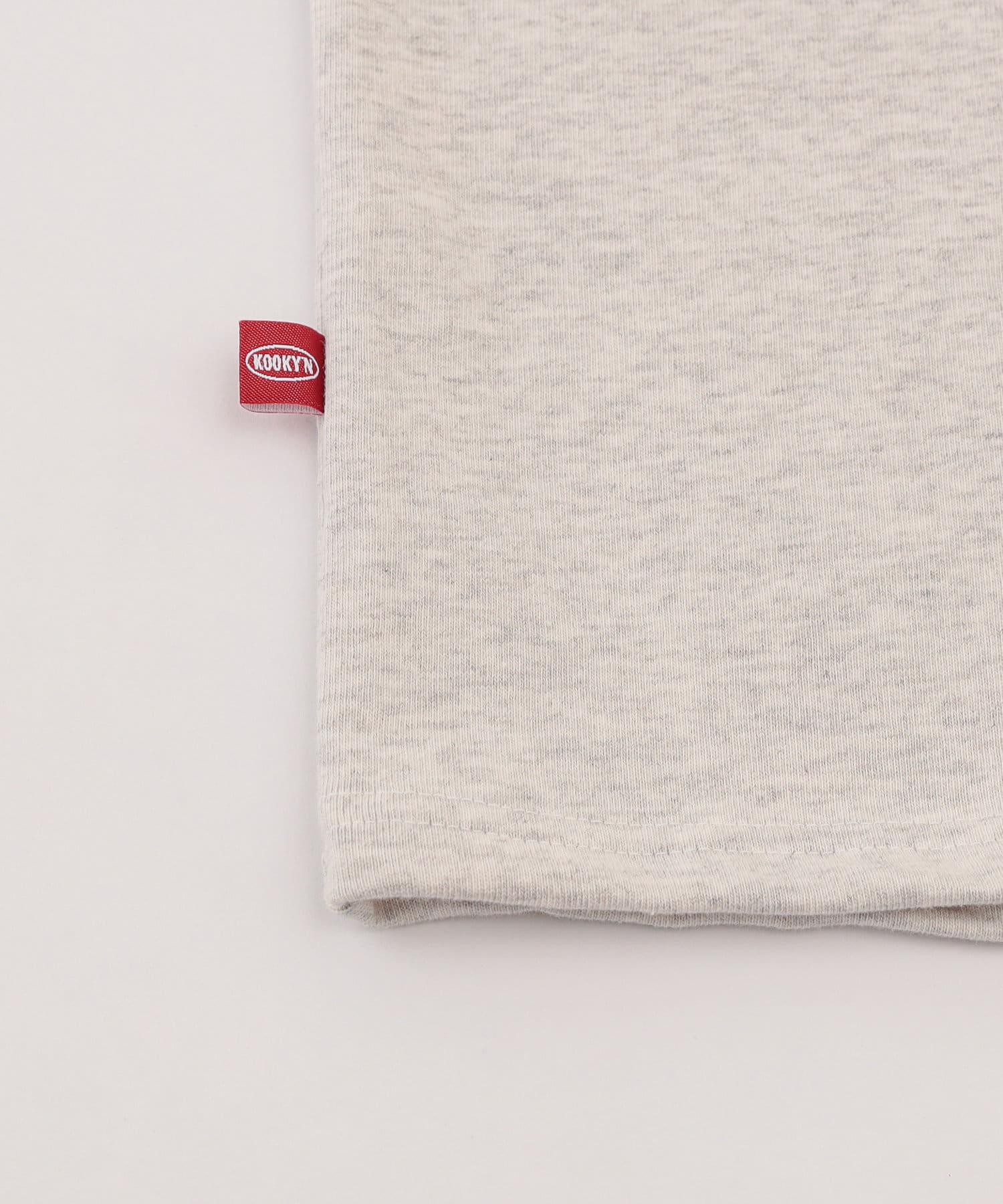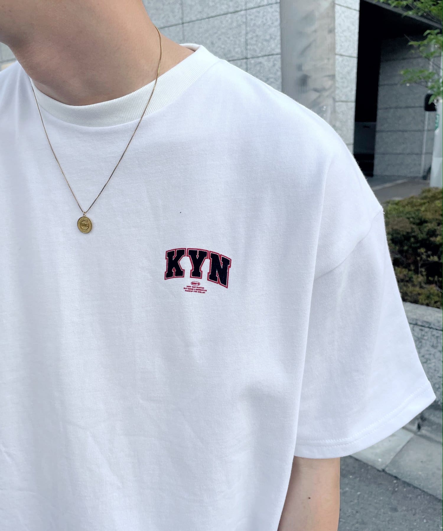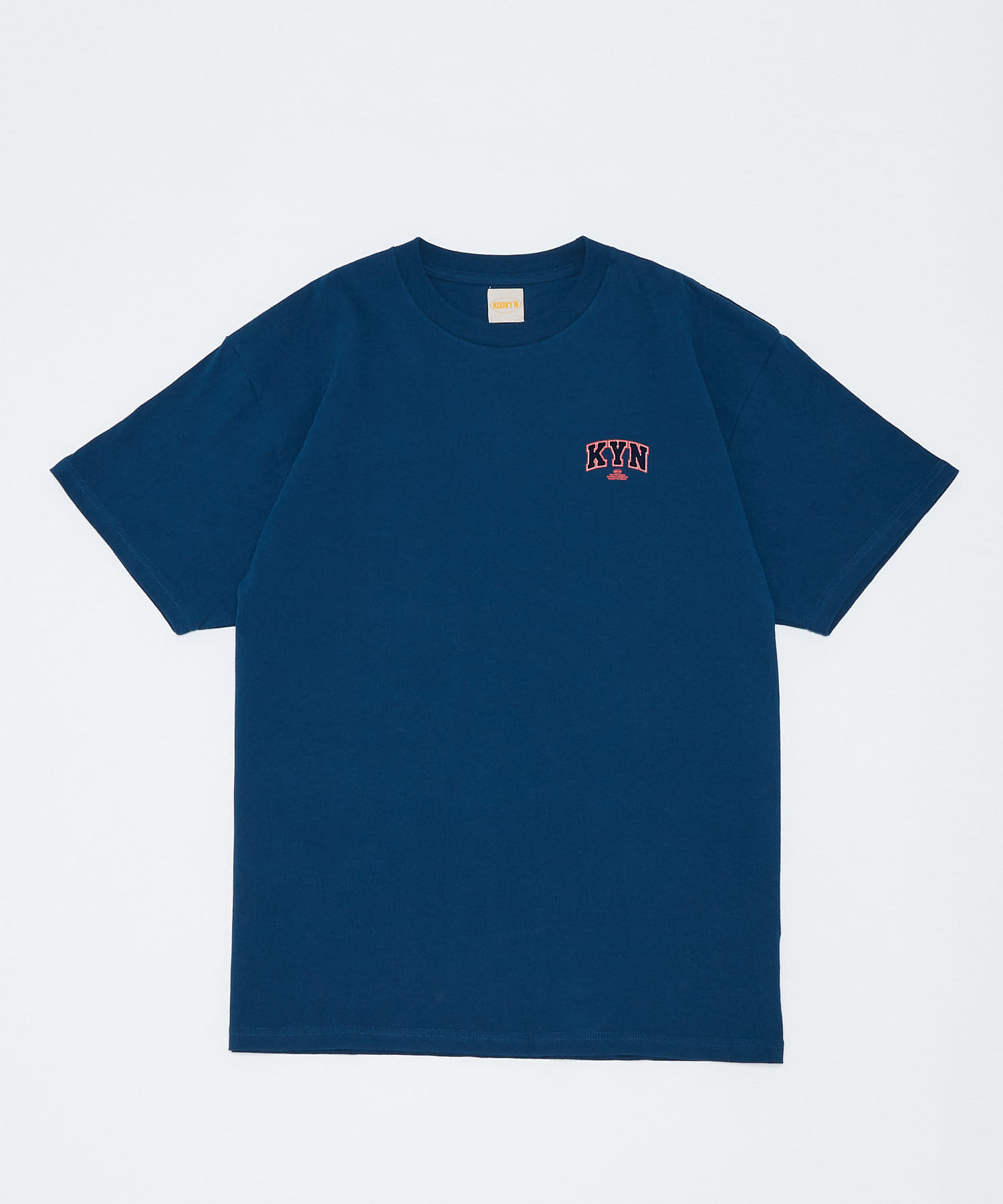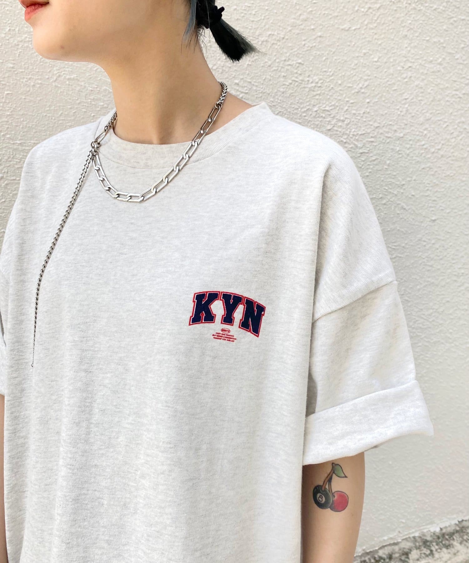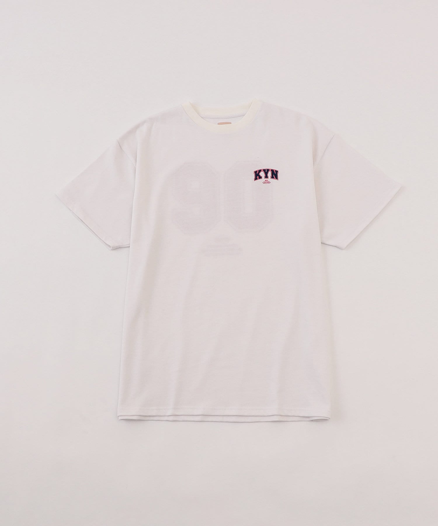 ・胸元の“KYN”ロゴはフロッキープリントで表現。少し立体的で、ボディーとは異なる触り心地なので、一枚着でもしっかり見えます。