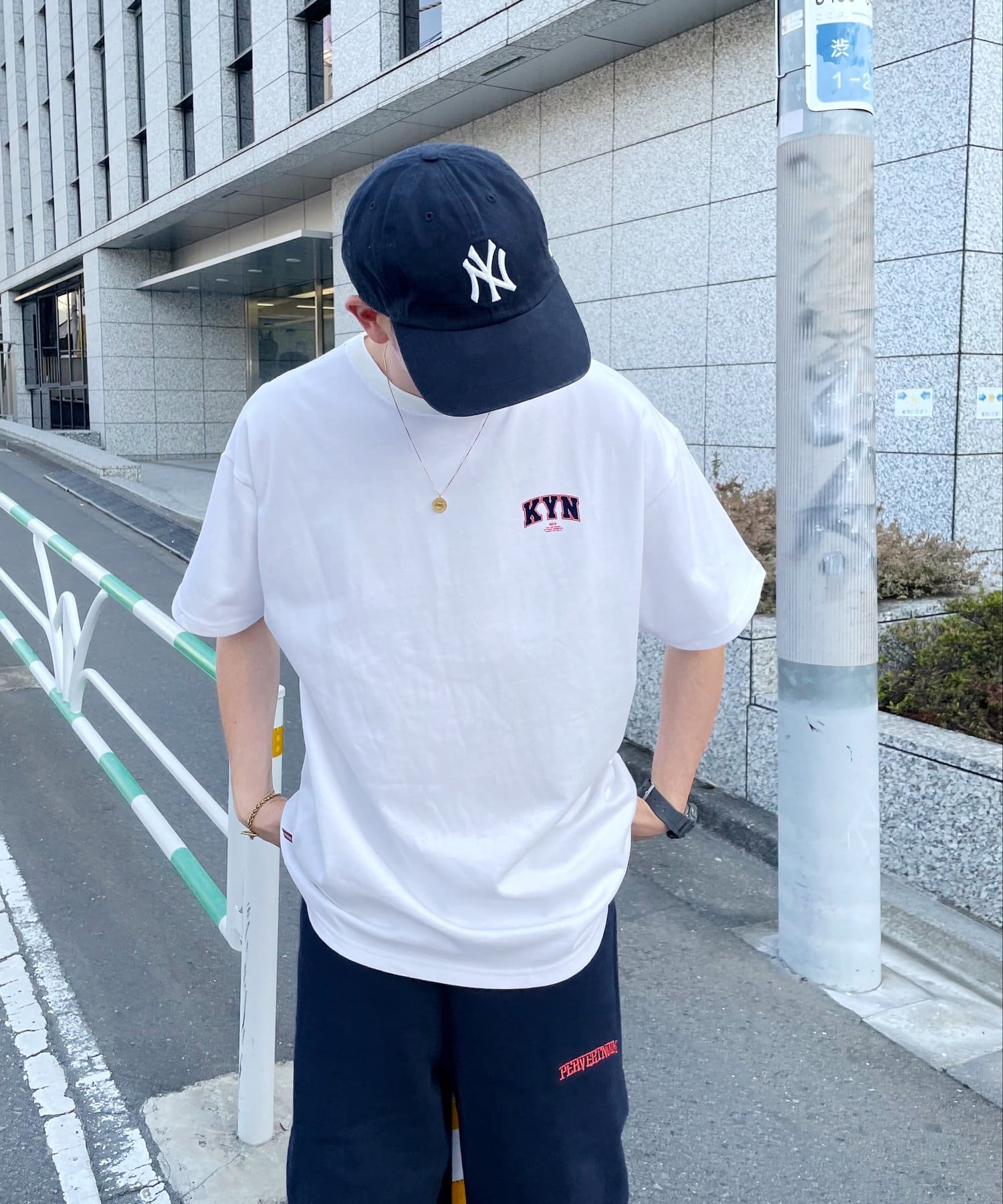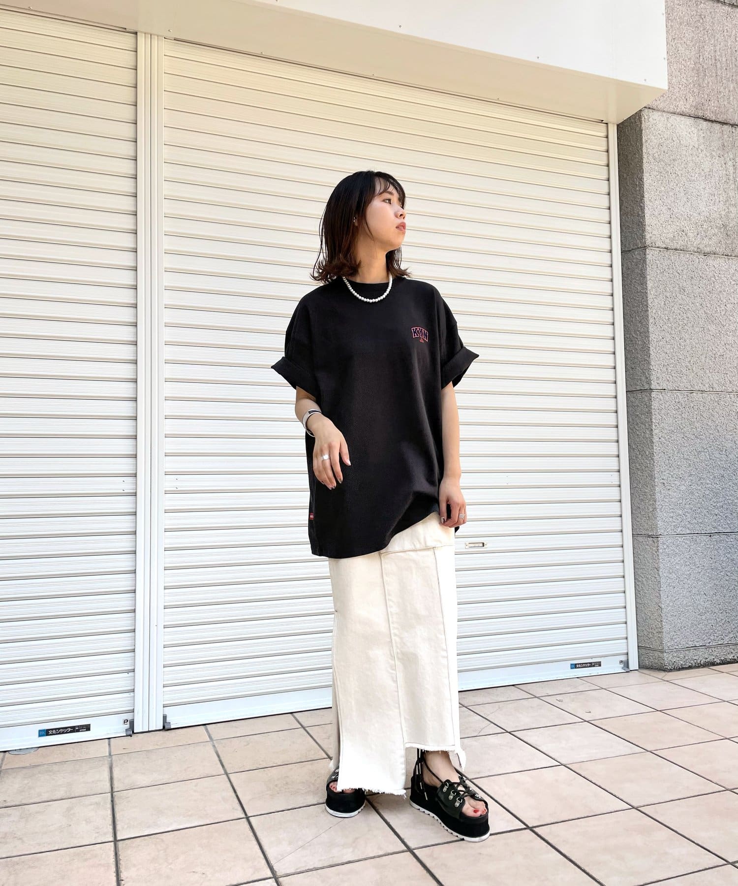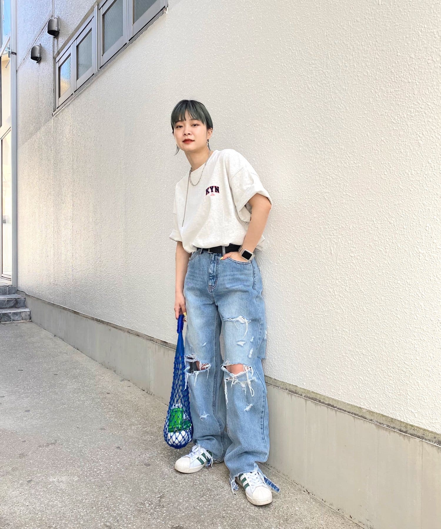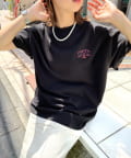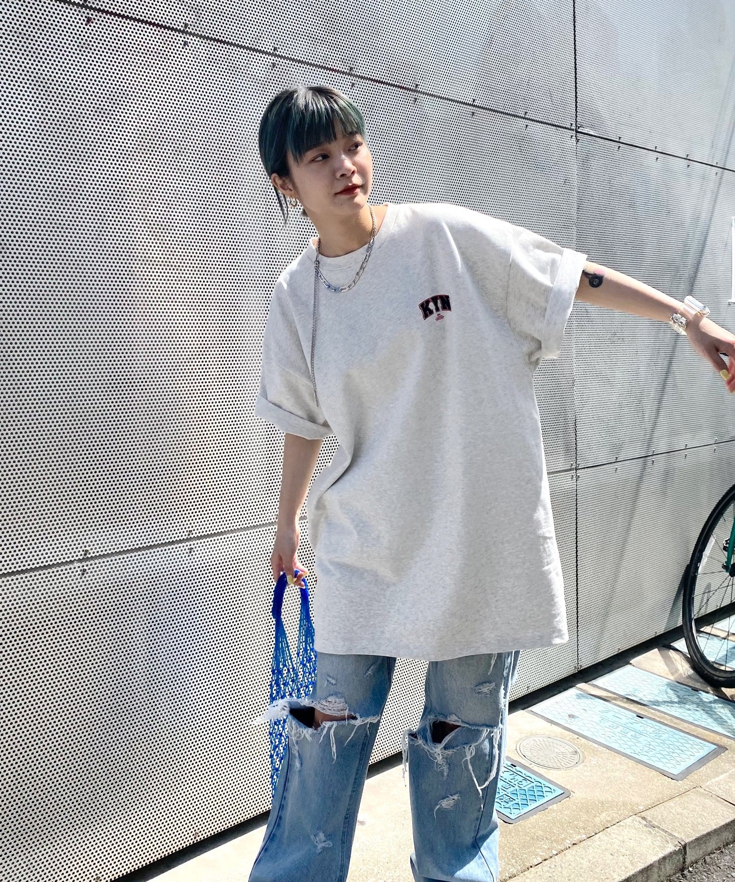 ・胸元の“KYN”ロゴはフロッキープリントで表現。少し立体的で、ボディーとは異なる触り心地なので、一枚着でもしっかり見えます。