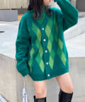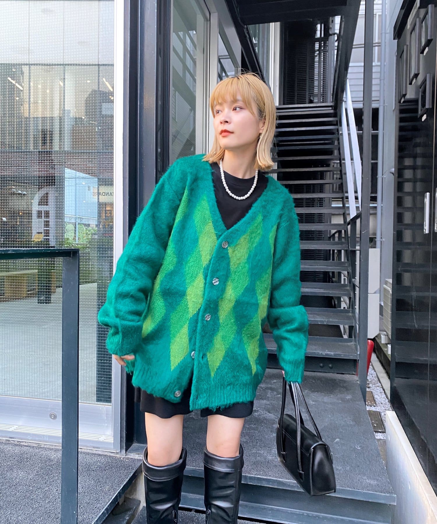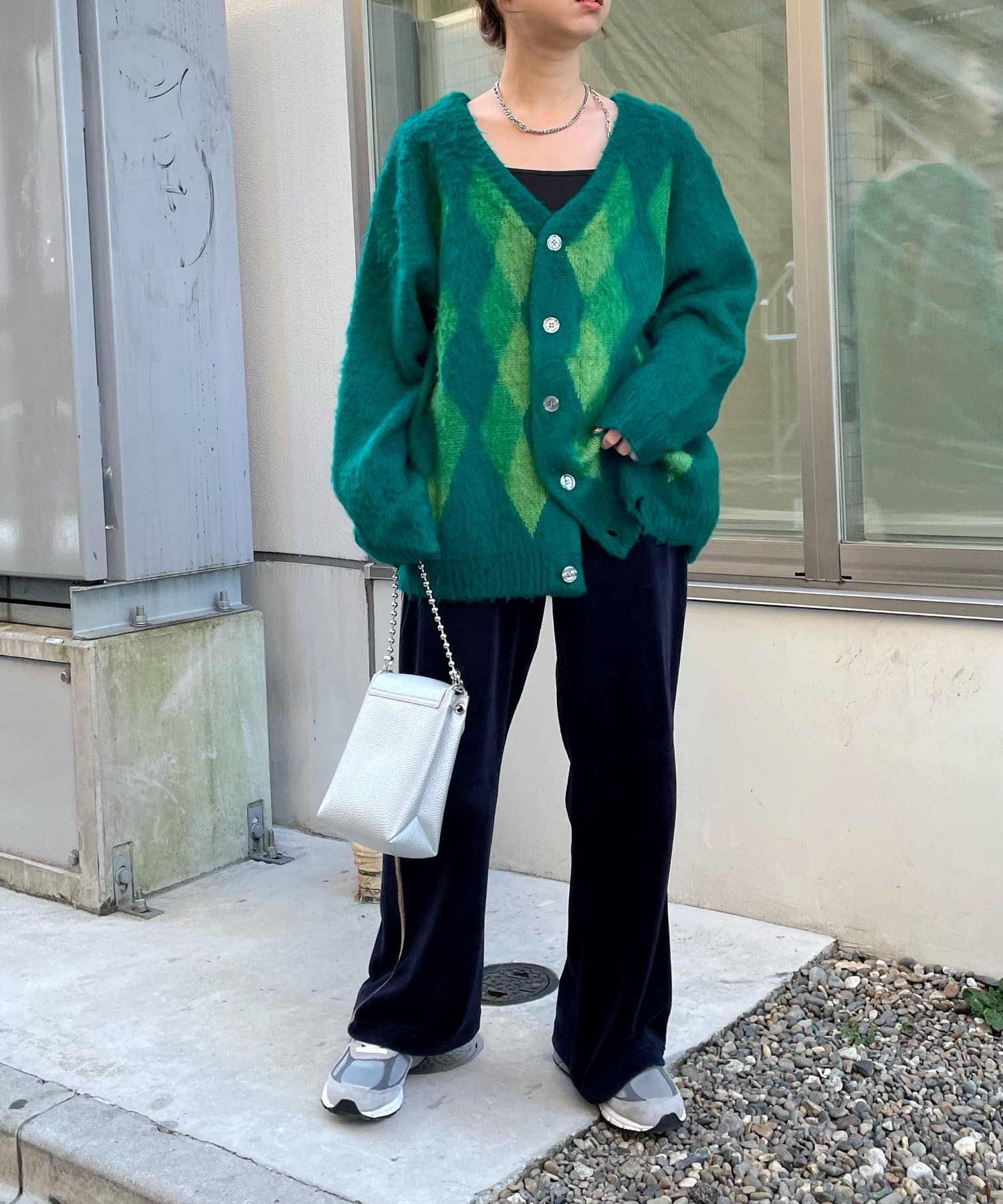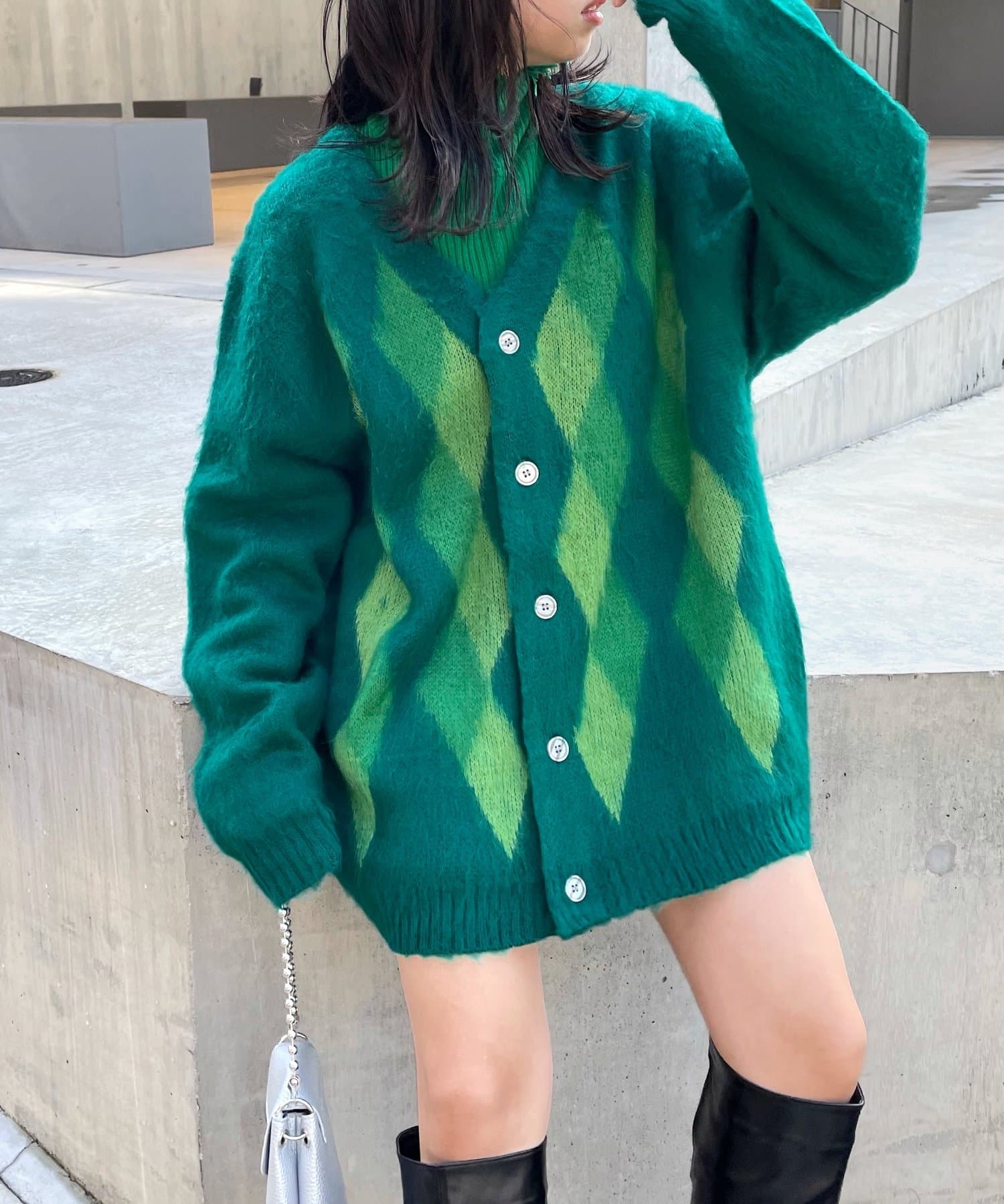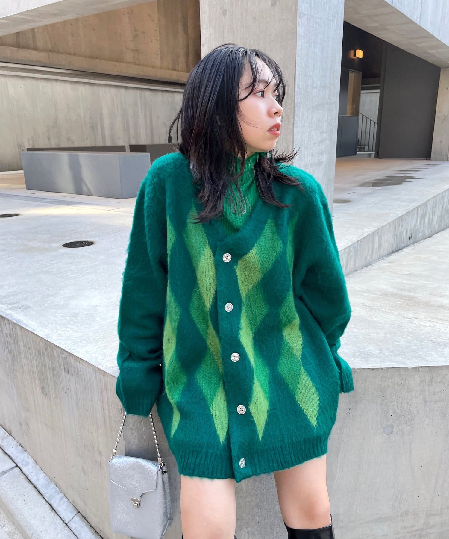 ・上品で知的に見えるアーガイル柄をビッグシルエットのカーディガンに施し、カジュアル感をプラス。
