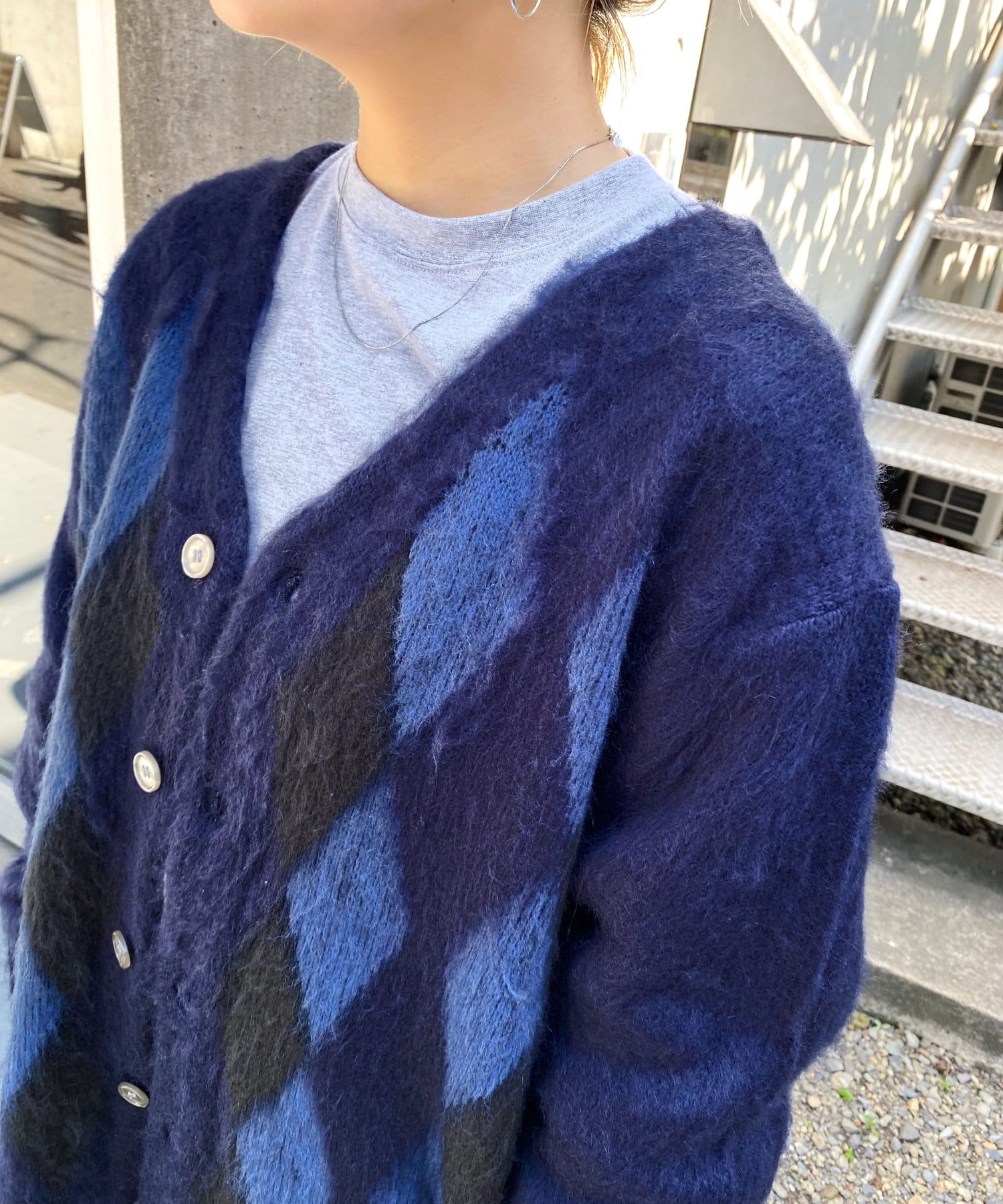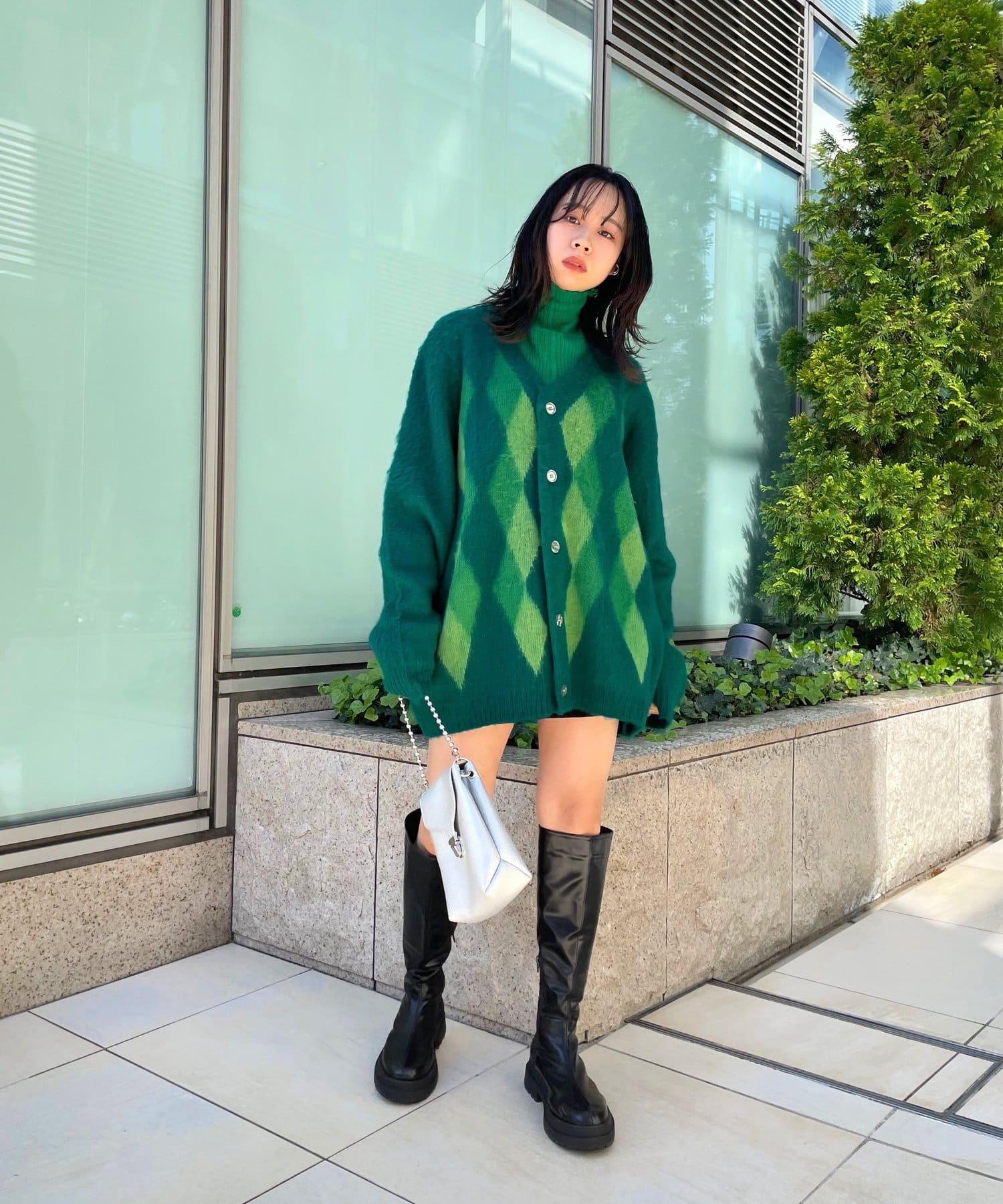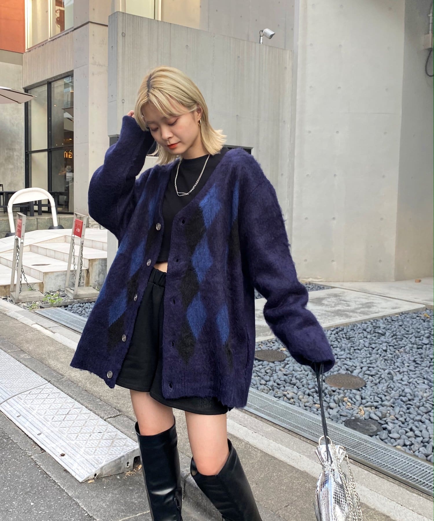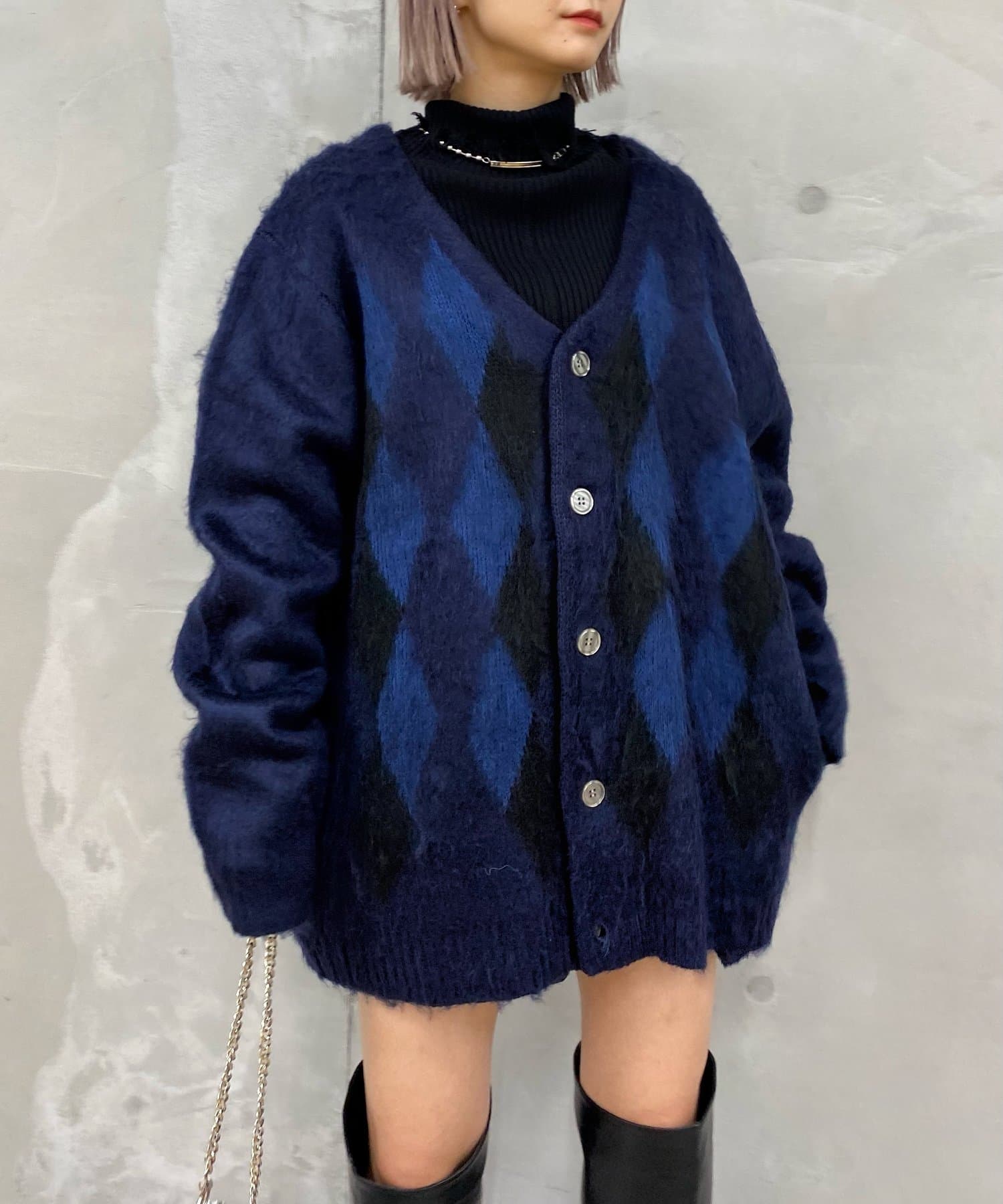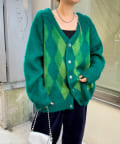 ・上品で知的に見えるアーガイル柄をビッグシルエットのカーディガンに施し、カジュアル感をプラス。