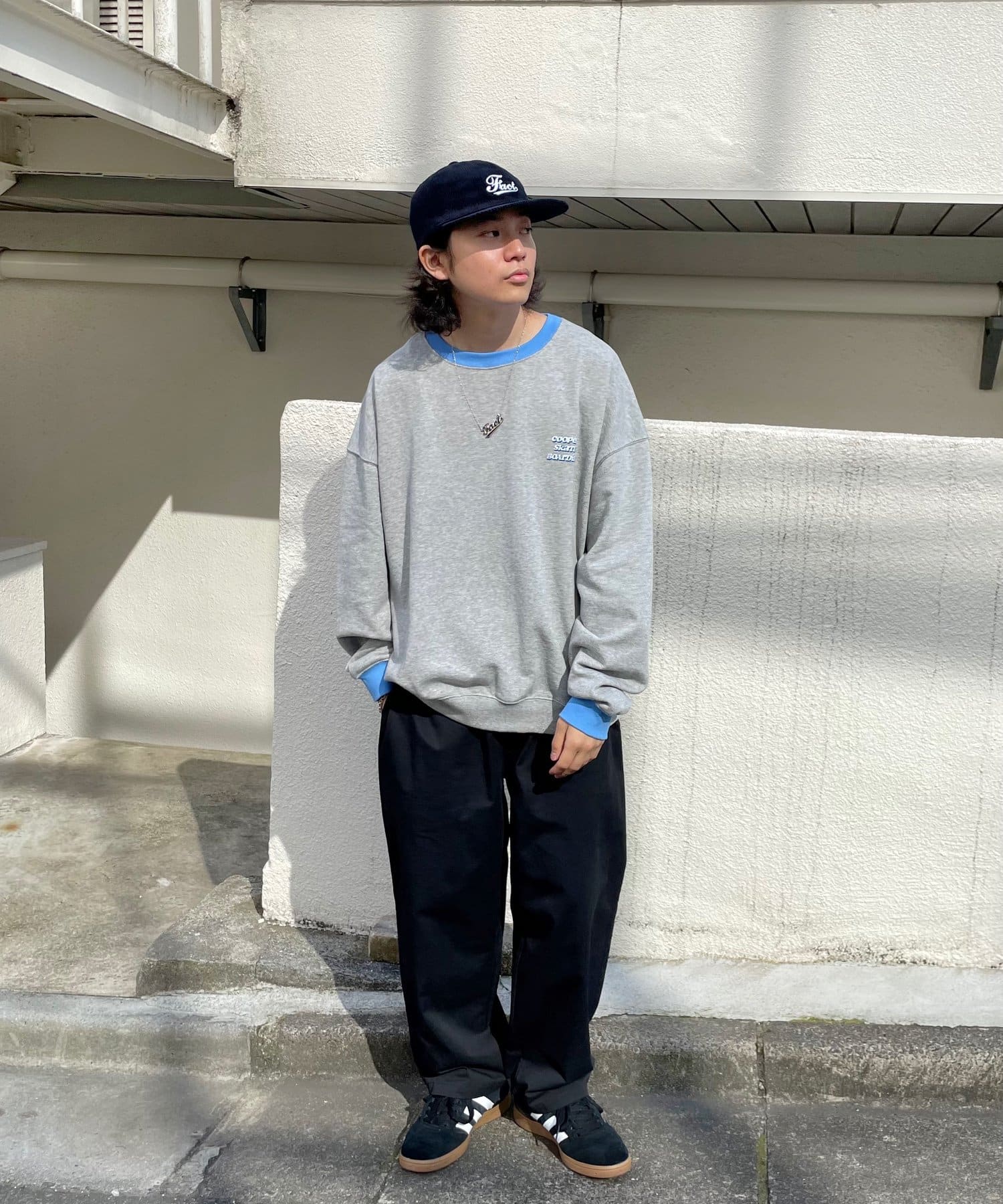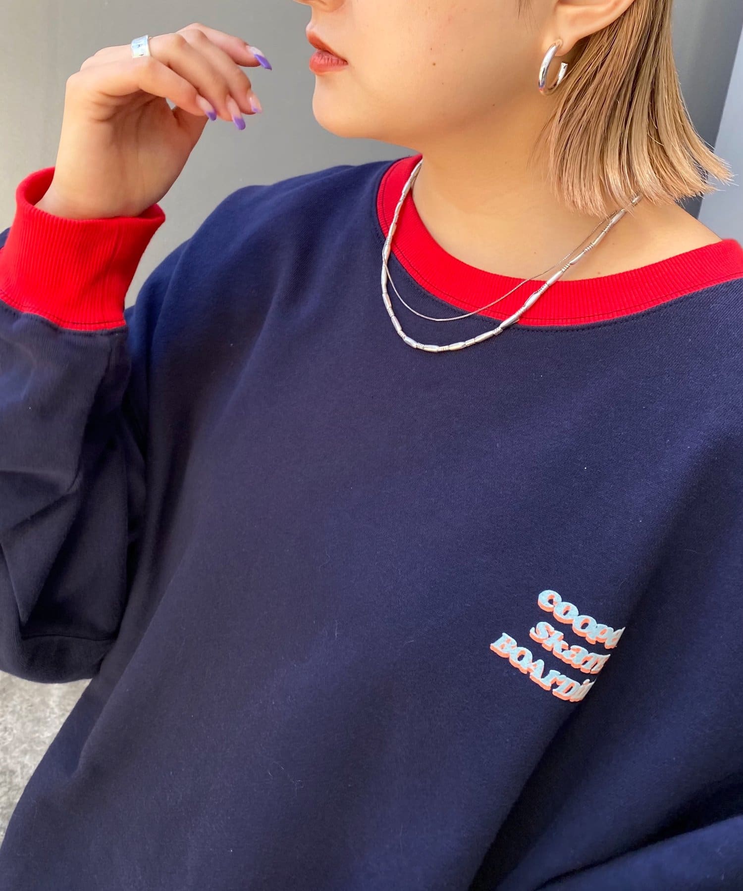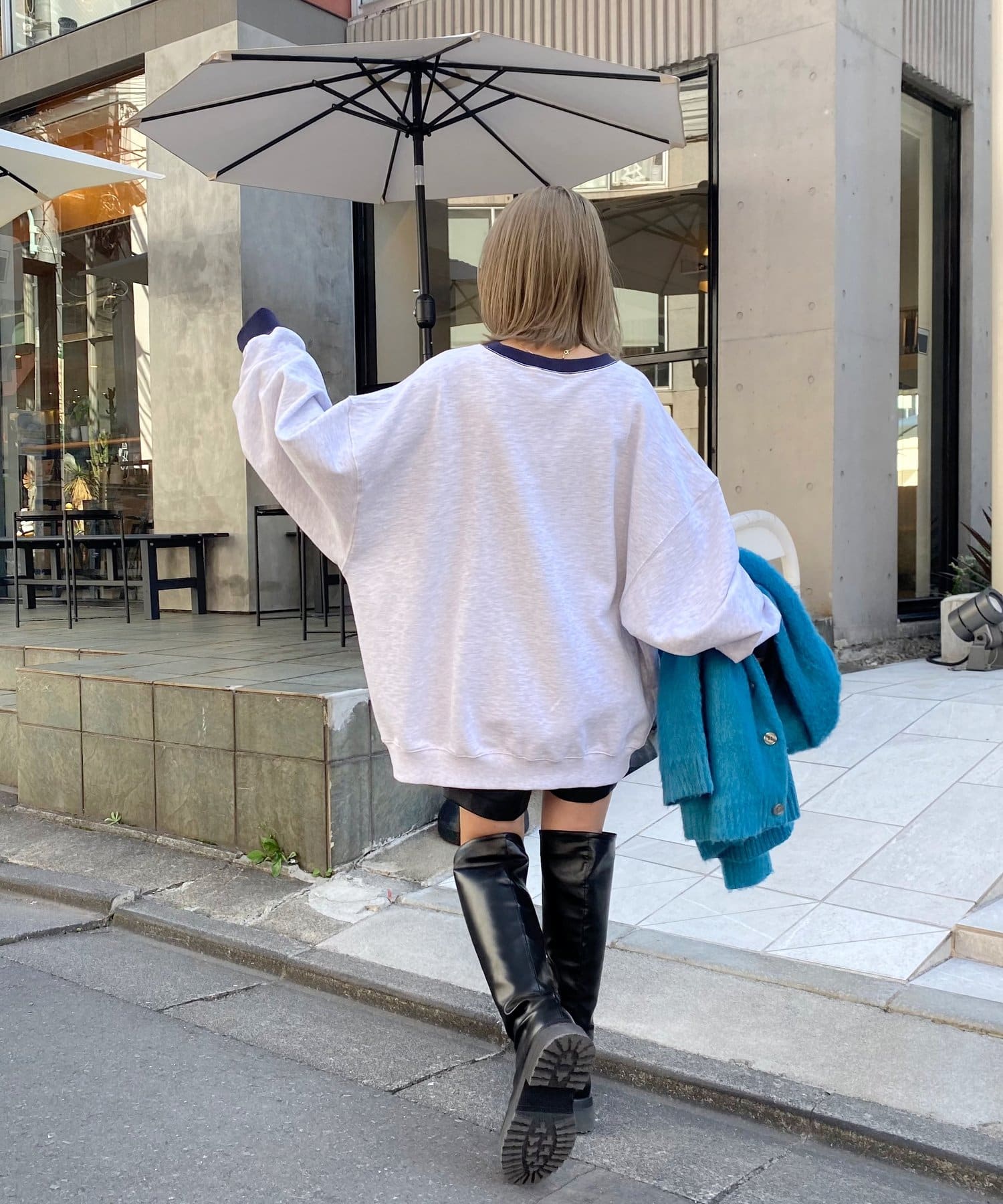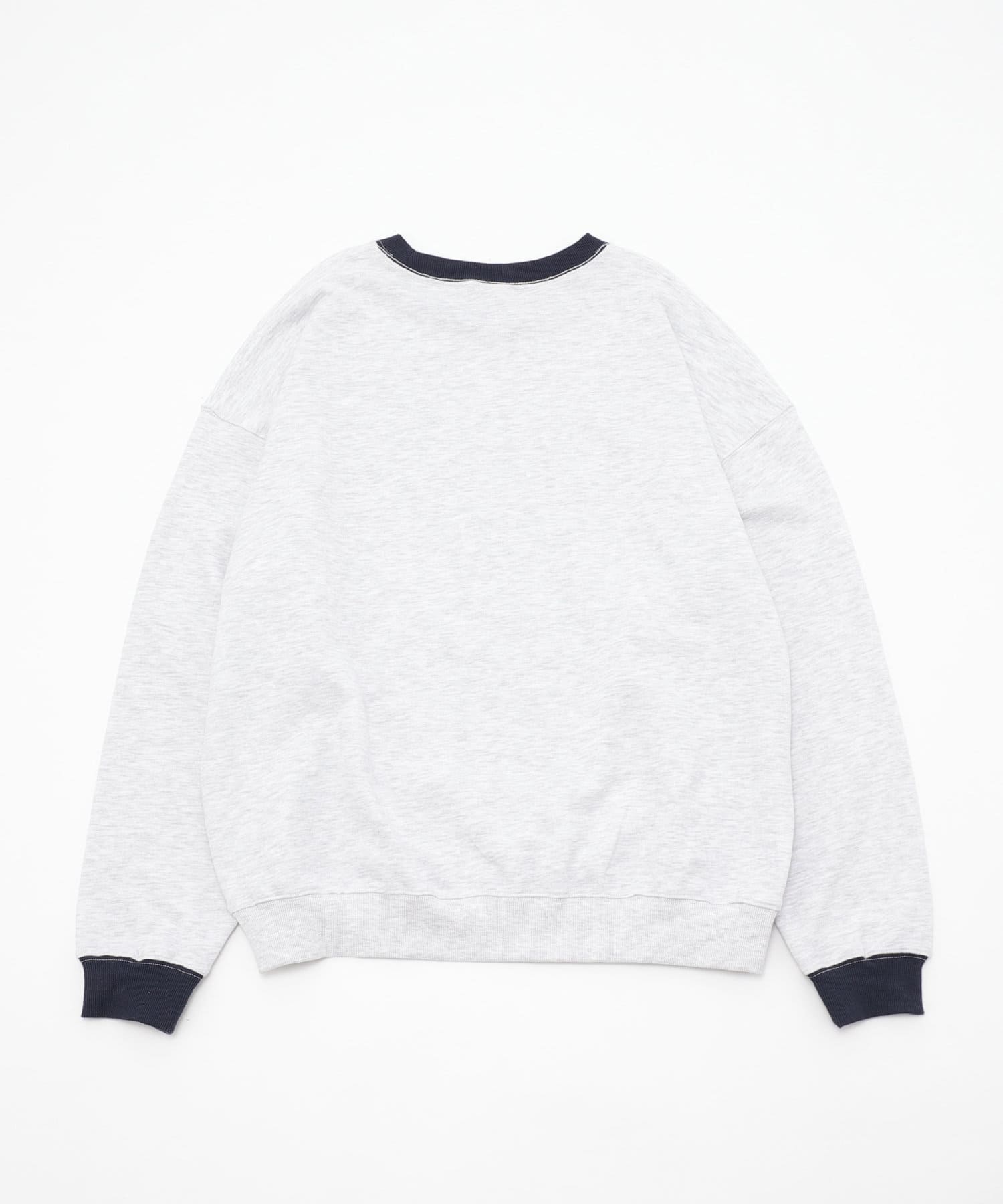 コーデのアクセントカラーになるリンガーデザインのクルースウェット
