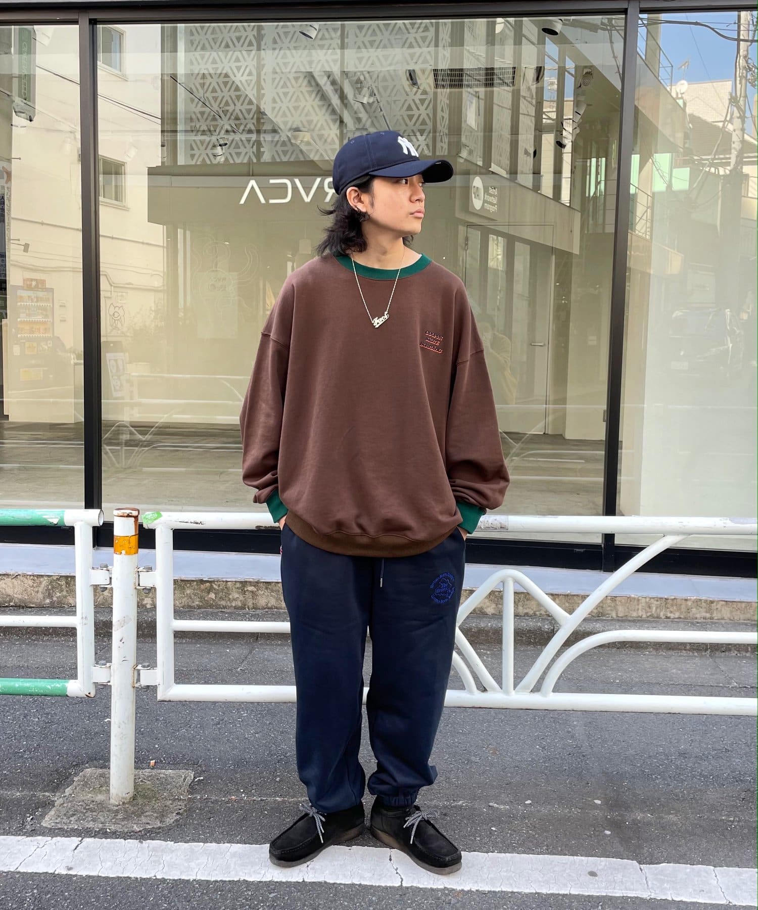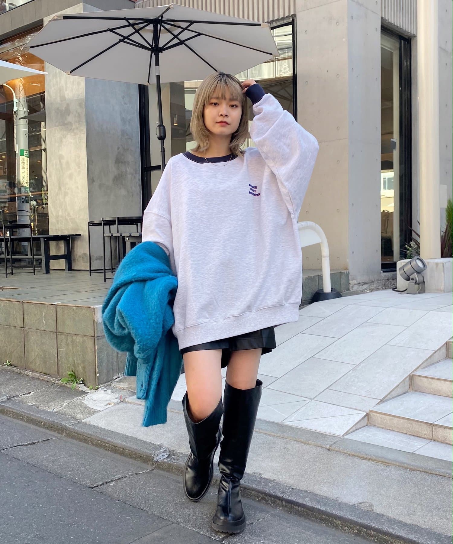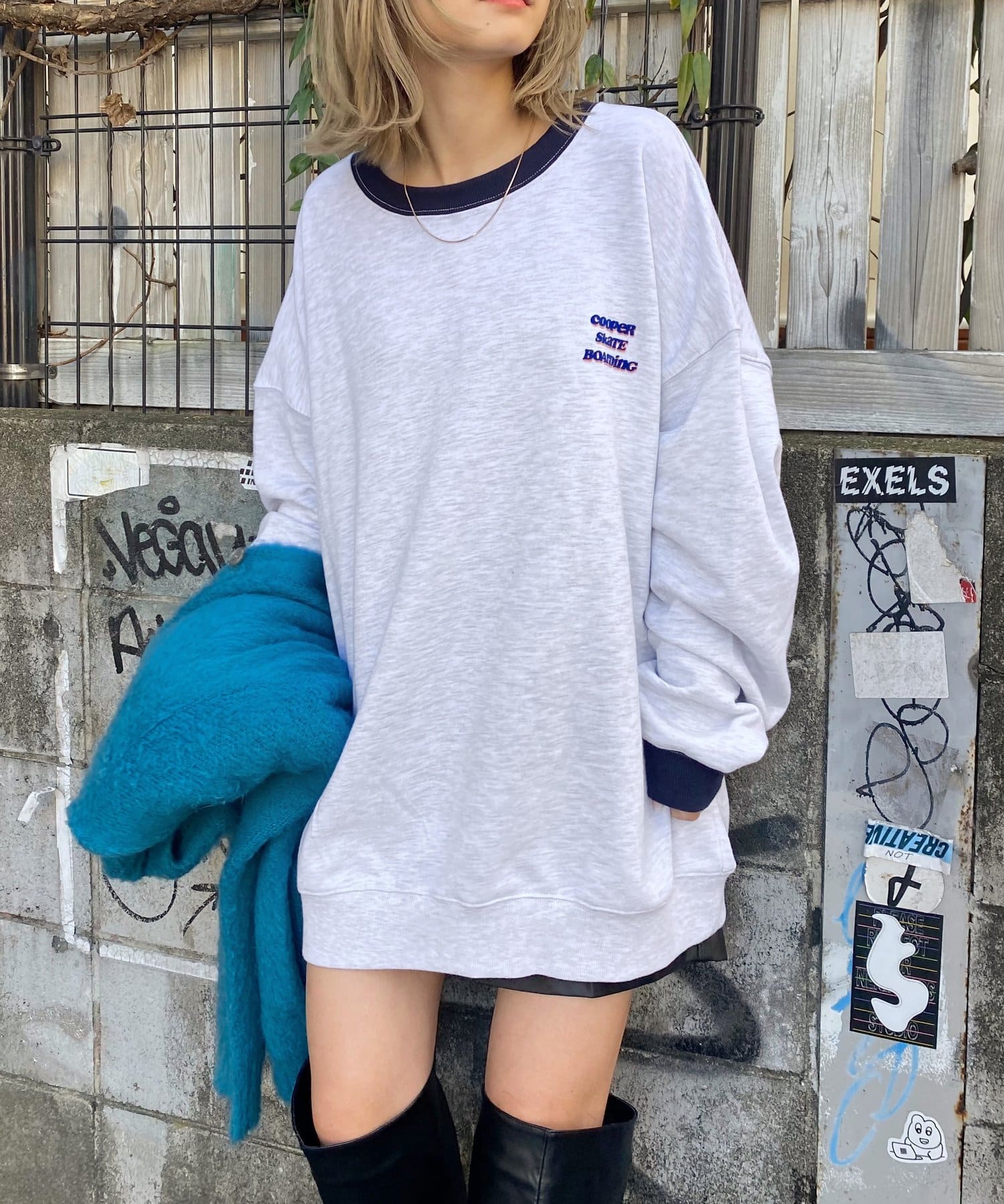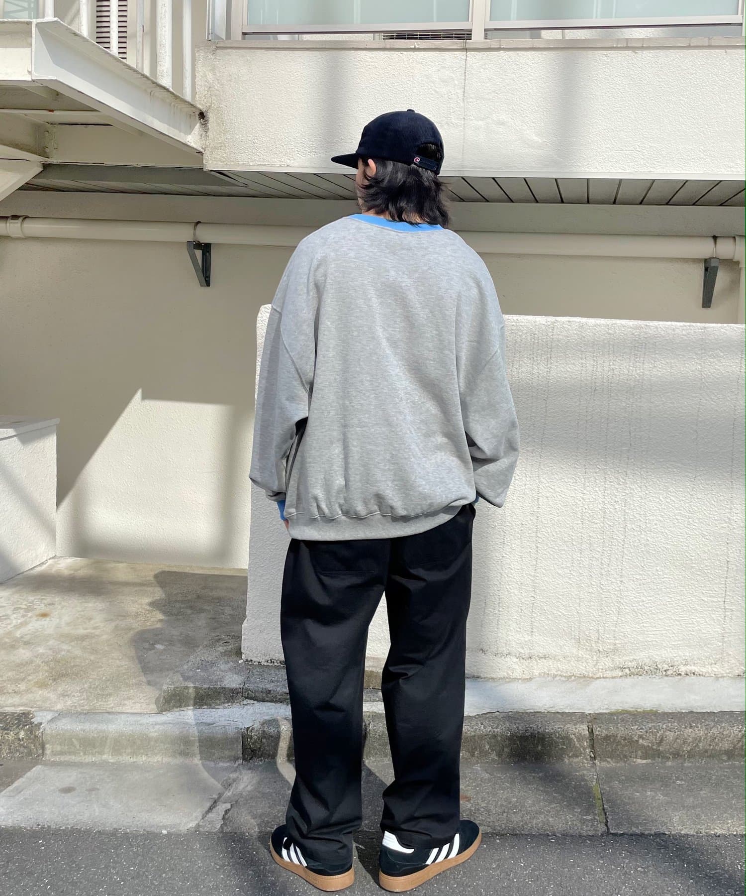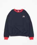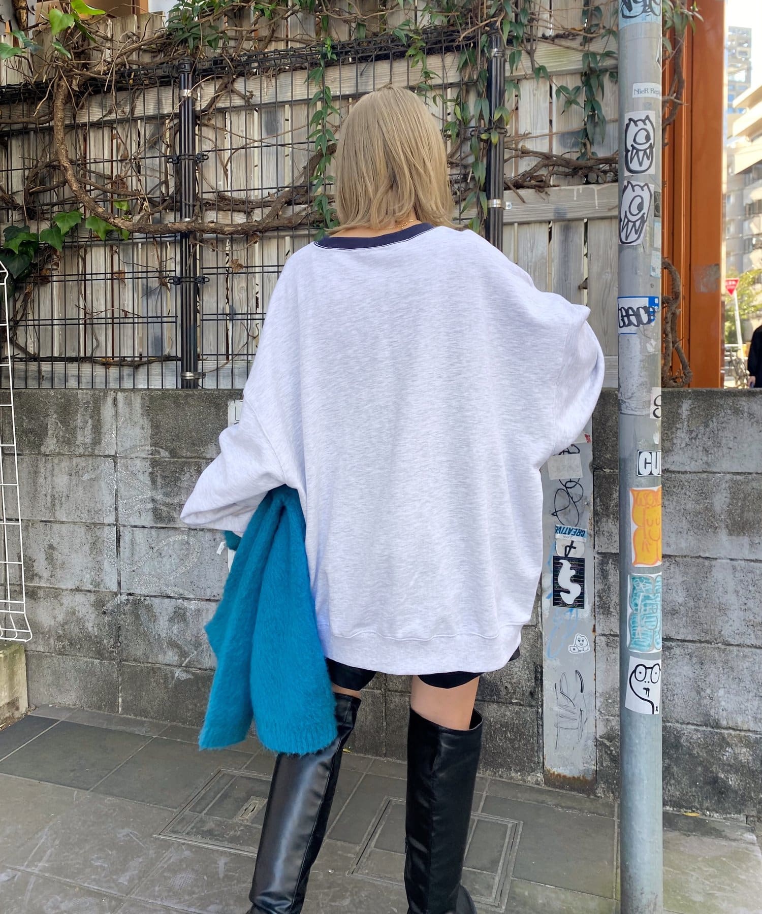 コーデのアクセントカラーになるリンガーデザインのクルースウェット