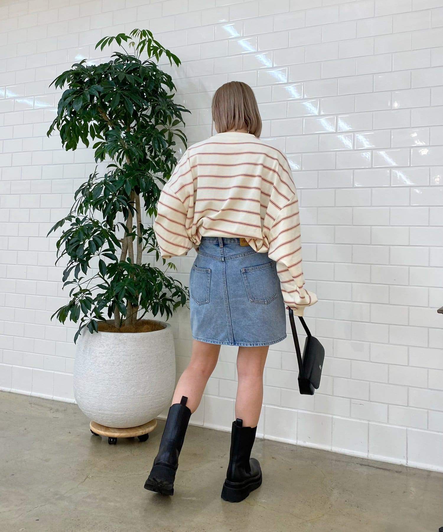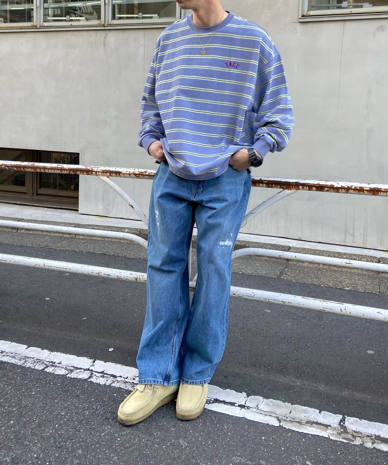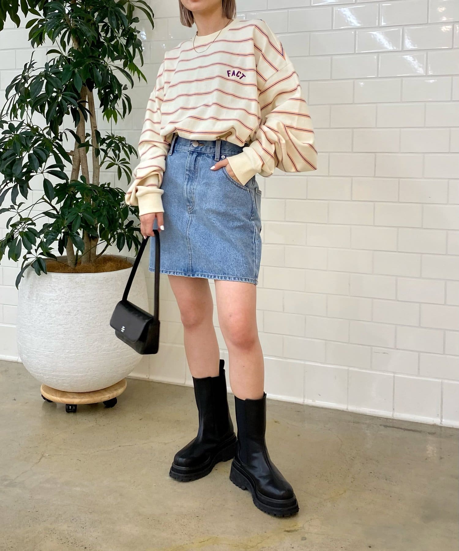 ・デニム合わせで、カジュアル感高めの着こなしに。