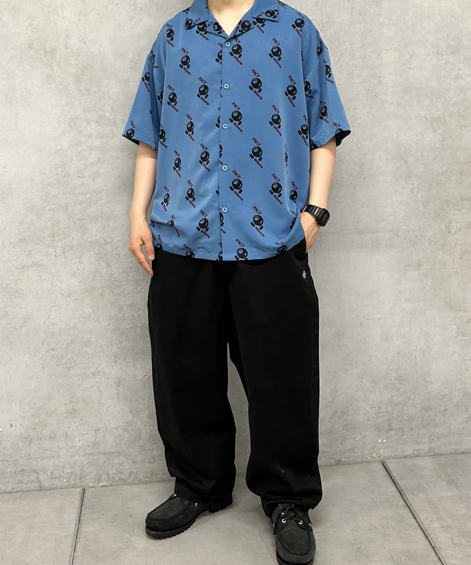 きれいめに見えがちな素材ですが総柄でストリート感もある一着。
