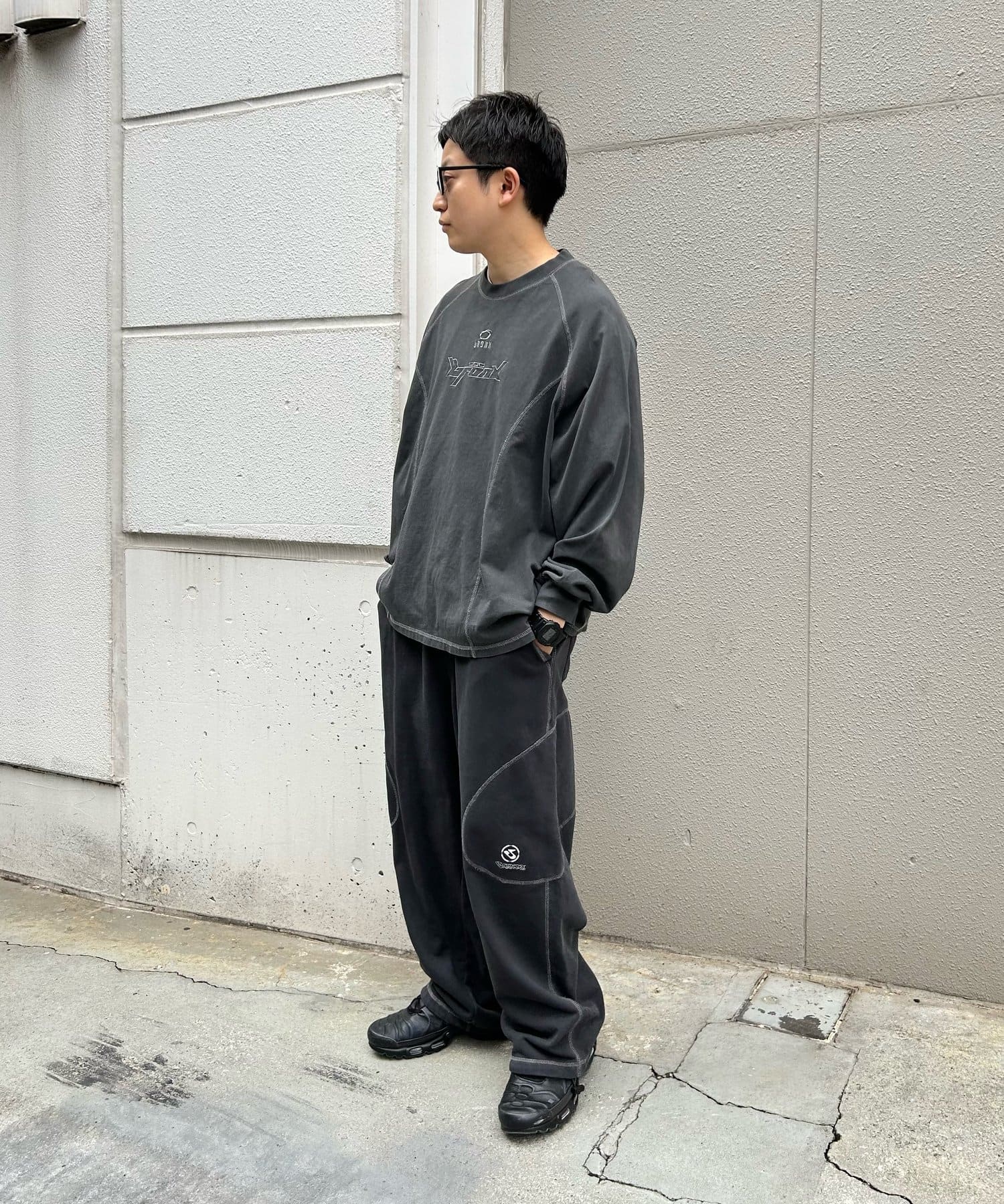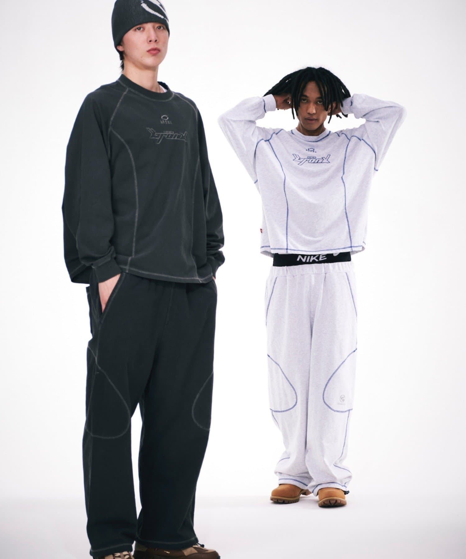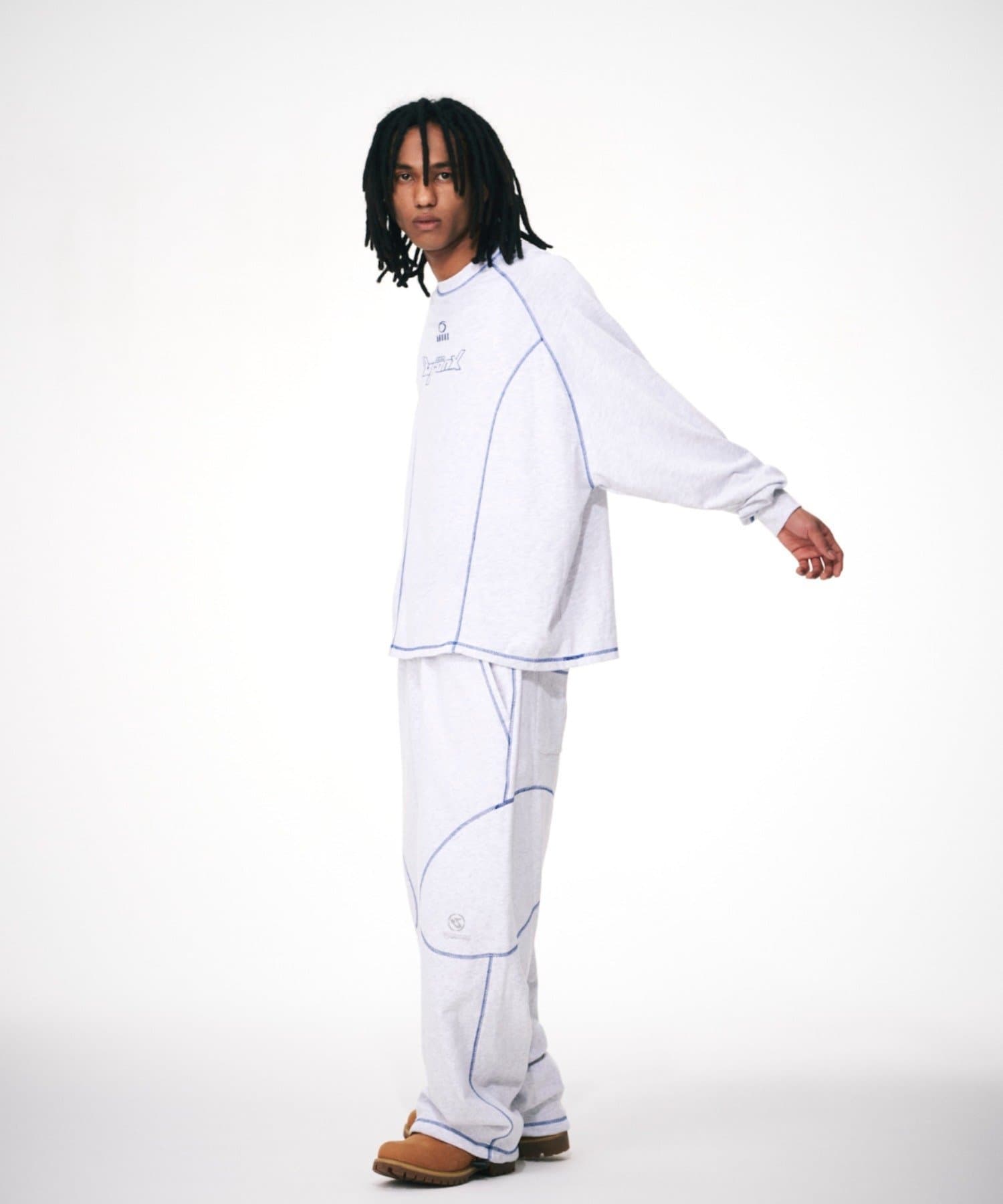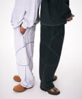 ・スウェットパンツをベースにステッチをデザインすることでスポーティーな印象の仕上がりに。