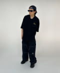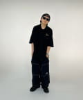 ・柔らかい素材のアイテムなので、少し硬めのワークパンツやワイドパンツと合わすことでメリハリの効いたスタイルに。