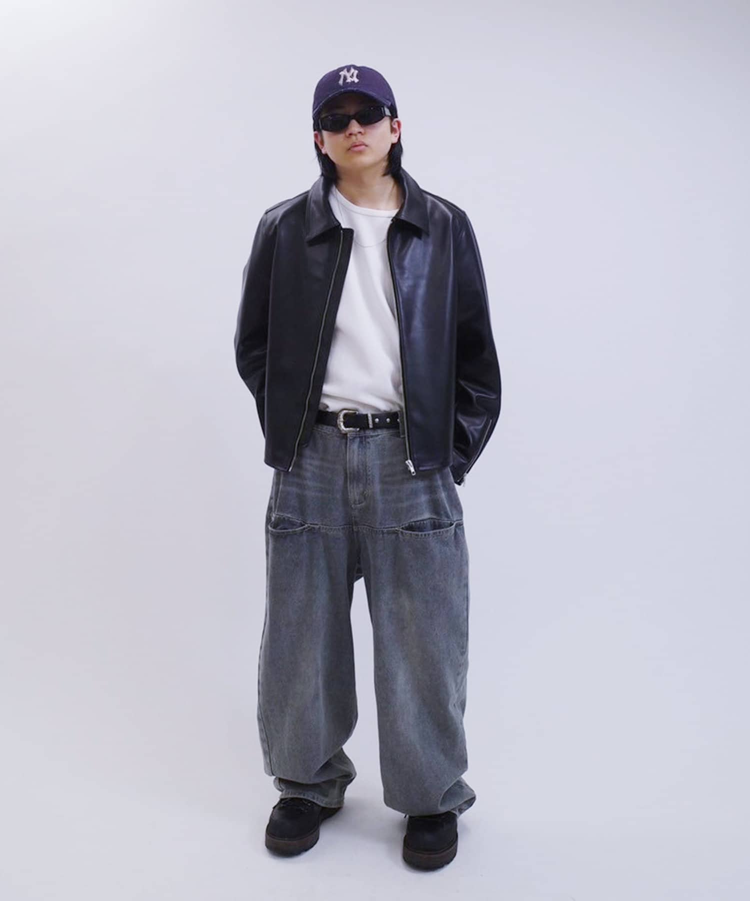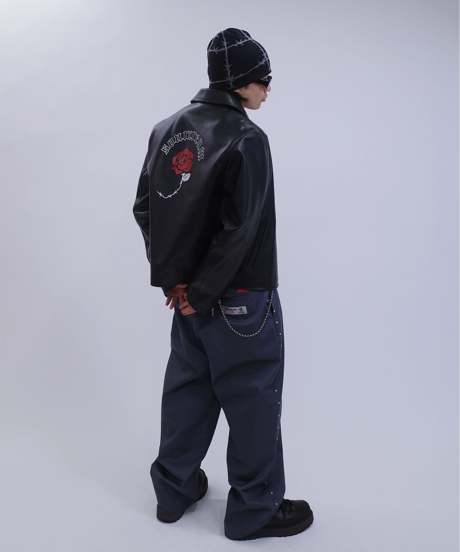 無骨なシングルライダースのレザーをパンクスなスタイルへ昇華させました。