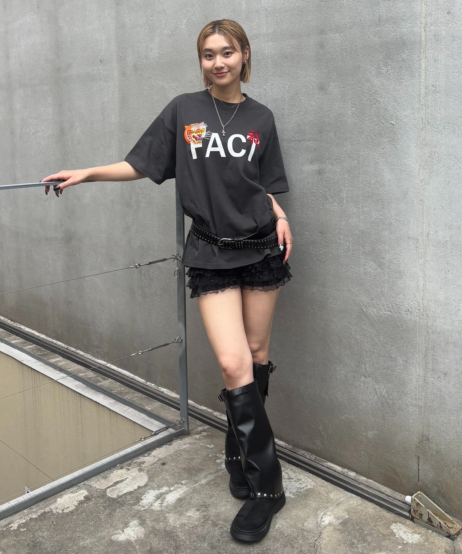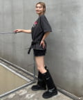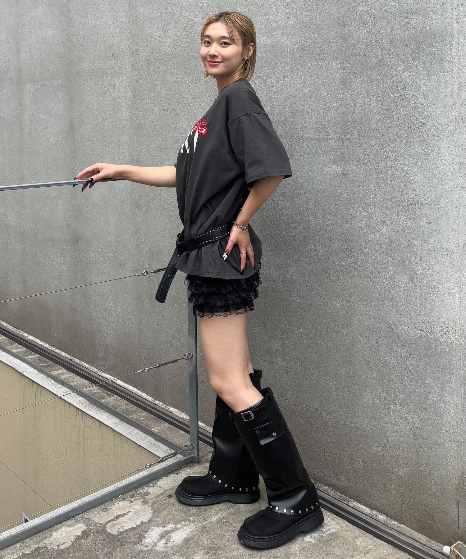 • 165cm/骨格ウェーブ【Lサイズ着用】BT:スタッズベルトPT:レースショートパンツ