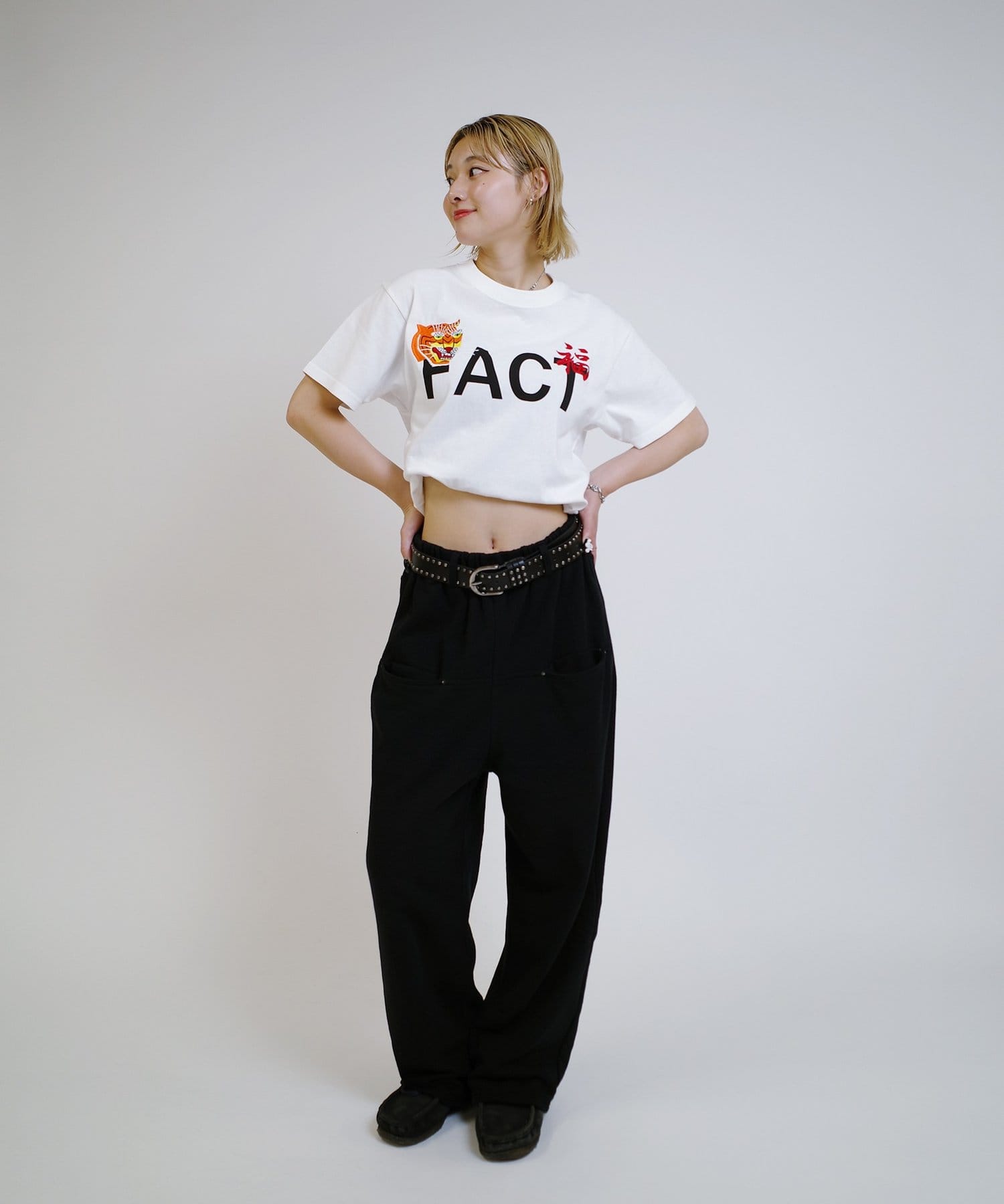 • 165cm/骨格ウェーブ【Sサイズ着用】BT:ヒョウ柄ベルトPT:スラッシュポケットイージースウェットパンツ
