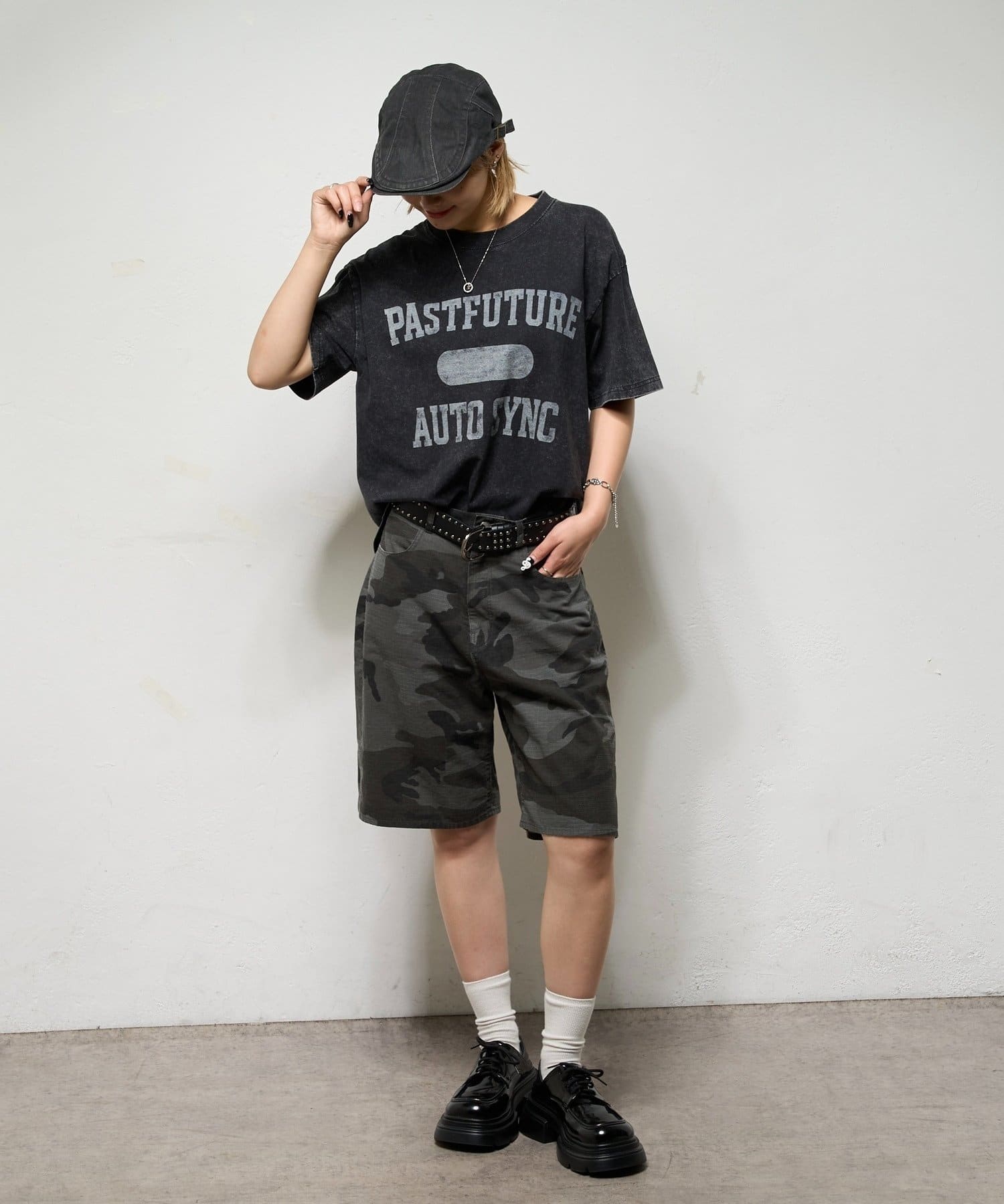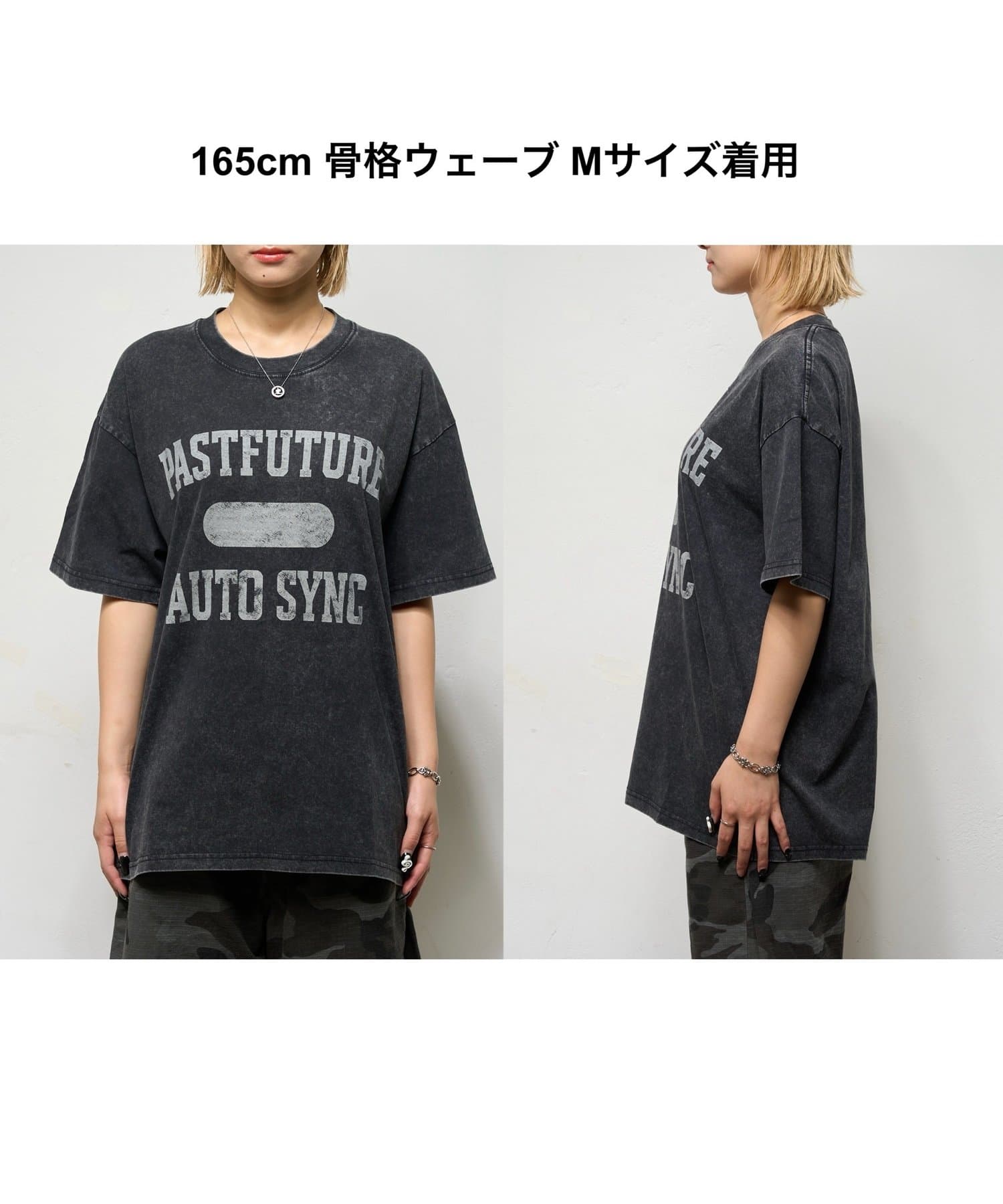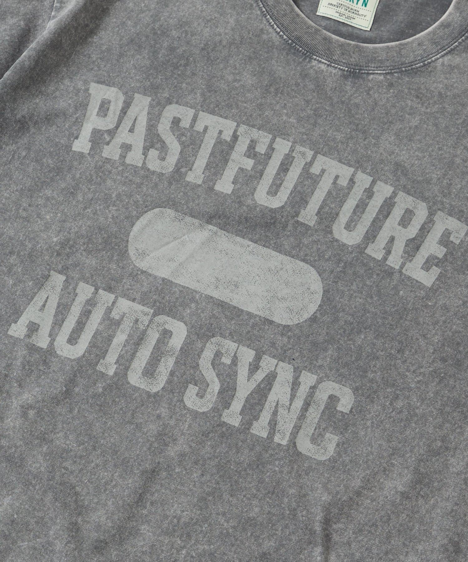 ・フロントには「PASTFUTURE AUTO SYNC」のロゴをカレッジ風にプリントしたTシャツ。