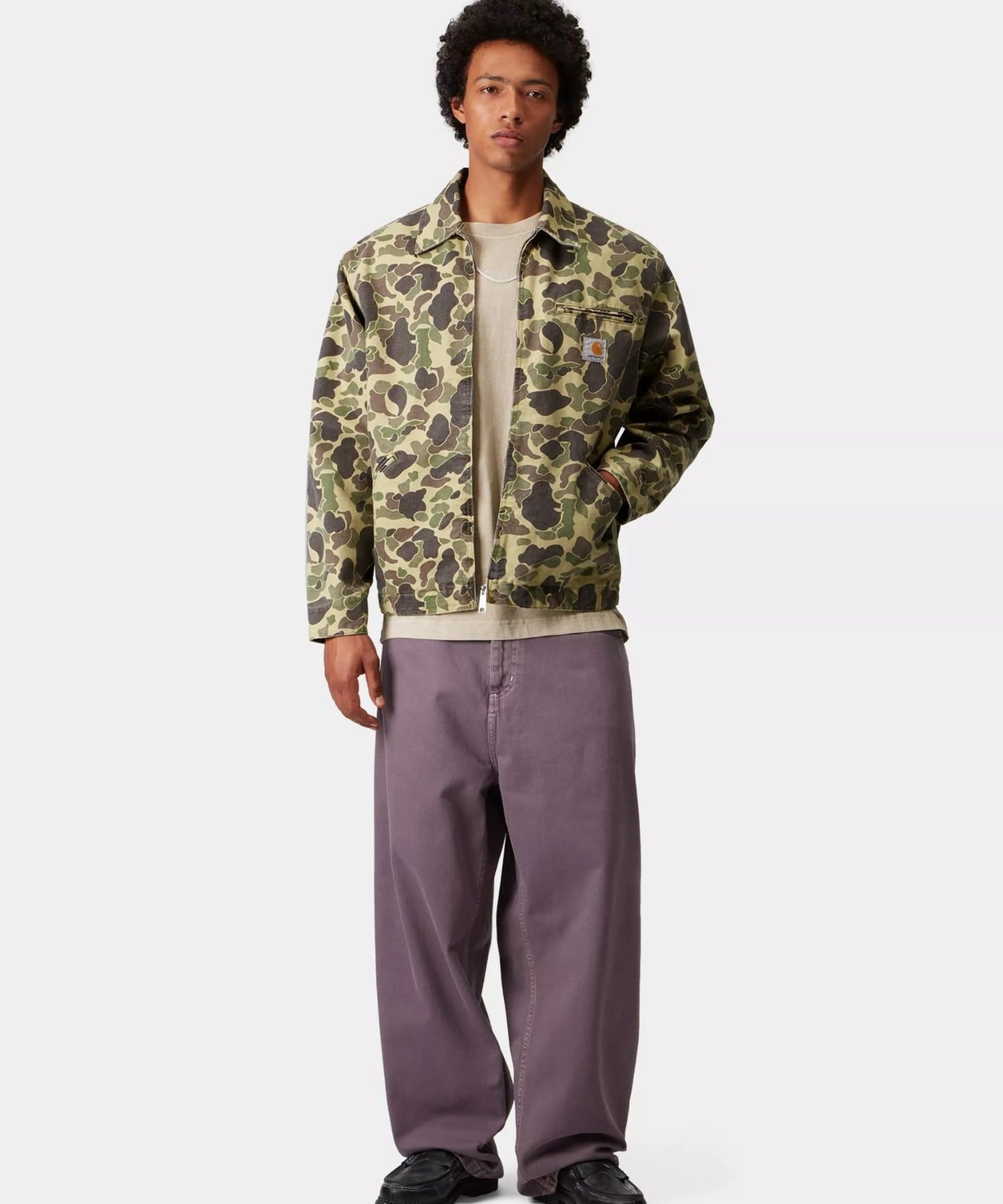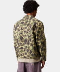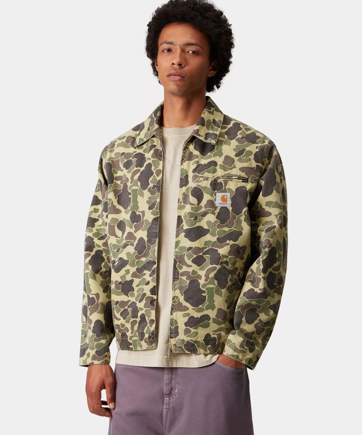 ダックデトロイトジャケットは、丈夫なディアボーンキャンバスを使用し、裏地は軽量なポプリンを使用した総裏仕立てのスタイル。ダックカモフラージュ柄の総柄が特徴。生地にガーメントダイ加工を施し、よりソフトな肌触りと複雑な色使いを実現。トリプルステッチとジップ付き胸ポケットが機能的なディテールです。フロントには、カーハートWIPのスクエアラベルがあしらわれていてデザインを完成させています。