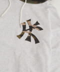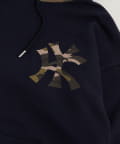 ・ フード部分と胸元のブランドロゴにカモ柄をあしらった、遊び心のあるデザイン。