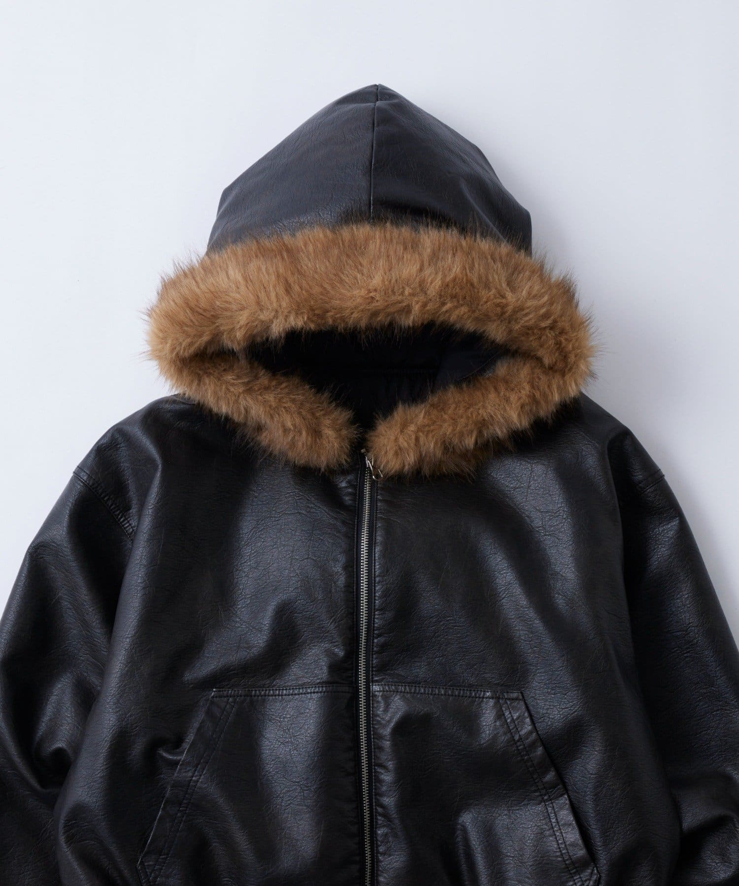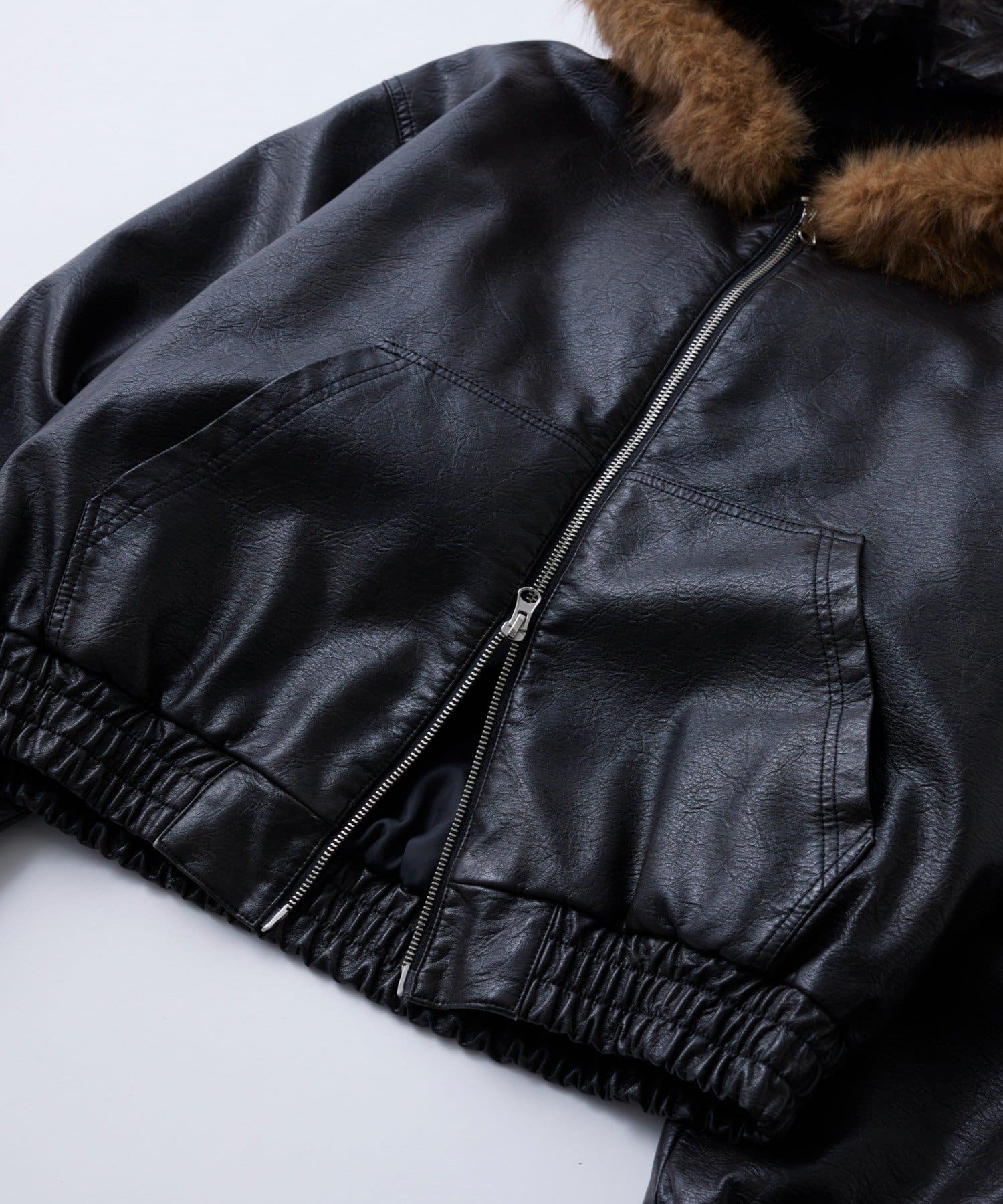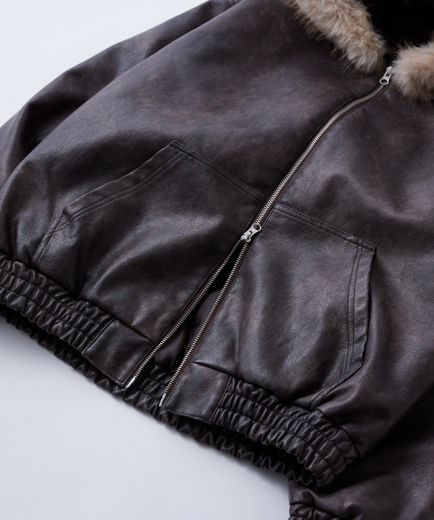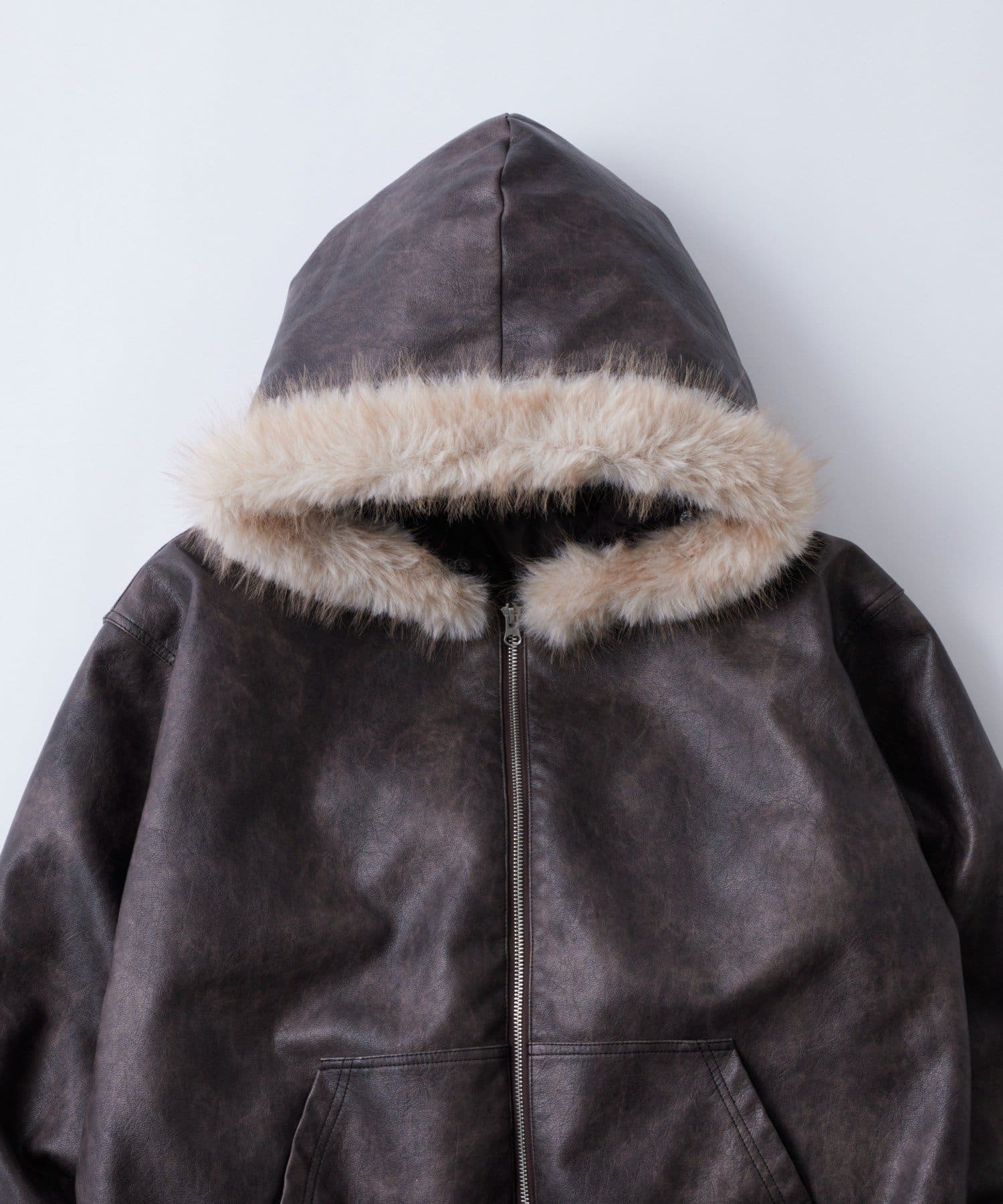 【2way/ファー取り外し可能】ヴィンテージライクレザーファーフードブルゾン