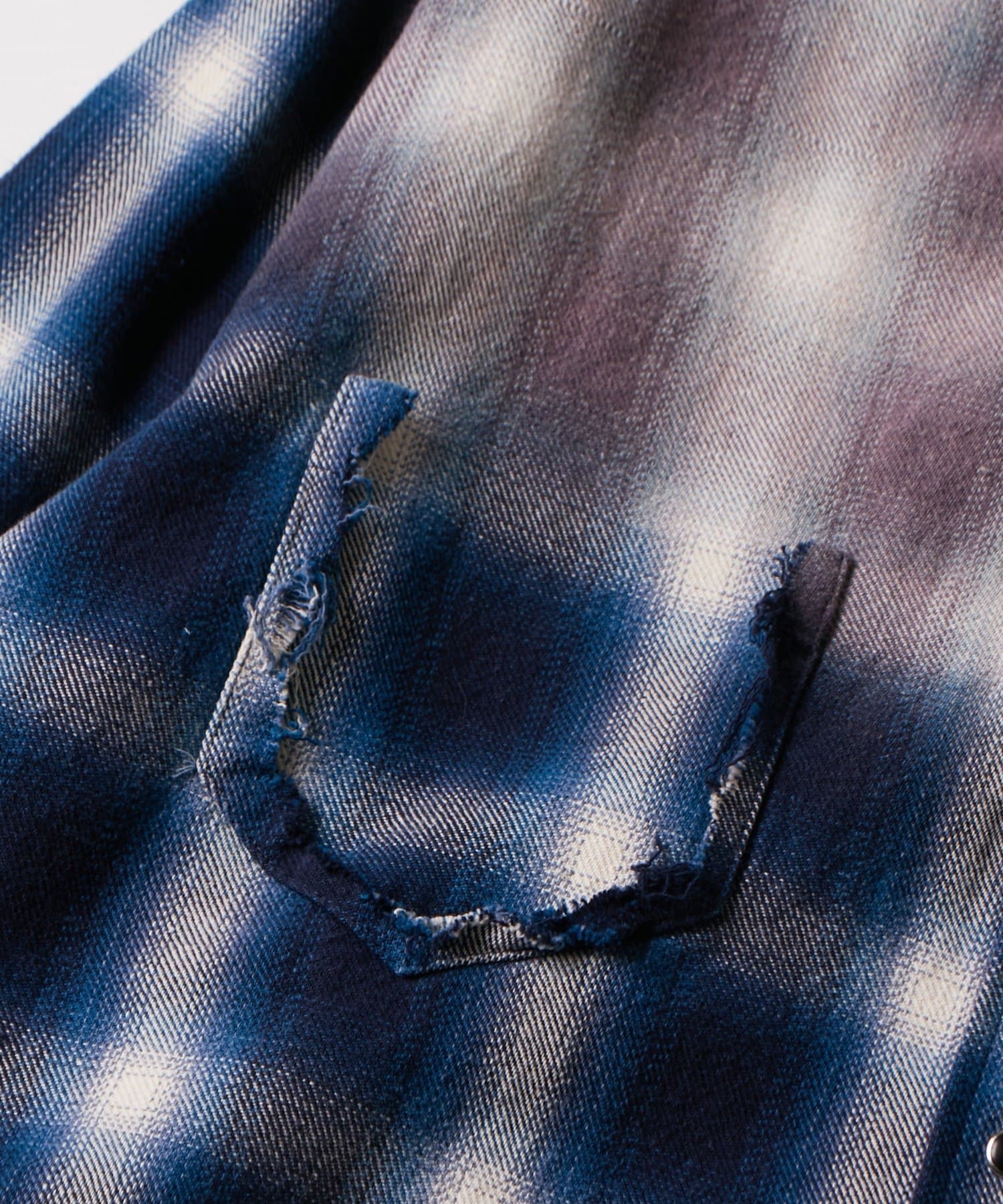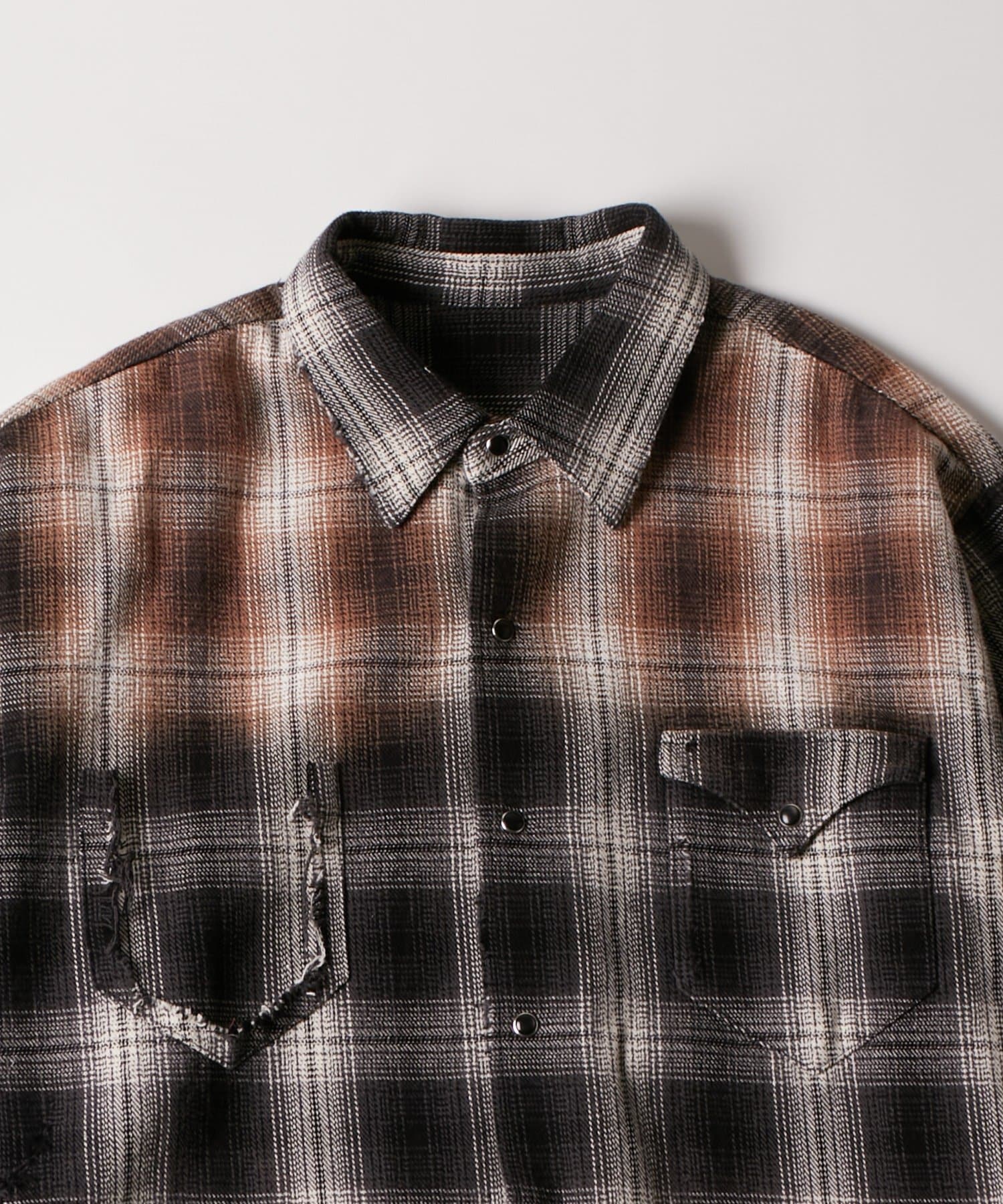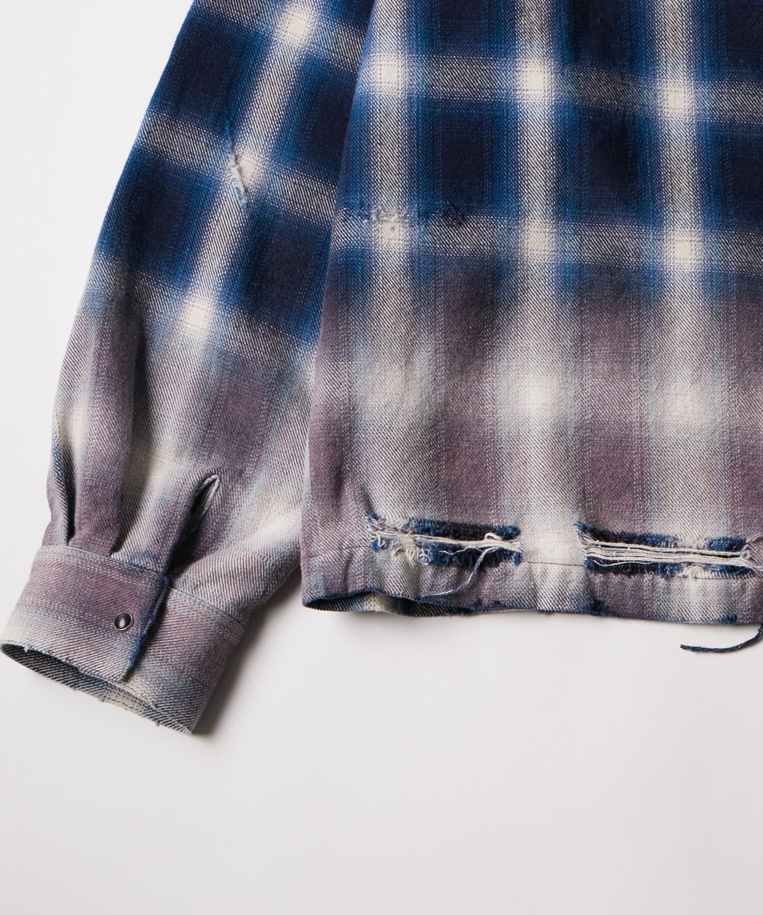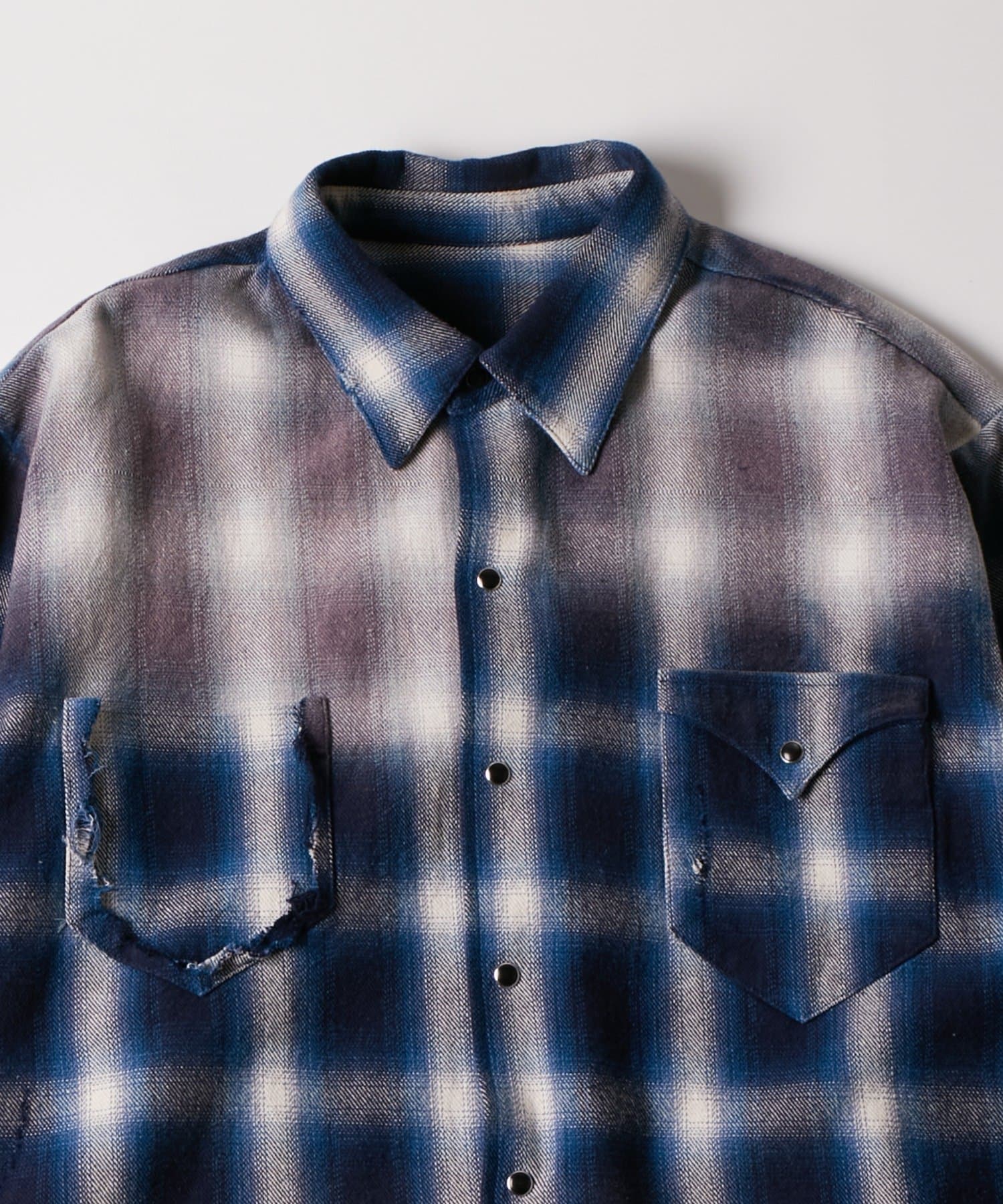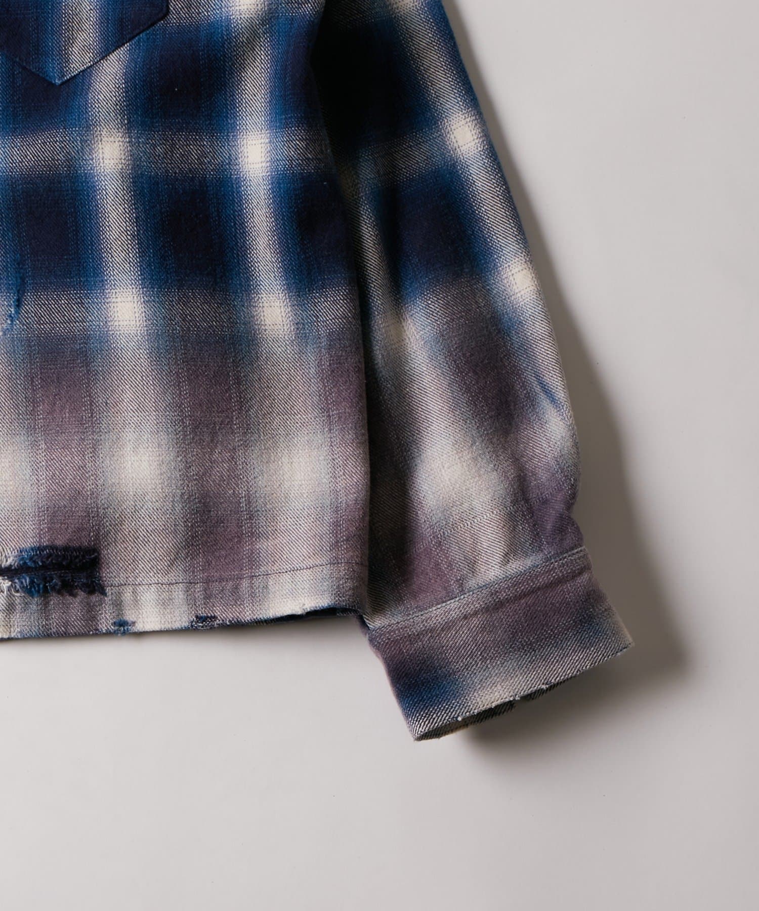 ・ヴィンテージ感あふれるダメージ加工を施したチェックシャツ。