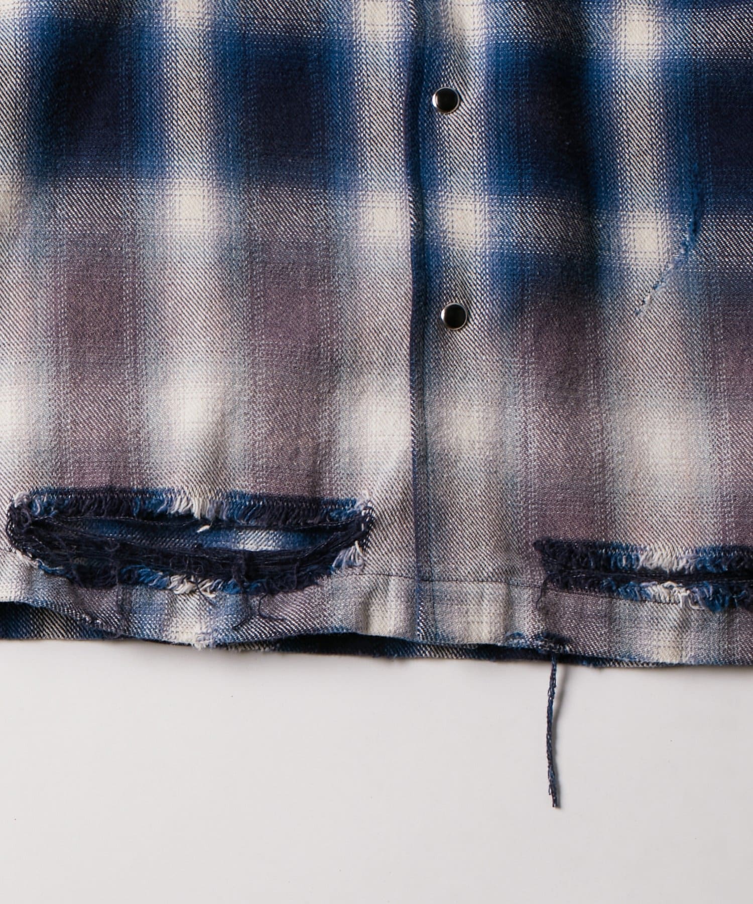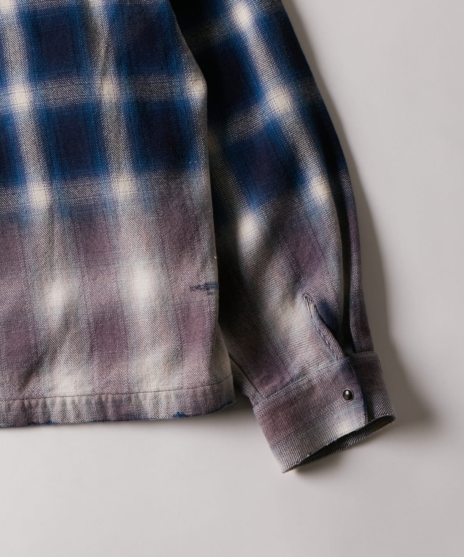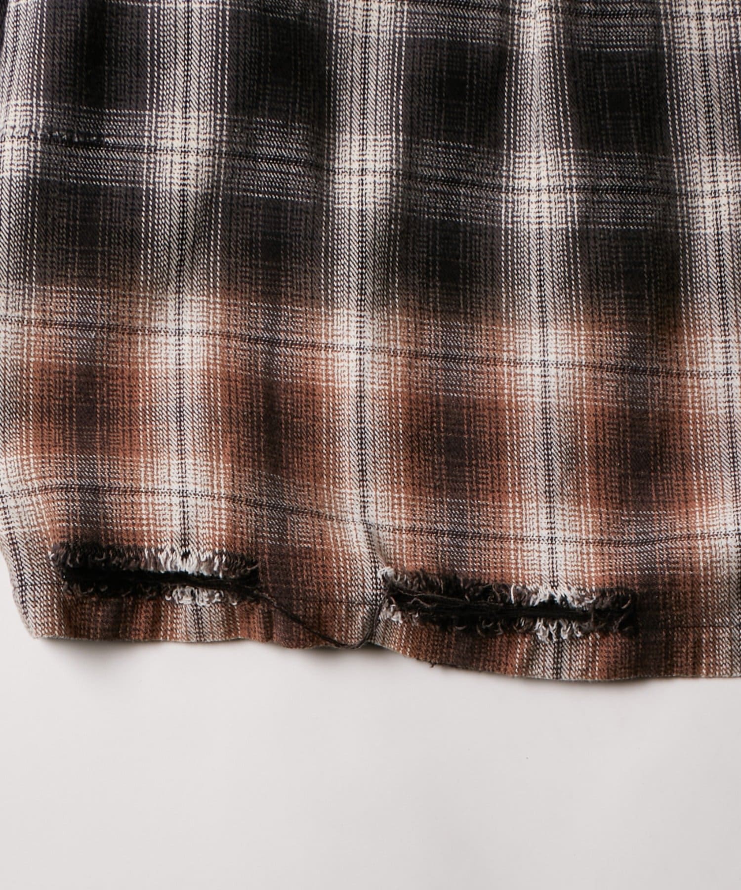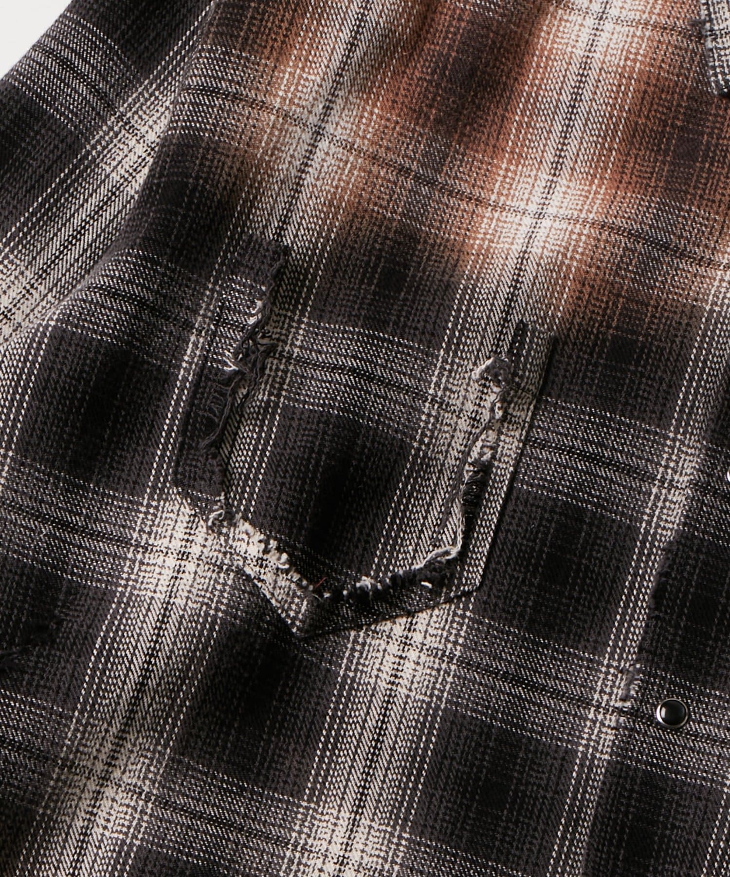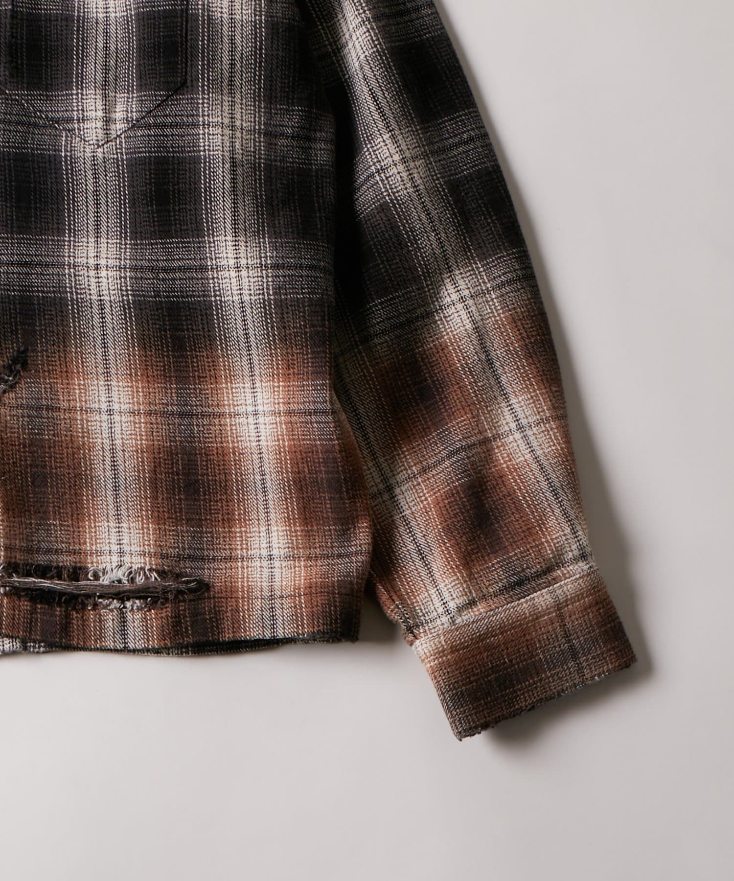 ・ヴィンテージ感あふれるダメージ加工を施したチェックシャツ。