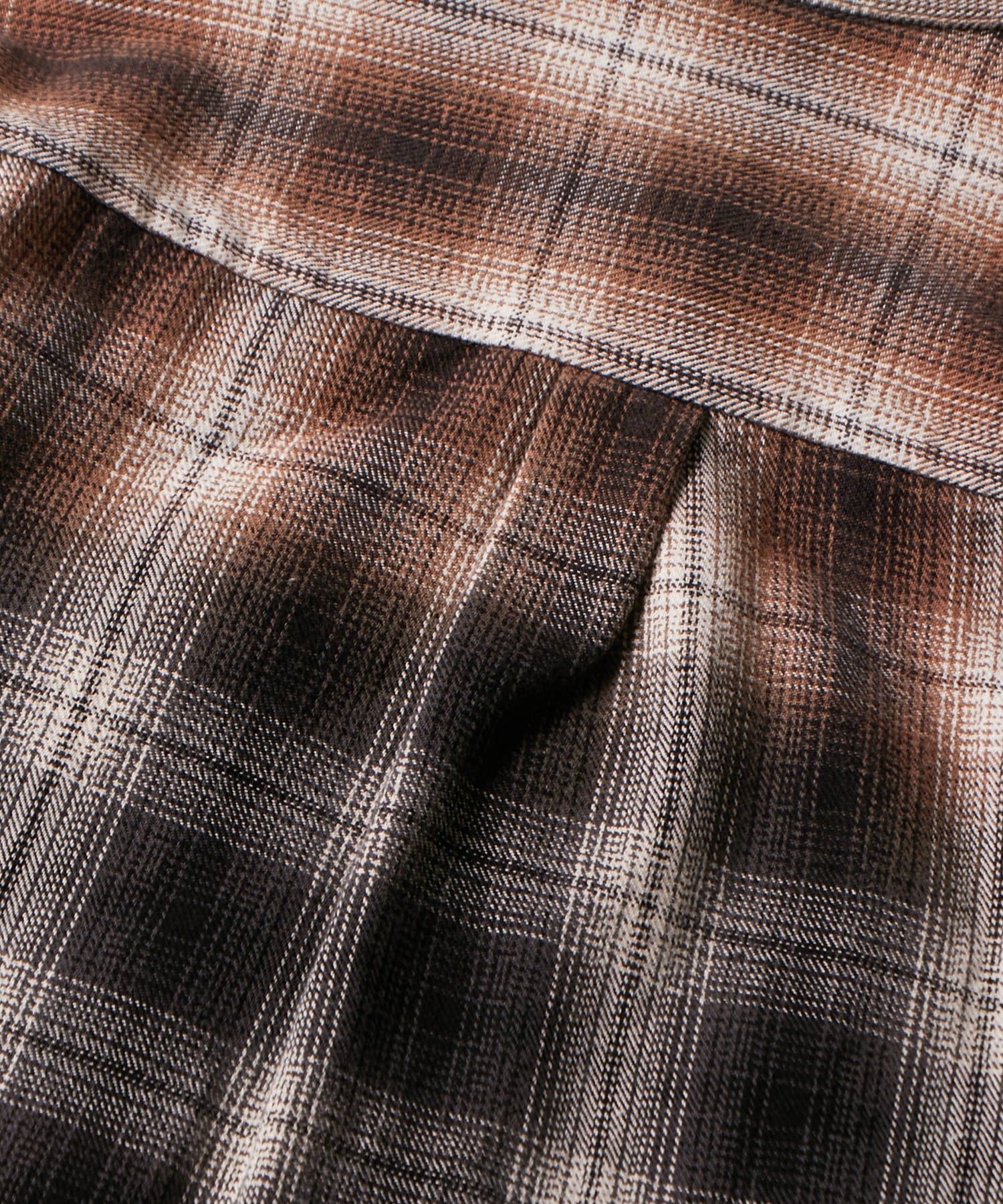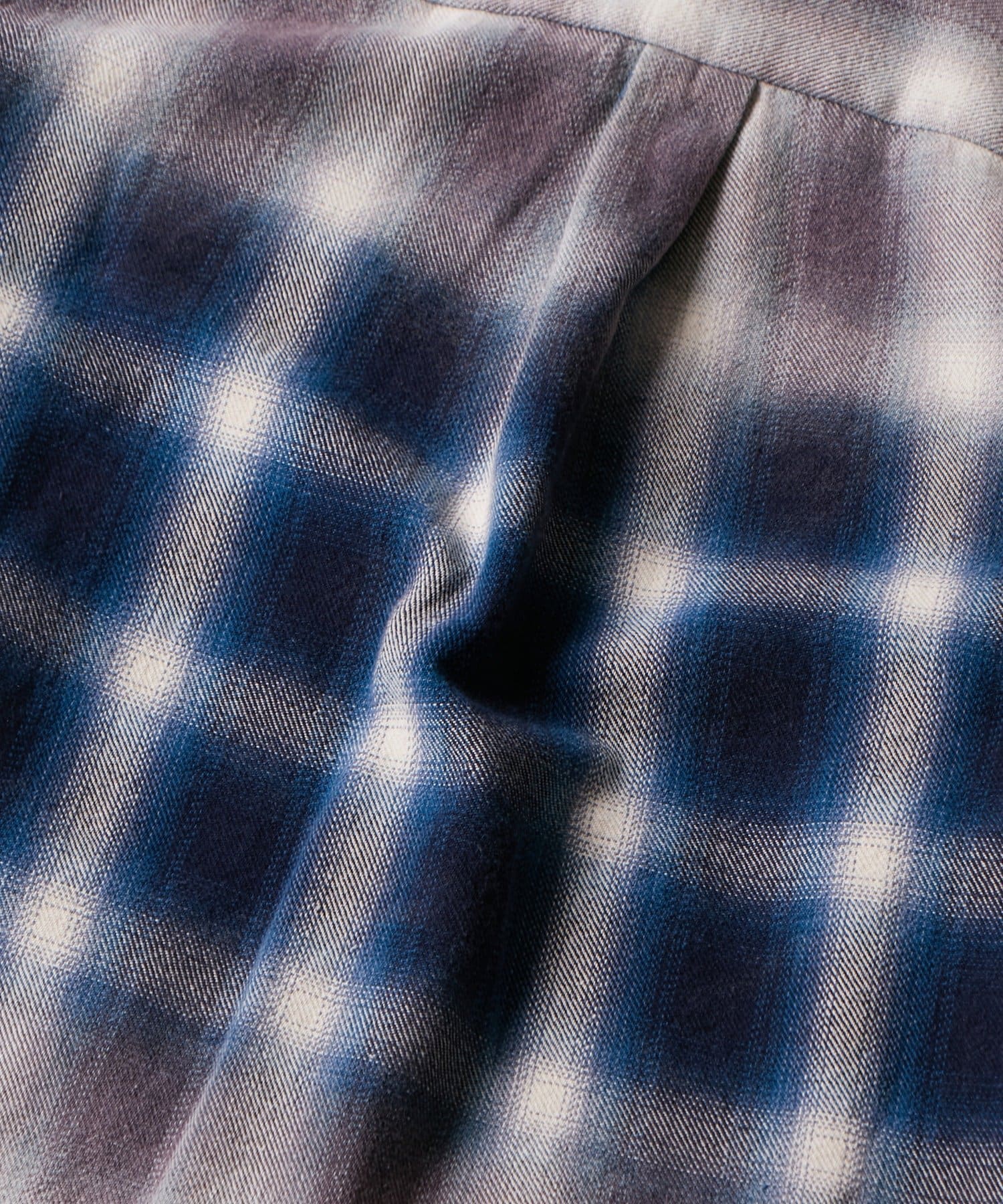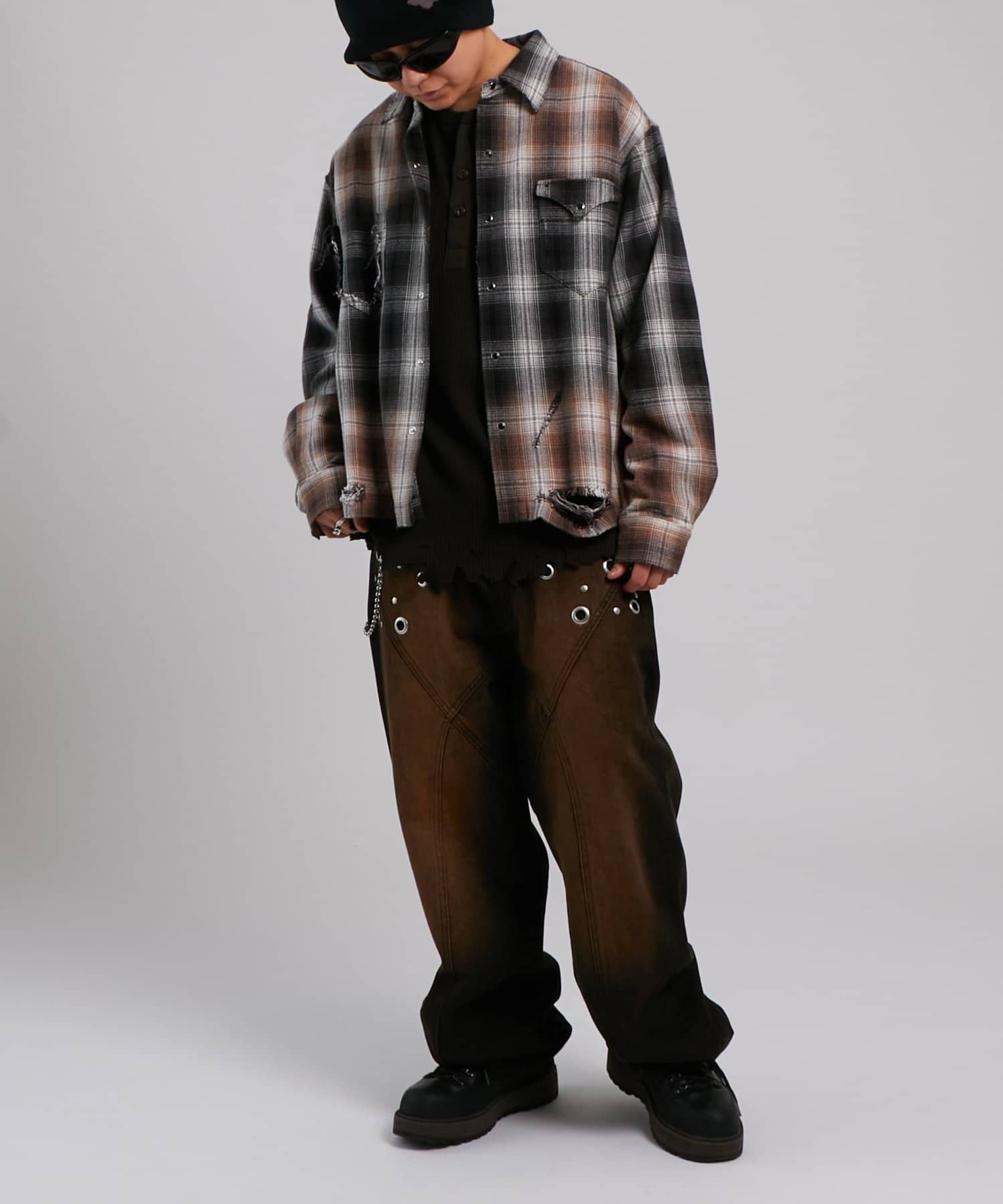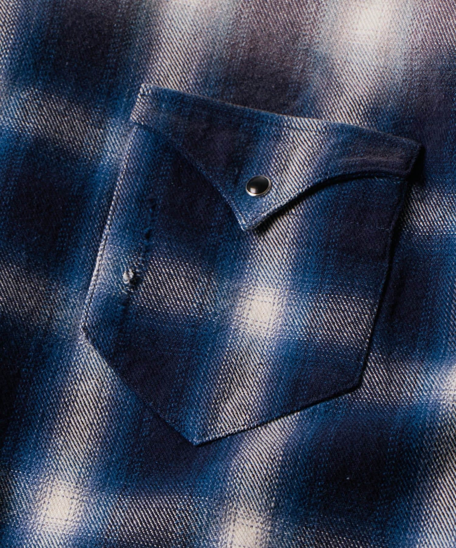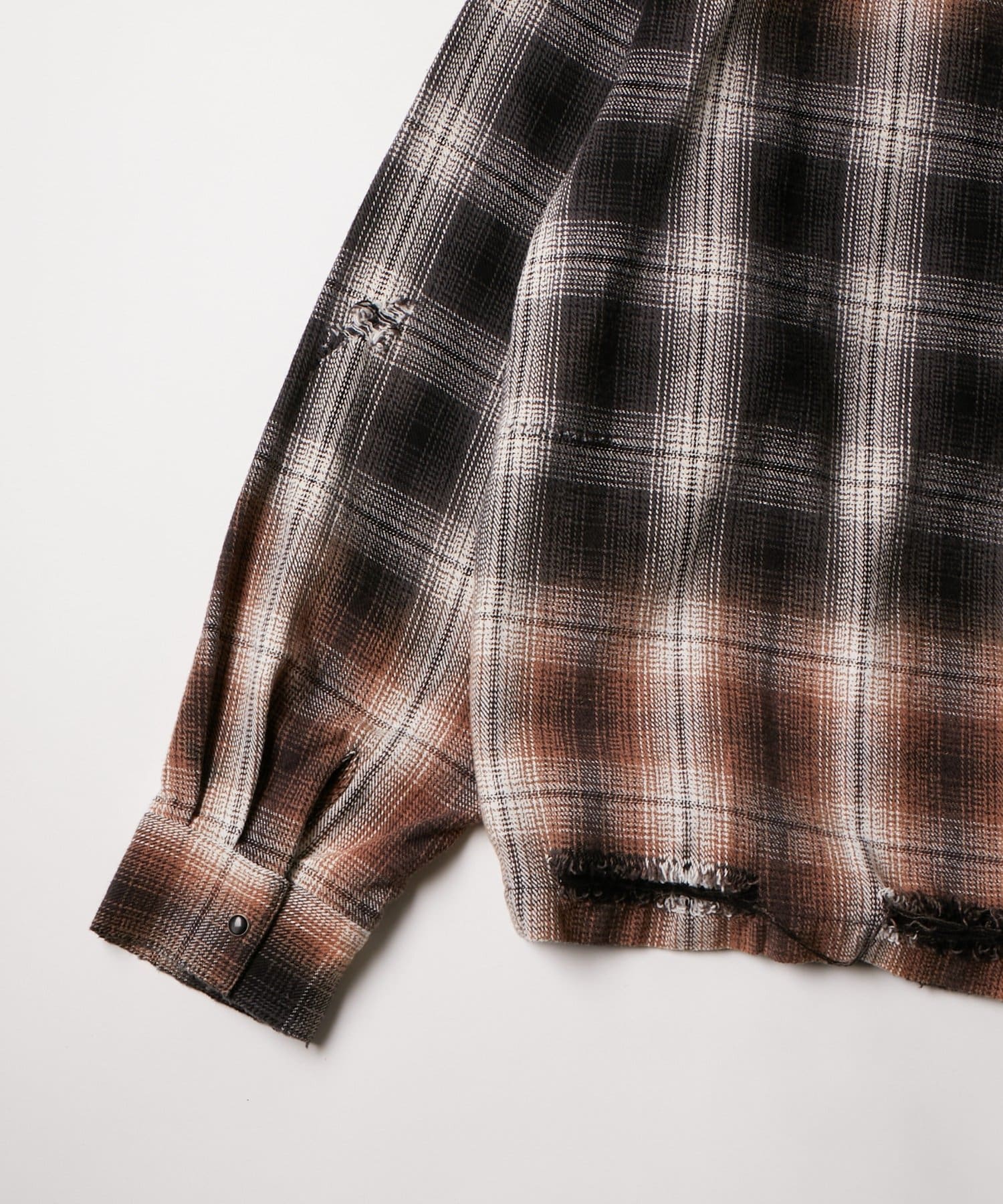 ・ヴィンテージ感あふれるダメージ加工を施したチェックシャツ。