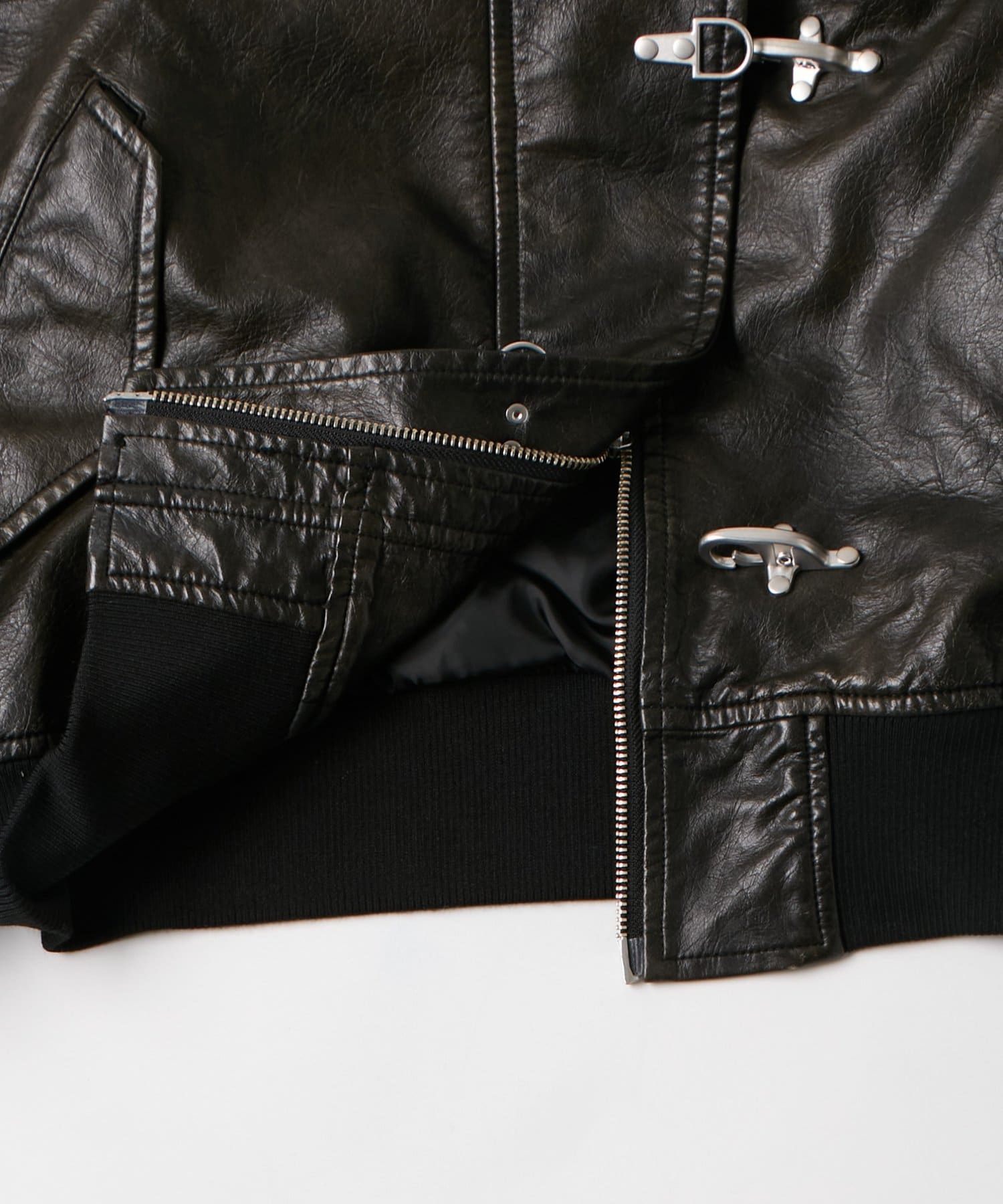 ・武骨な印象のファイヤーマンフックが目を引く、ヴィンテージライクなレザーブルゾン。