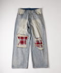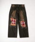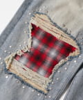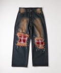 ・大胆なダメージ加工に、チェック柄のパッチをあしらった、個性的なデニムパンツ。