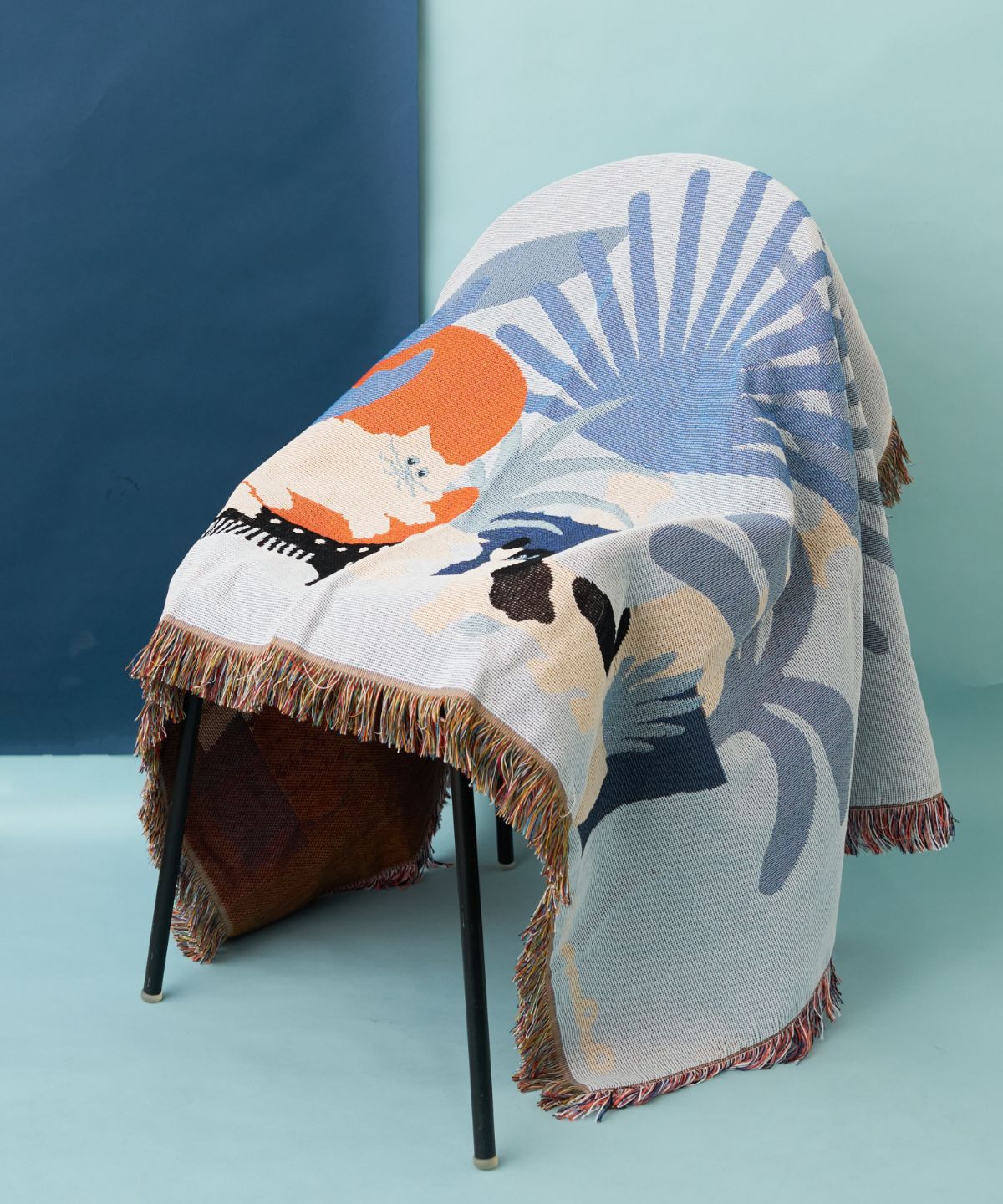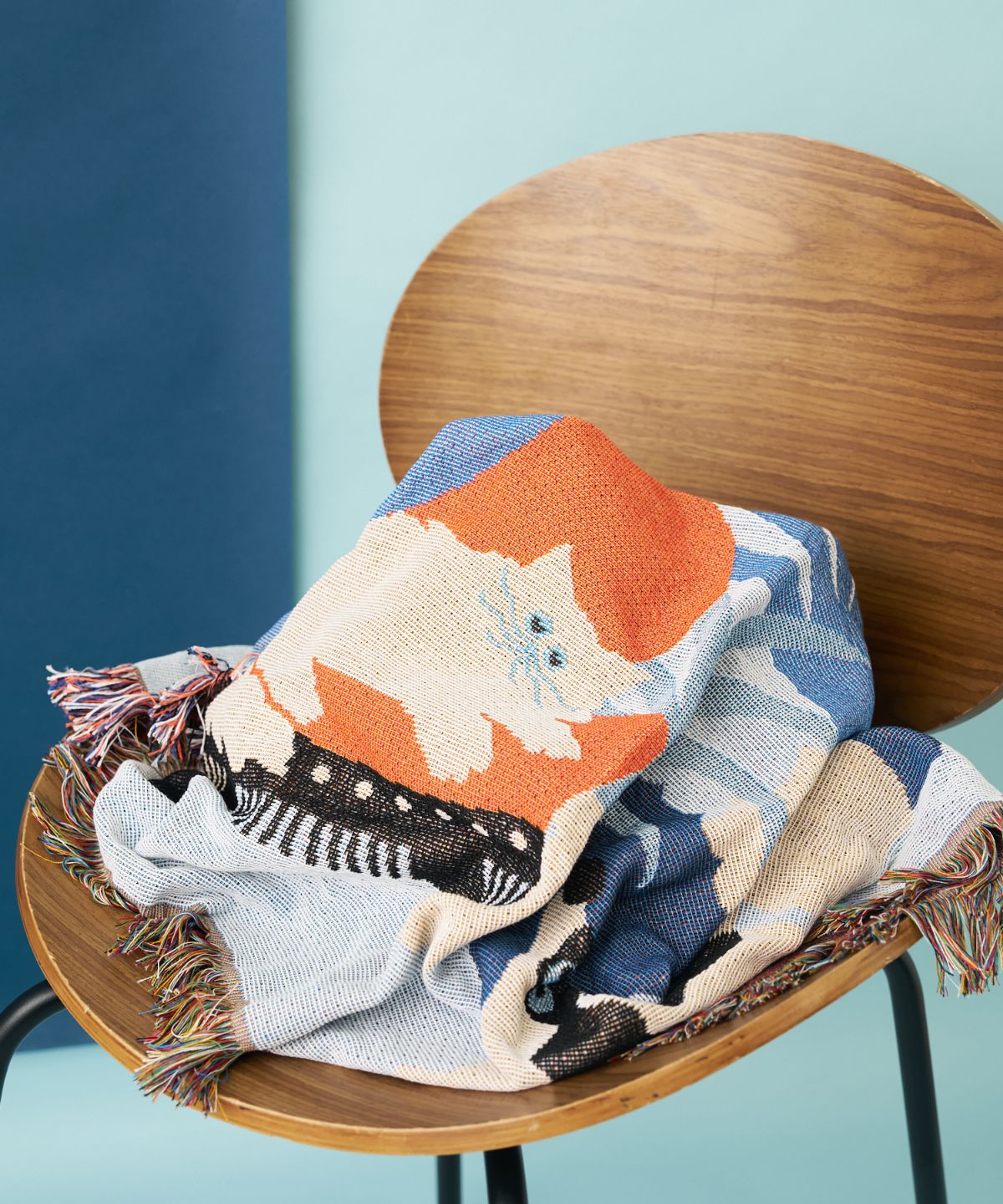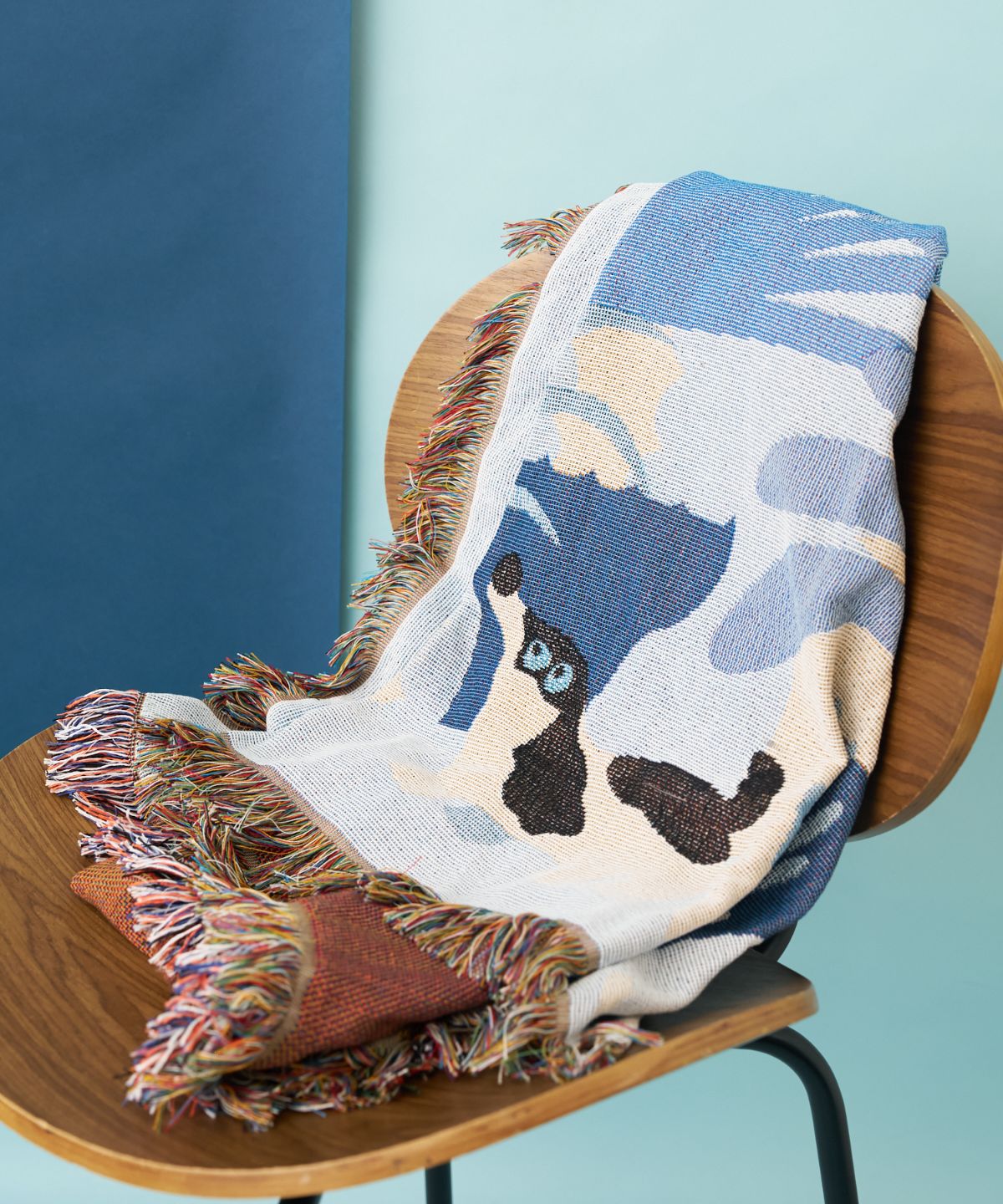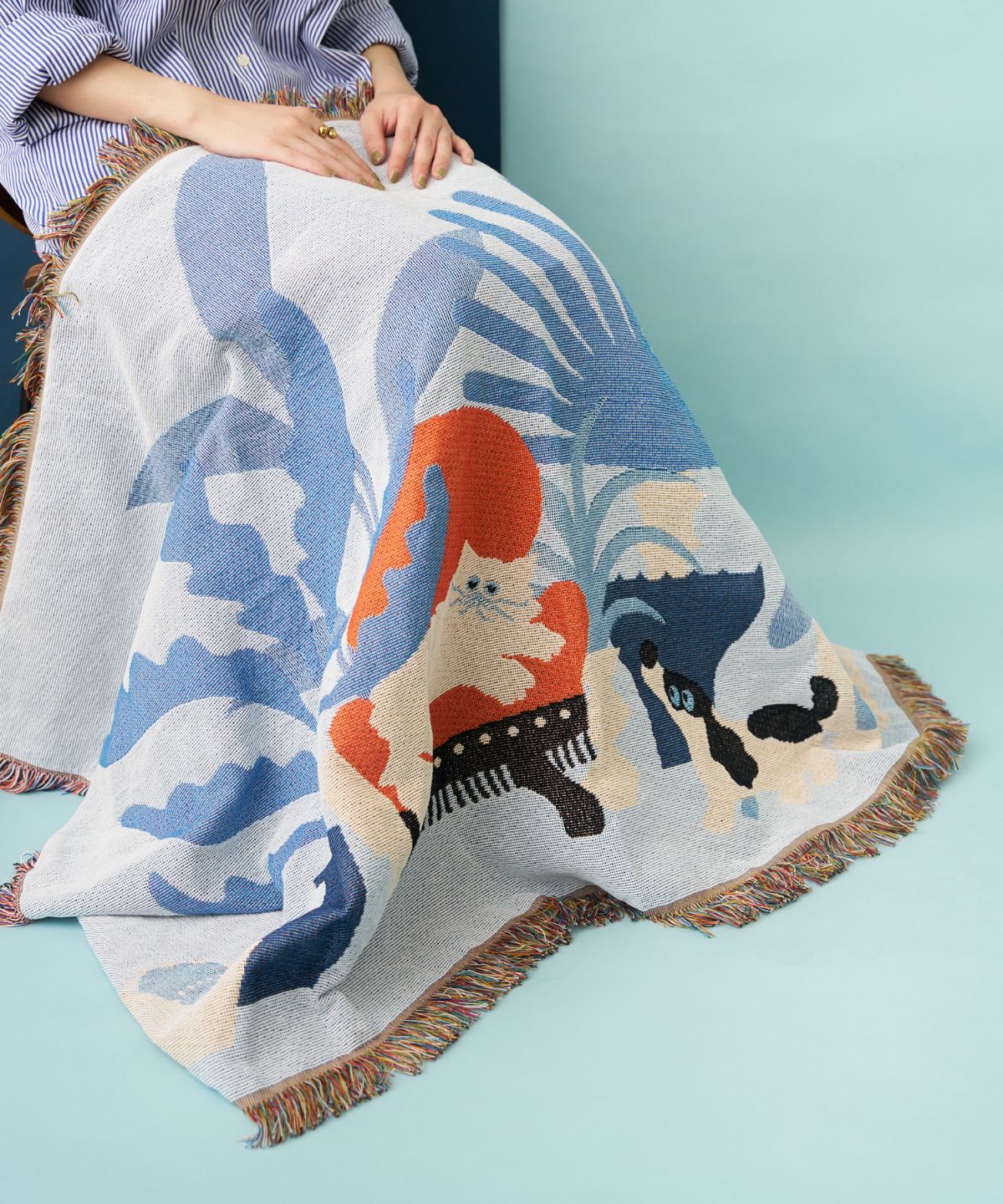 こちらのアートで初の商品化が実現したスローケット。ソファやベッドにさらっとかけたり、ラグやひざかけにしたりと様々な用途でお使いいただけます。