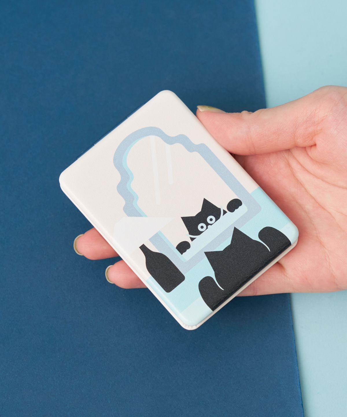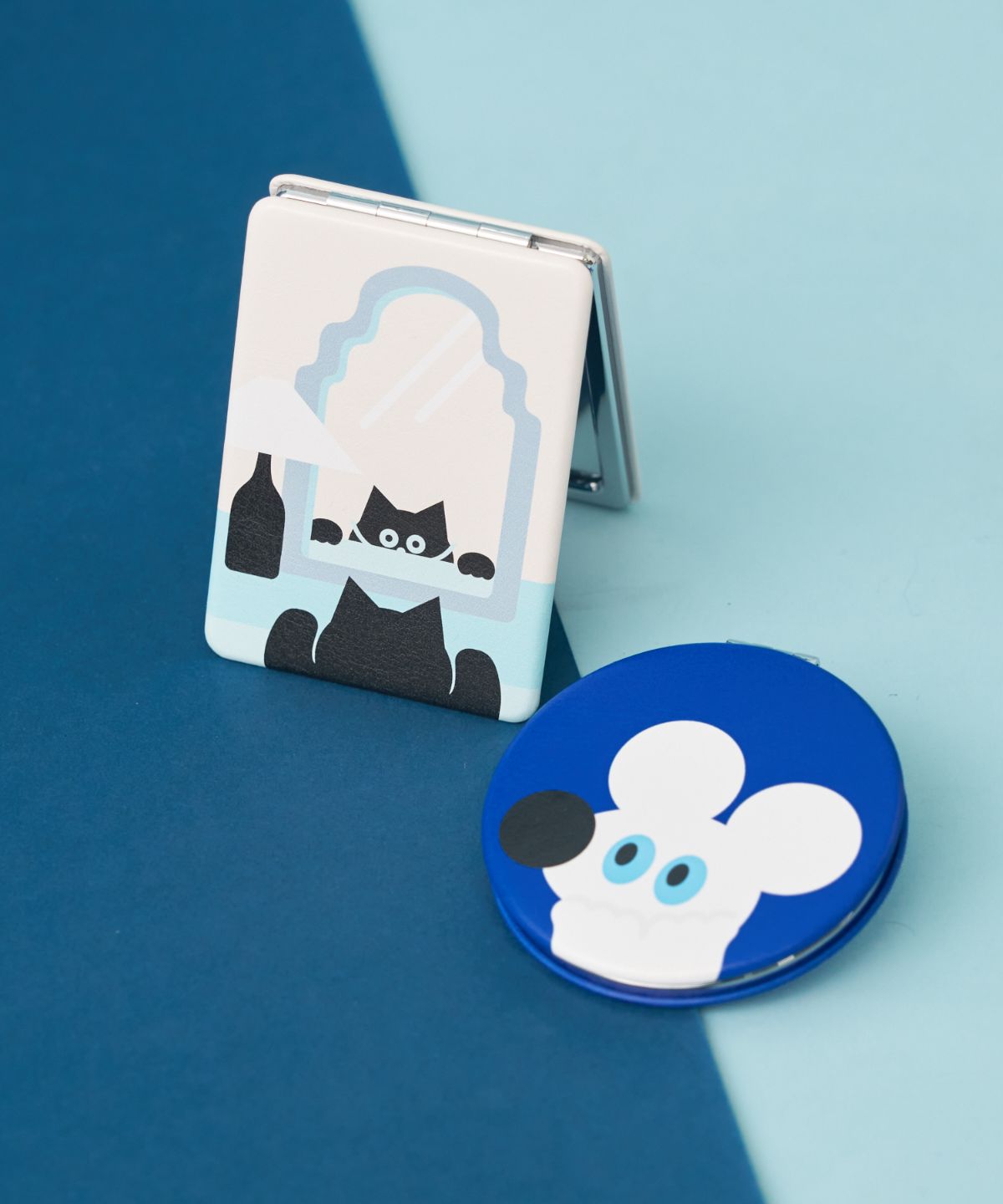 umaoの代表的なイラストのねずみとねこが描かれたコンパクトミラー。イラストのお好みで選んだり、スクエア、ラウンドの形状のお好みで選んだりできるようタイプの違う2つをご用意しました。