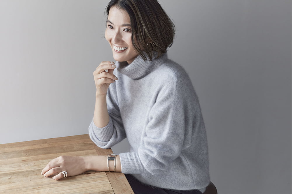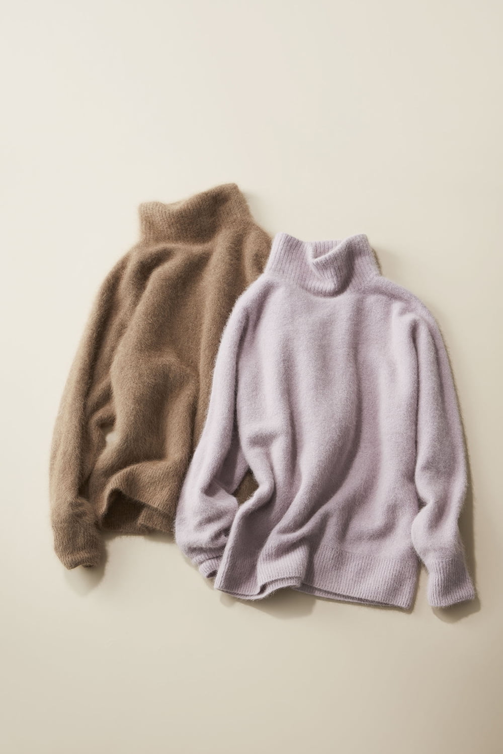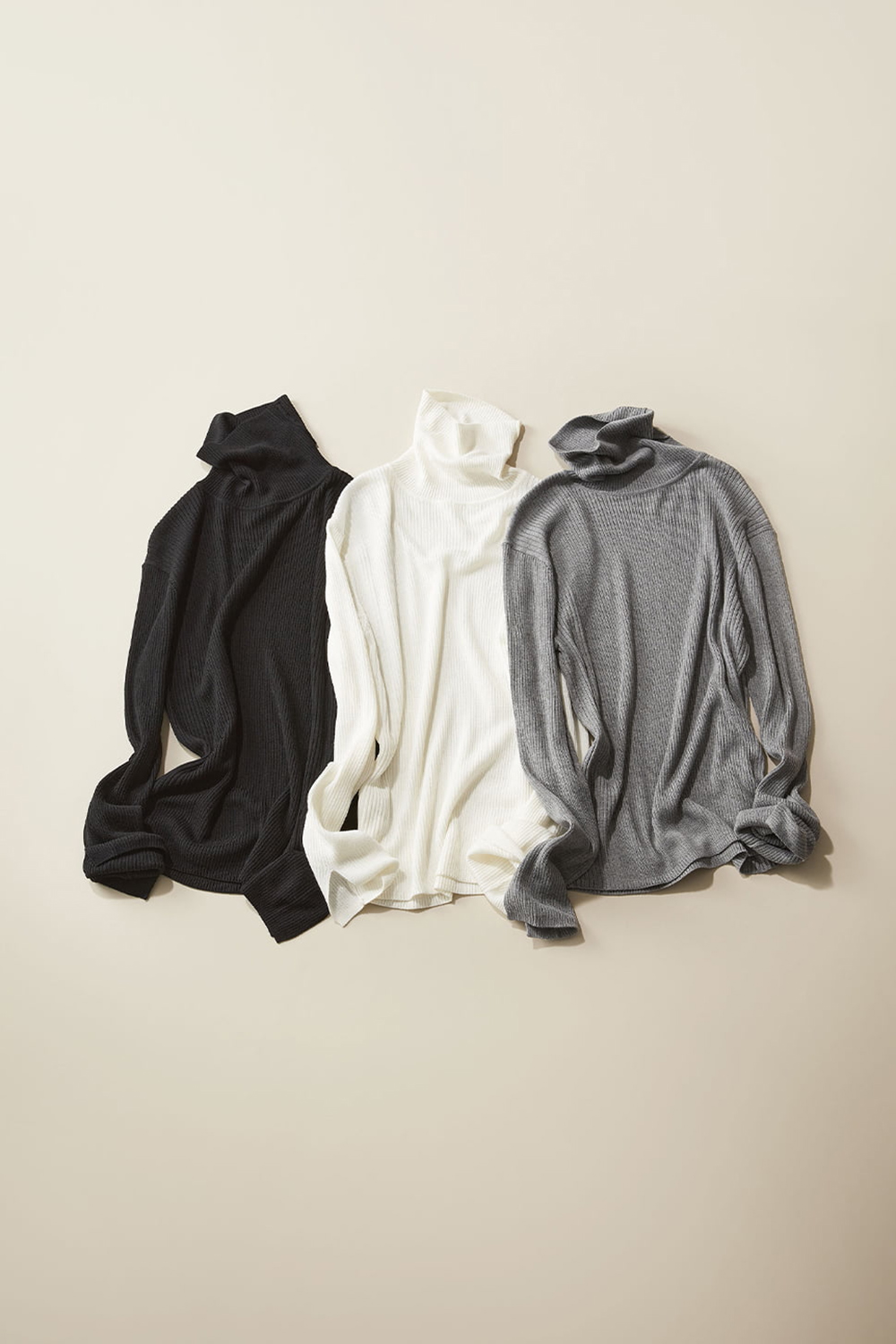 「ベーシックカラーの薄手リブニットは全色持っていて、数年に渡ってずっと活躍し続けている定番。ジャケットを重ねてももたつくことなくすっきり。もはや冬のカットソー感覚で着回し力抜群です」