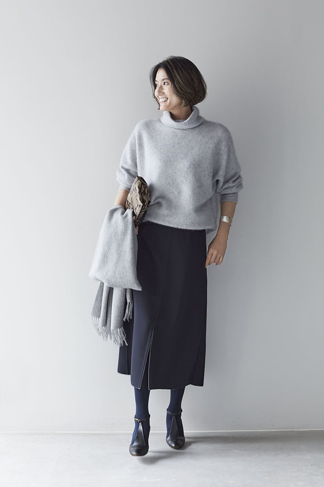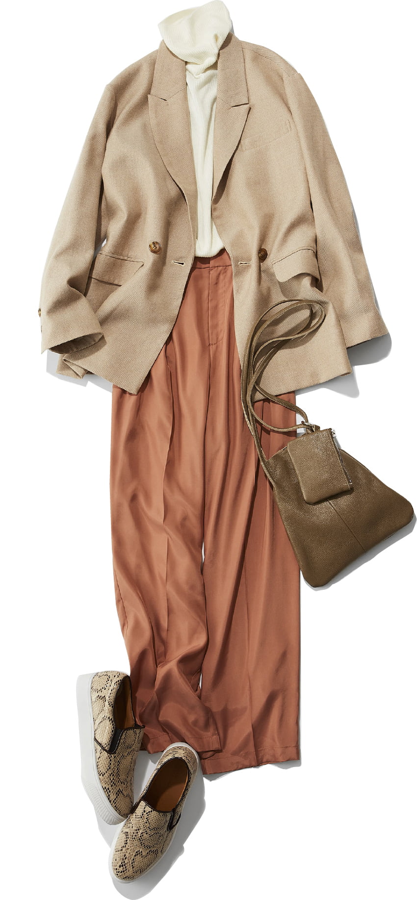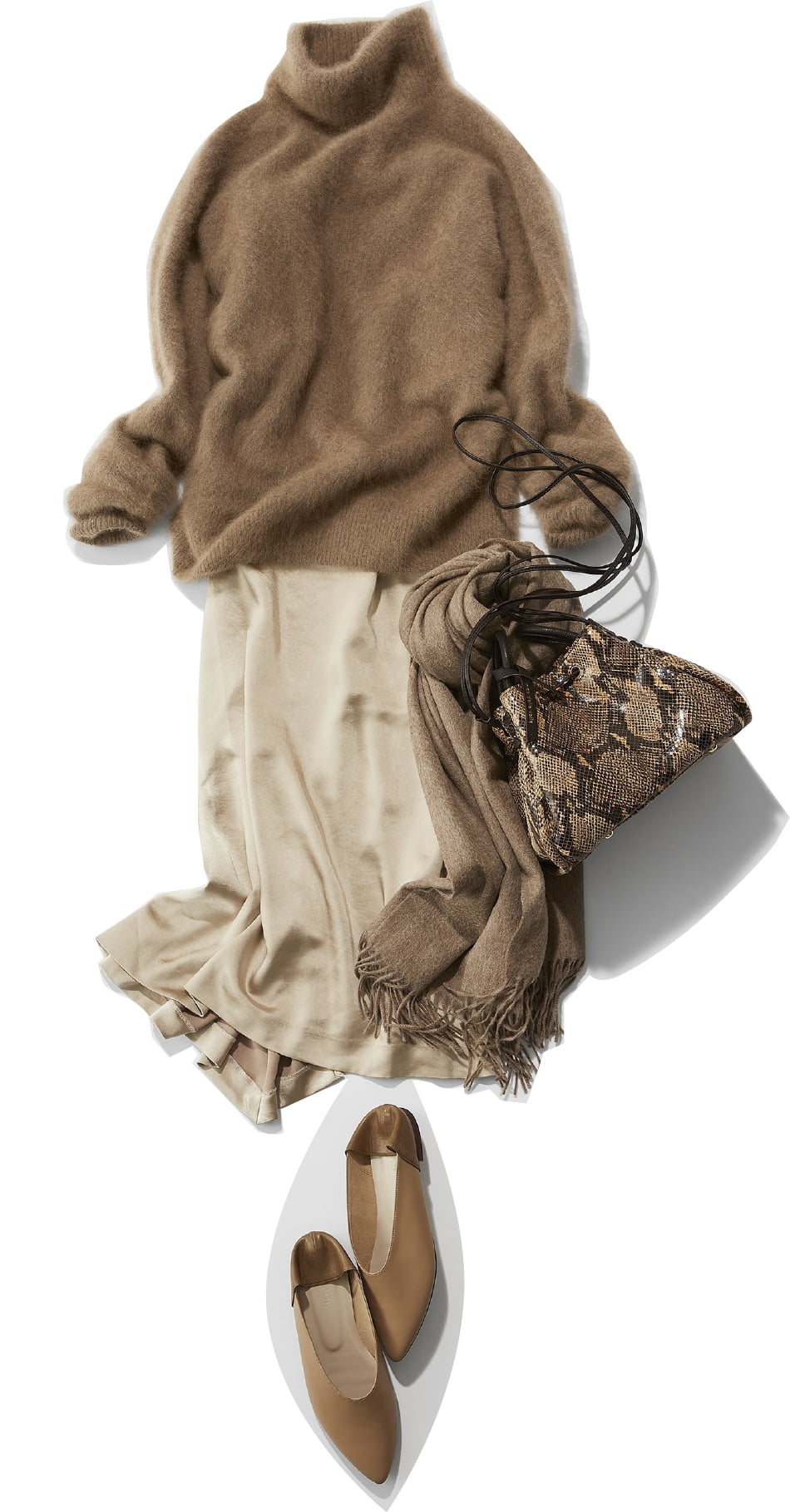「ビッグシルエットのニットに、ストンと落ち感のあるIラインの光沢ボトムの組み合わせは、この秋一番したい最旬バランス。ワントーンでまとめると上品な仕上がり。フラット靴でも女っぽさ抜群です」