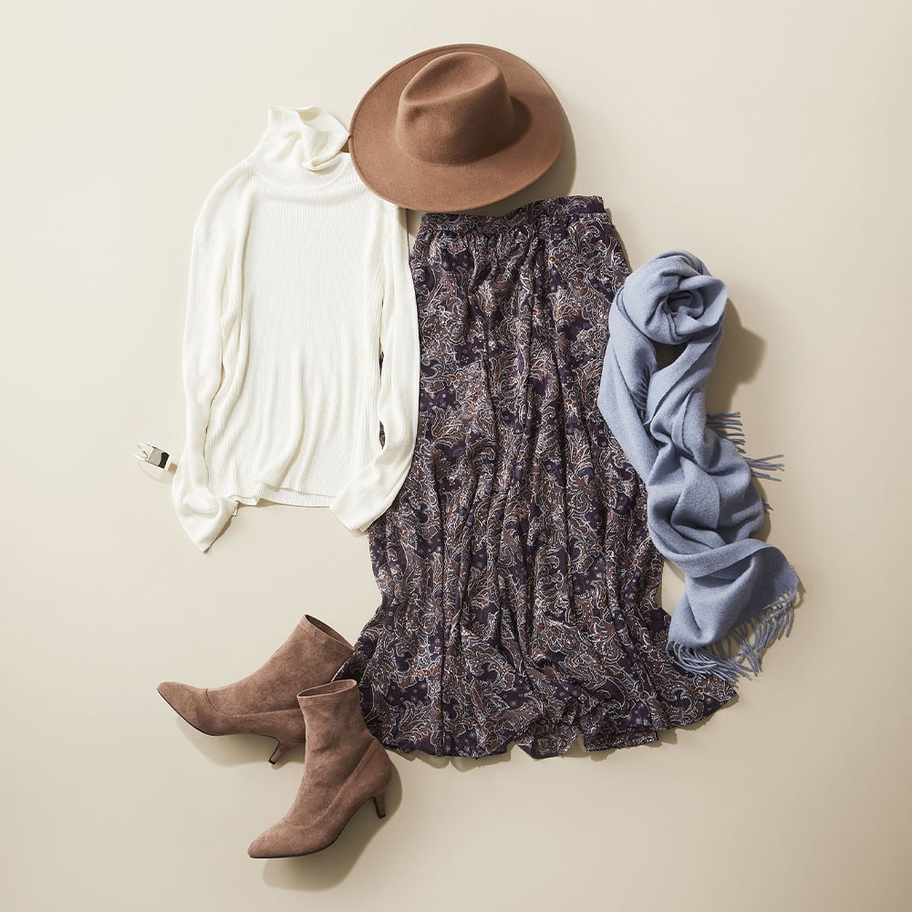 「プリントのマキシ丈スカートは一枚あるとパッと華やかになって便利。ドラマチックなのにウエストゴムで楽なのも今の気分にぴったり。スカートを引き立てるシンプルなリブニットは本当に名脇役です」