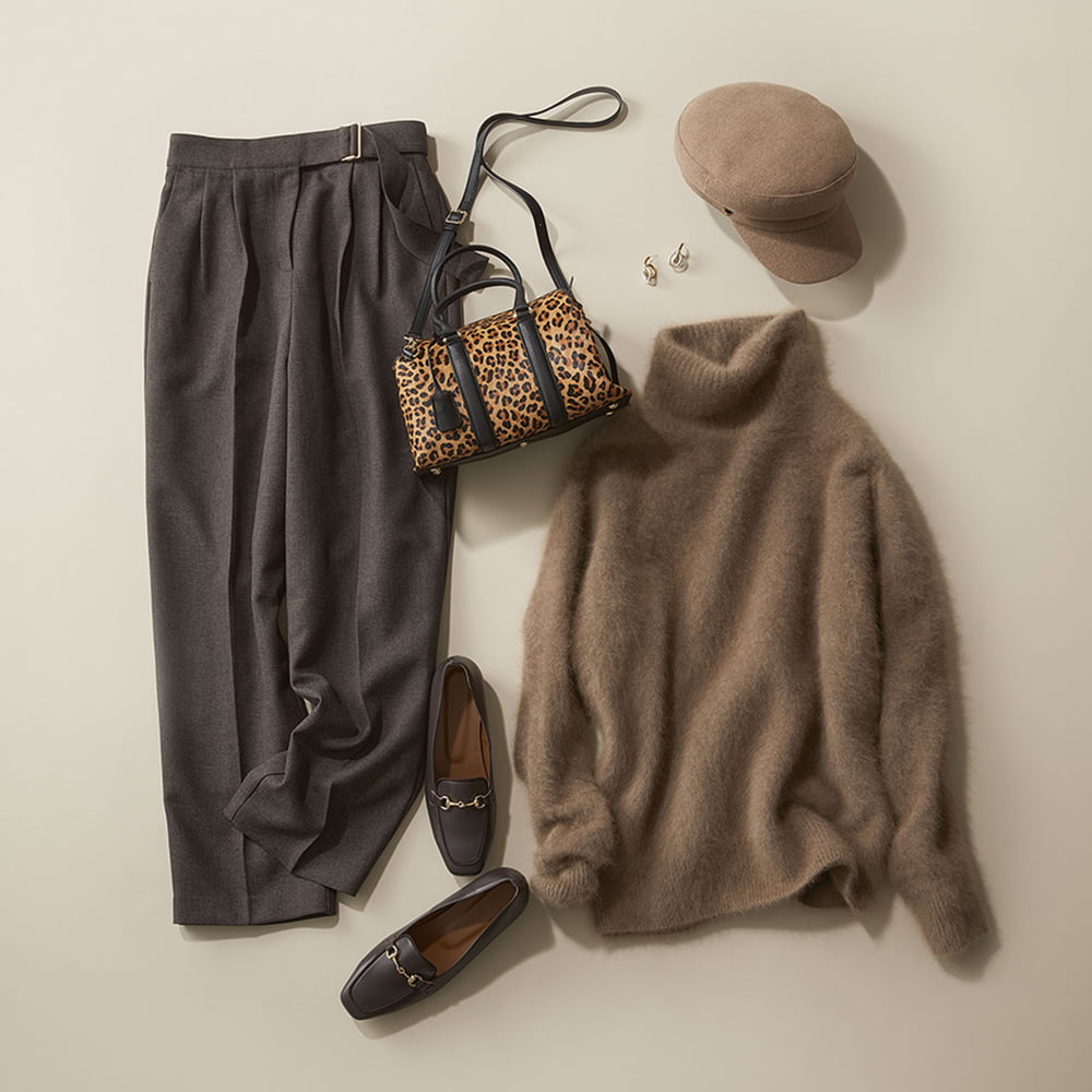 「ラクーン100%ニットの柔らかな風合いがパンツスタイルも女らしく見せてくれます。ニットの裾は前だけ少しインにしてメリハリのあるシルエットに。休日はレオパード柄バッグや帽子で遊び心たっぷりに」