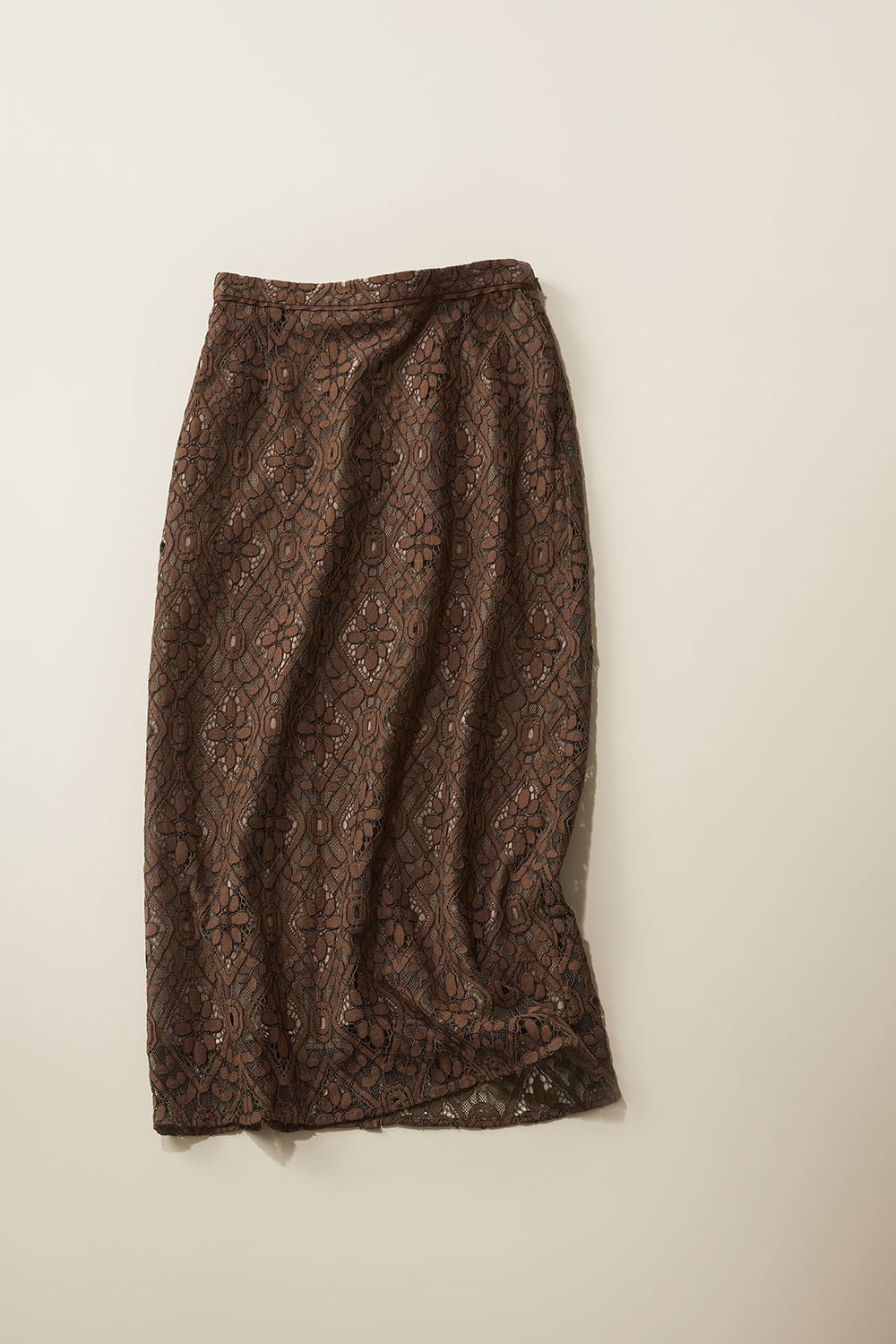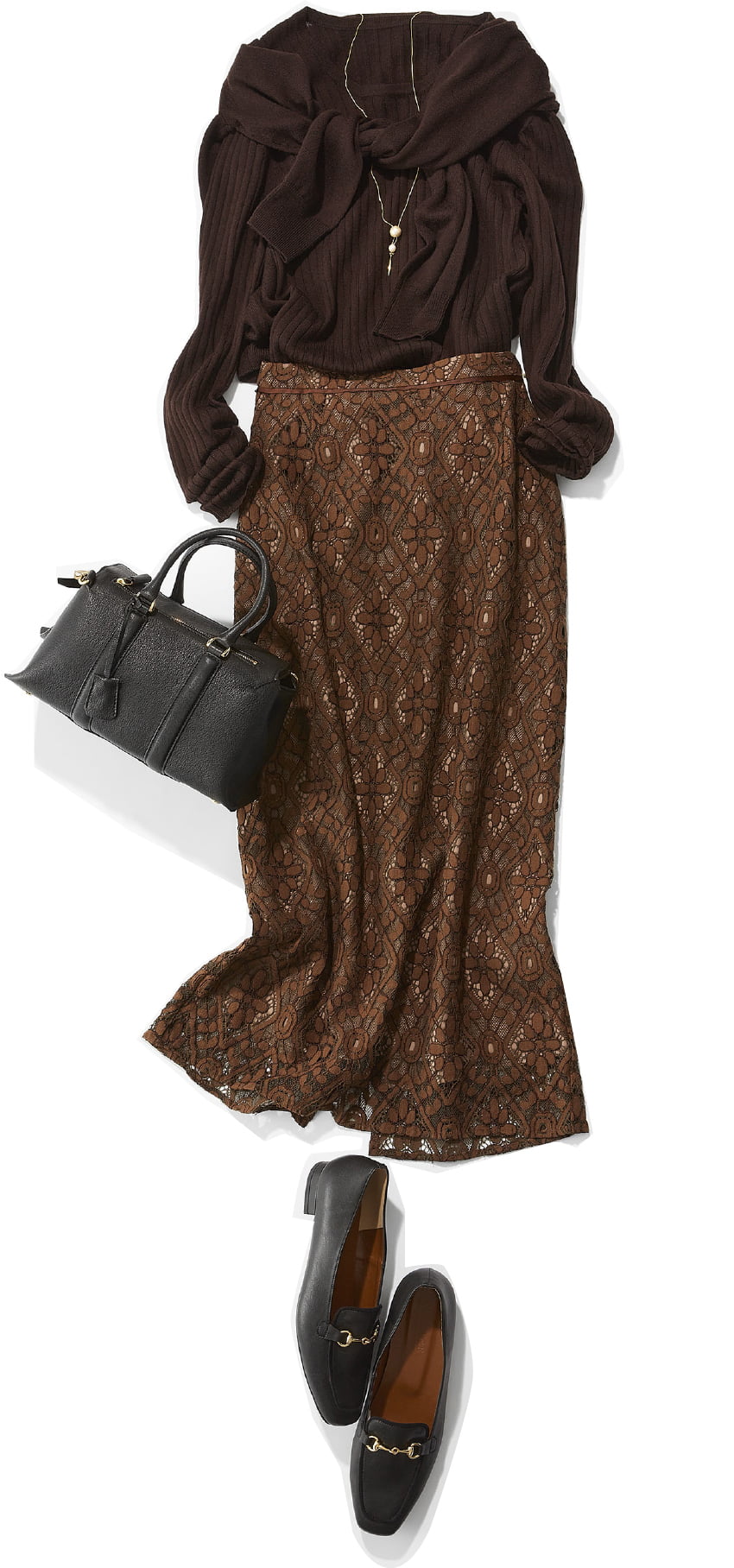 「コンサバ感の強いレースのタイトスカートですが、ロング丈や旬カラーのブラウンでぐっと今っぽい雰囲気に。きちんとした印象ながらウエスト後ろがゴムになっているのでストレスフリーな履き心地」