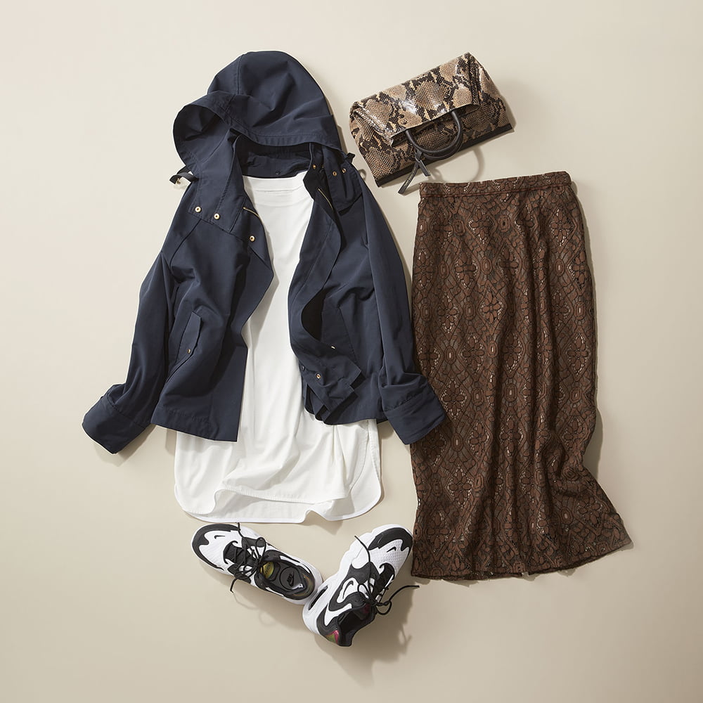 「レーススカートをブルゾンやスニーカーでカジュアルダウンする着こなしが大好き。特にこのレーススカートはタイト過ぎず体のラインを拾わないのでスニーカーと合わせても無理なくしゃれて見えます」