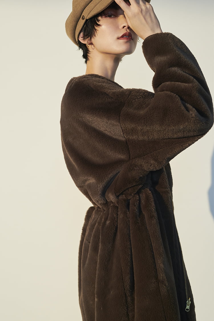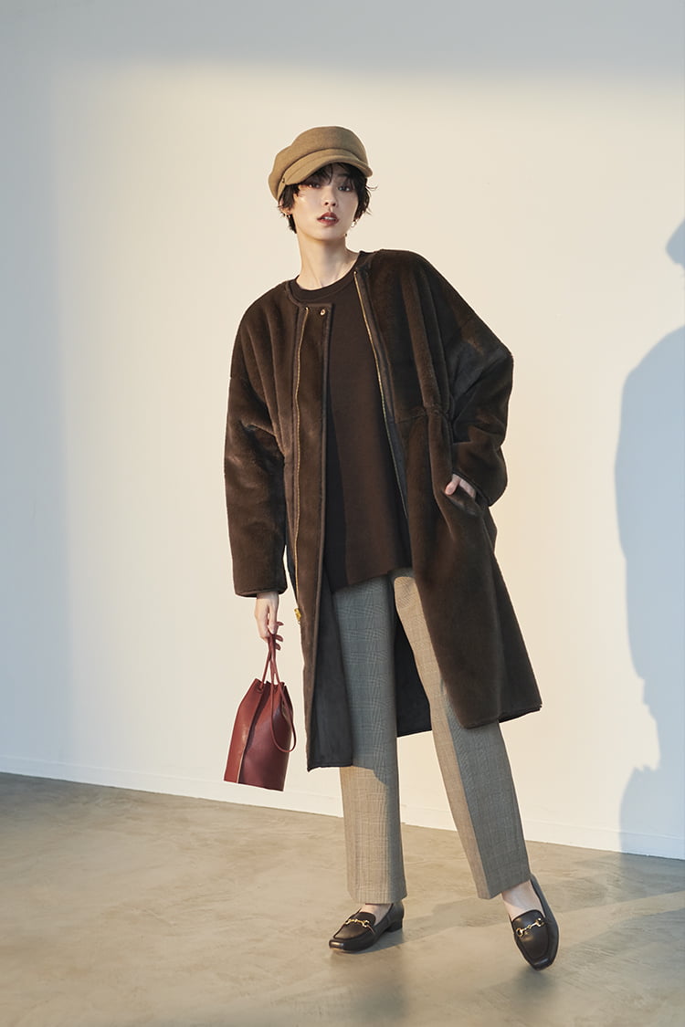 店頭展開のみ「ウールボトムが多い冬は、エコファーなどウールではない素材のアウターがあれば、合わせるボトムを選ばずとっても便利。毛足の長いファー面とフェイクスウェード面のリバーシブル仕様になっているので着回し力はさらに高まります。旬度抜群のチョコレートブラウンは黒よりも優しい印象で、肌を白くきれいに見せてくれる効果も。ドローストリングを少し絞ればメリハリもアップします」
