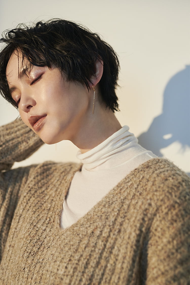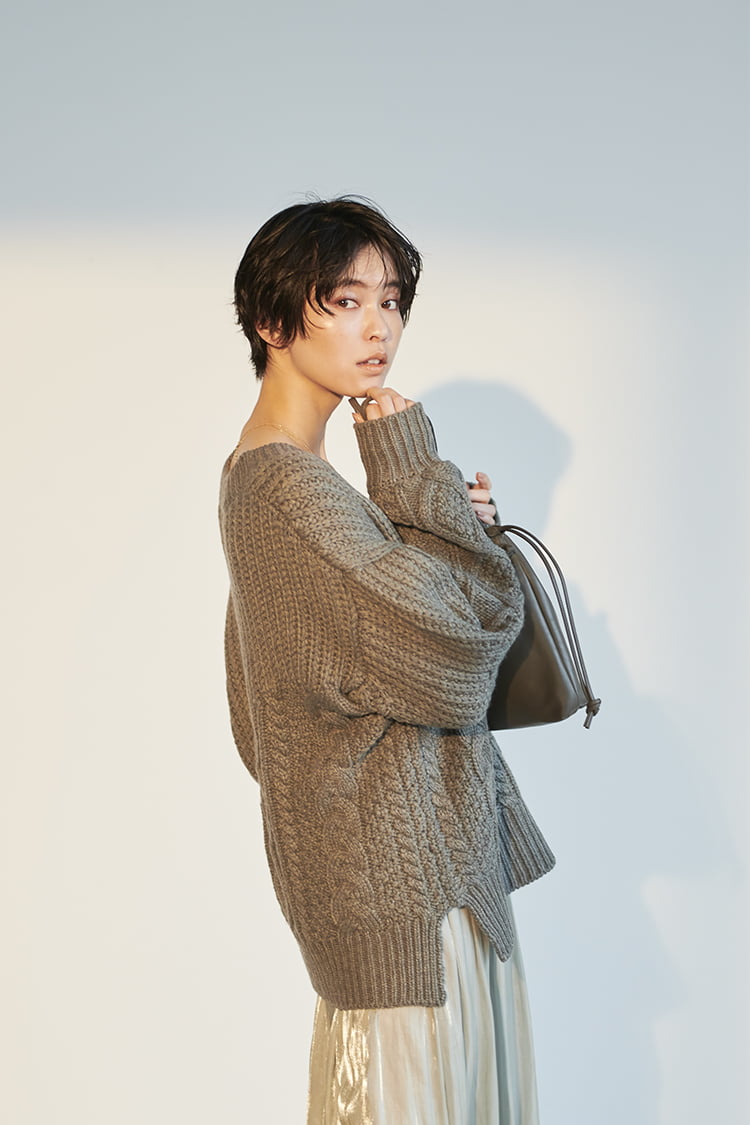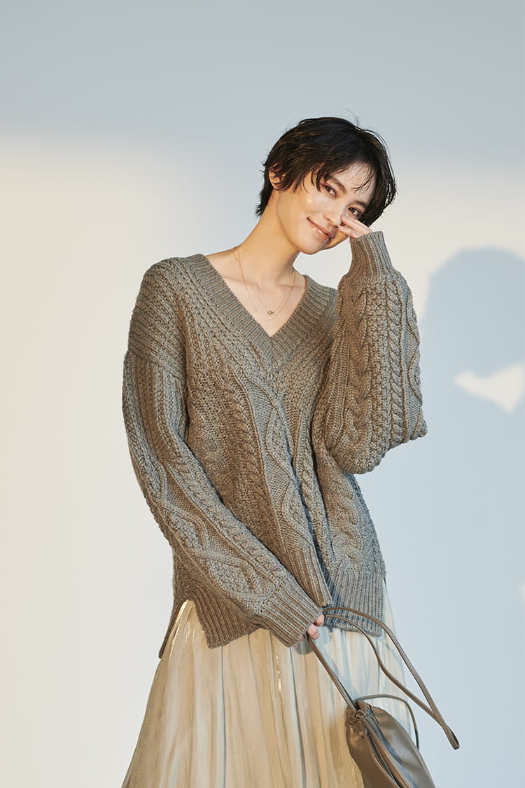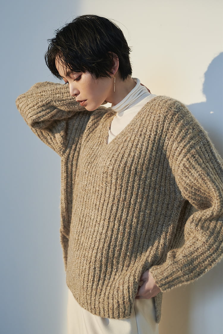 >BUY「深すぎず浅すぎずの絶妙な開きのVネックニットは、ドロップショルダーのたっぷりとした袖が特徴。今年はつやのある薄軽素材のスカートと組み合わせて、女っぽさのあるカジュアルタイルに。動く度にドラマチックに揺れるスカートがニットのほっこり感を軽減して女っぷりをアップしてくれます。この冬はロングスカートの足元にロングブーツを取り入れて、最旬の組み合わせに挑戦してほしいですね」