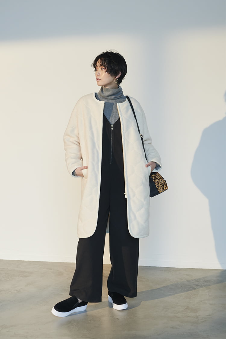 >BUY「冬に映える真っ白なコートは、甘くなりすぎないミリタリー調のキルティングがちょうどいい。ノーカラーなのでタートルやストールなど首元に立体感を出すコーディネートと相性がよく、軽量なのでストレスフリーな着心地。白、黒、グレーとモダンな色合わせなら、オールインワンのカジュアルスタイルも大人っぽく仕上がります。足元は厚底スニーカーでボリュームアウターとのバランスを取って」