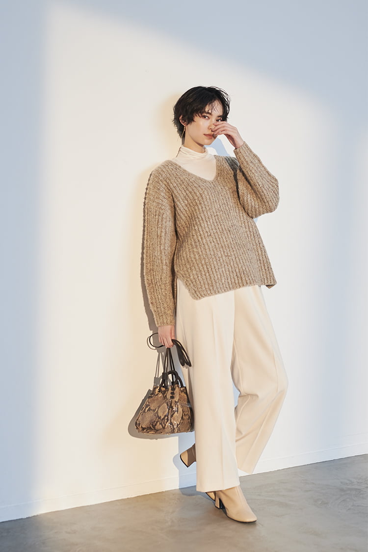 >BUY「ざっくりとしたあぜ編みのVネックニットは、一枚で女っぽく着こなすのはもちろん、透け感のある薄手のタートルと重ねてモダンな方向にシフトするのも今らしい。裾にスリットが入っているのでアウトに着てもすっきりスタイリッシュに決まります。全体の色みを白とベージュ系でまとめれば今どきなしゃれ感がぐんとアップ。ニットスタイルがほっこりせず大人な印象に仕上がります」