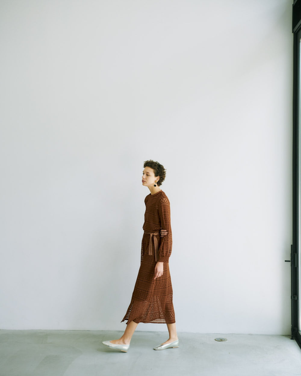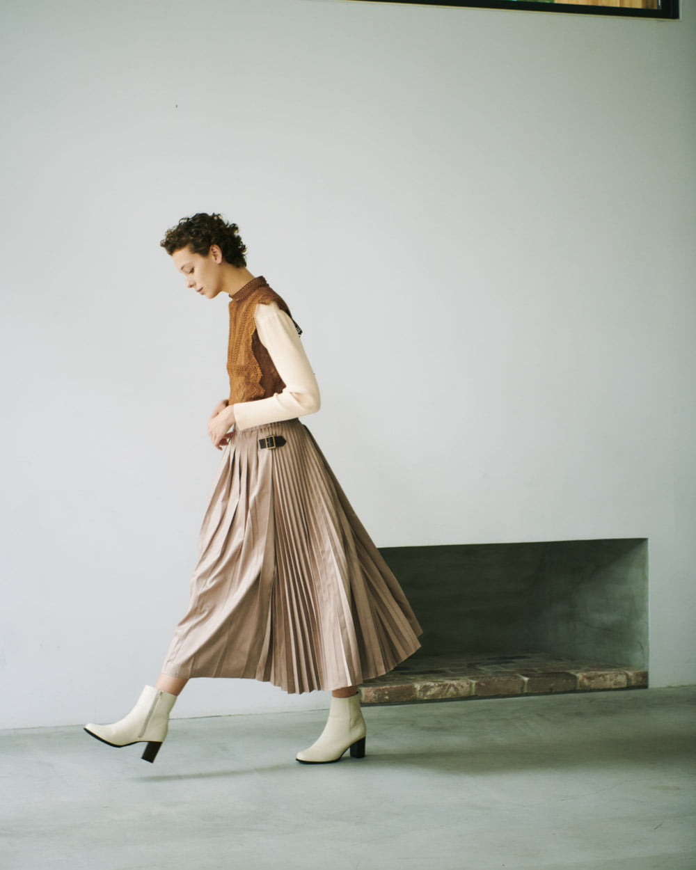 女性らしさを際立たせる緩やかなシルエットのニットやボトム。