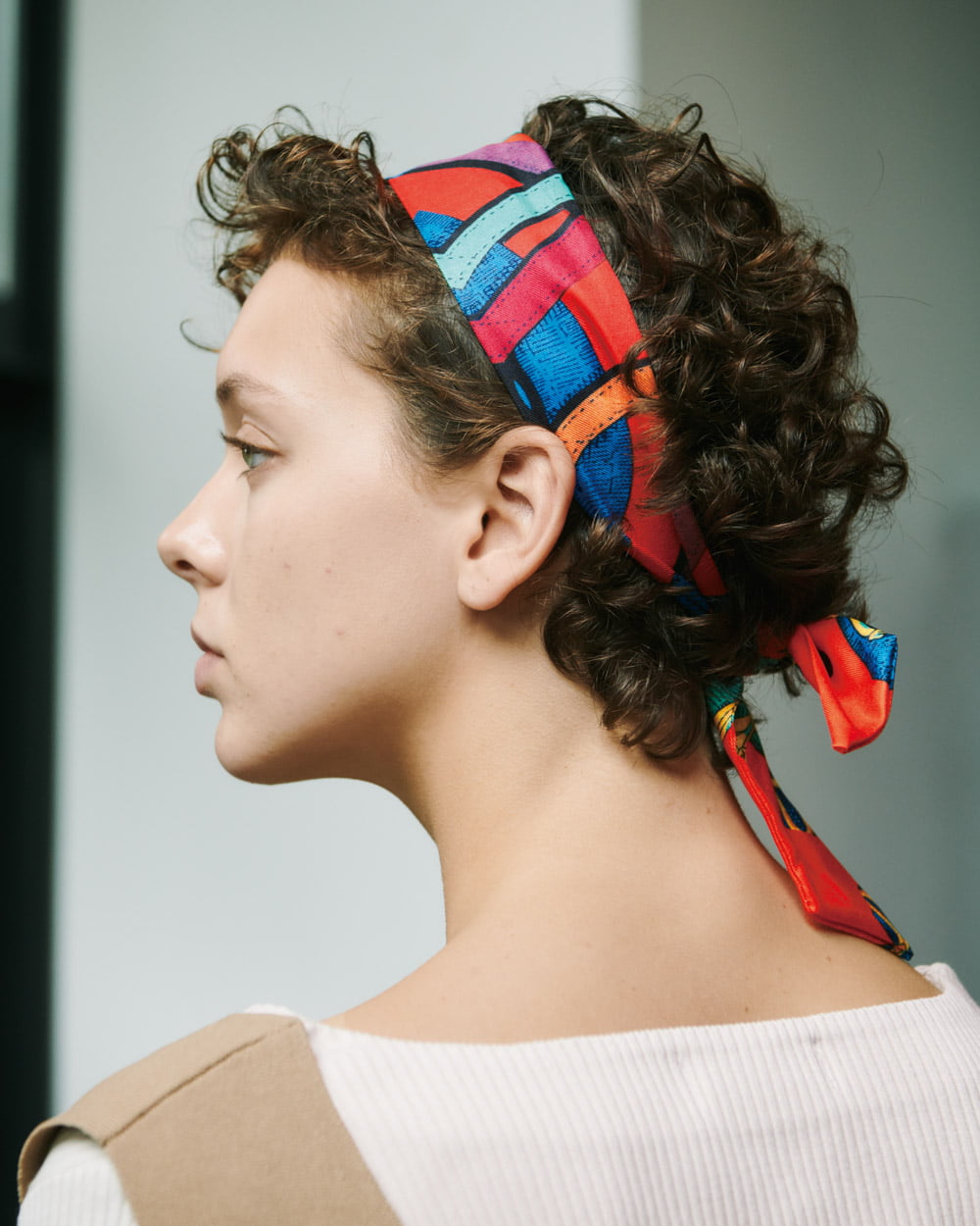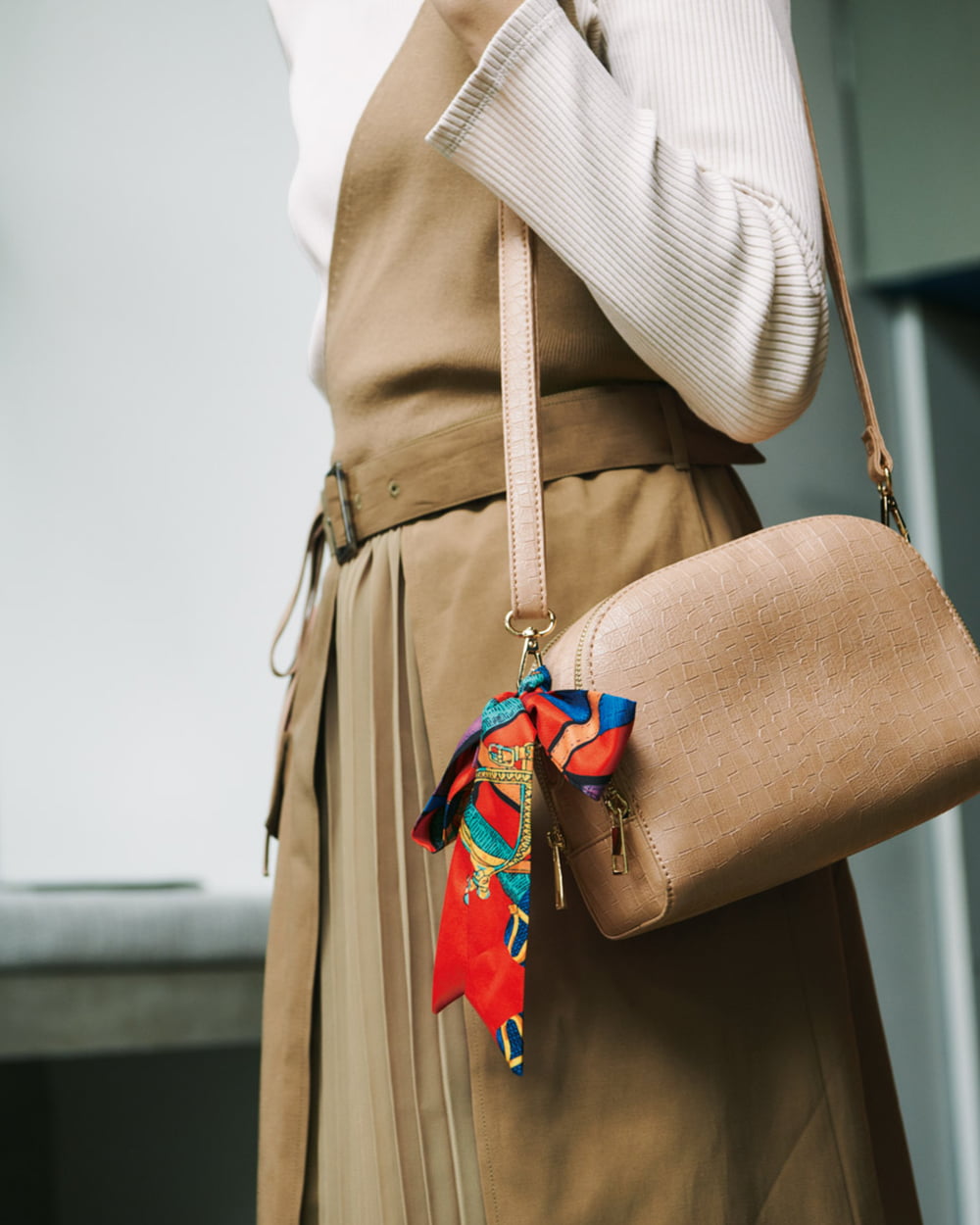 シックなベージュやブラウンに効かせるフレッシュな色柄。