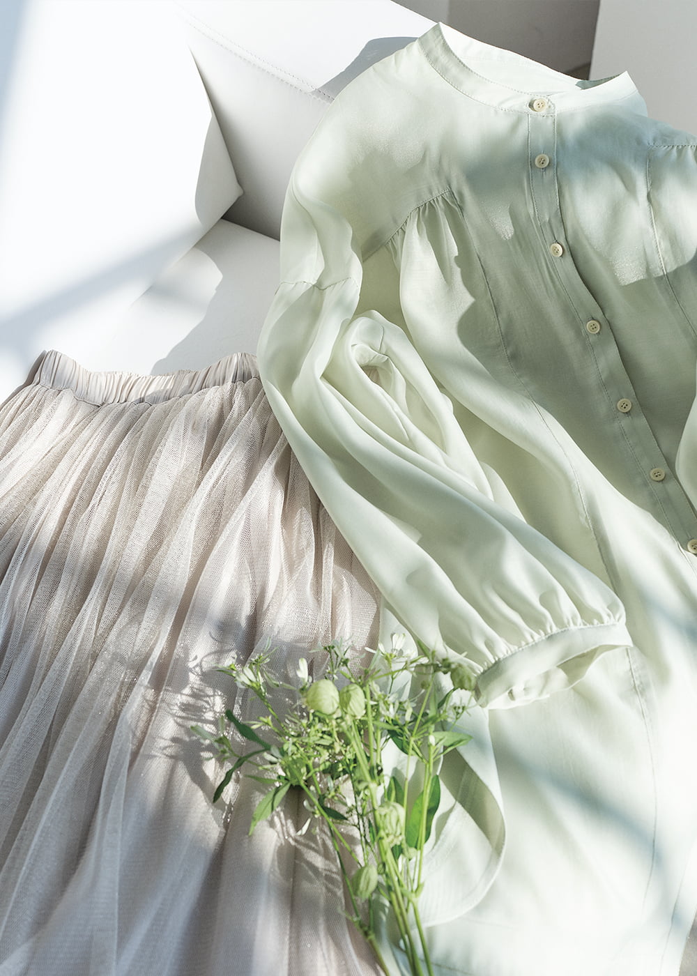 身につければ気持ちが上向く、そんなウェアを思い浮かべながら光が通り抜けるような軽やかなファブリック、