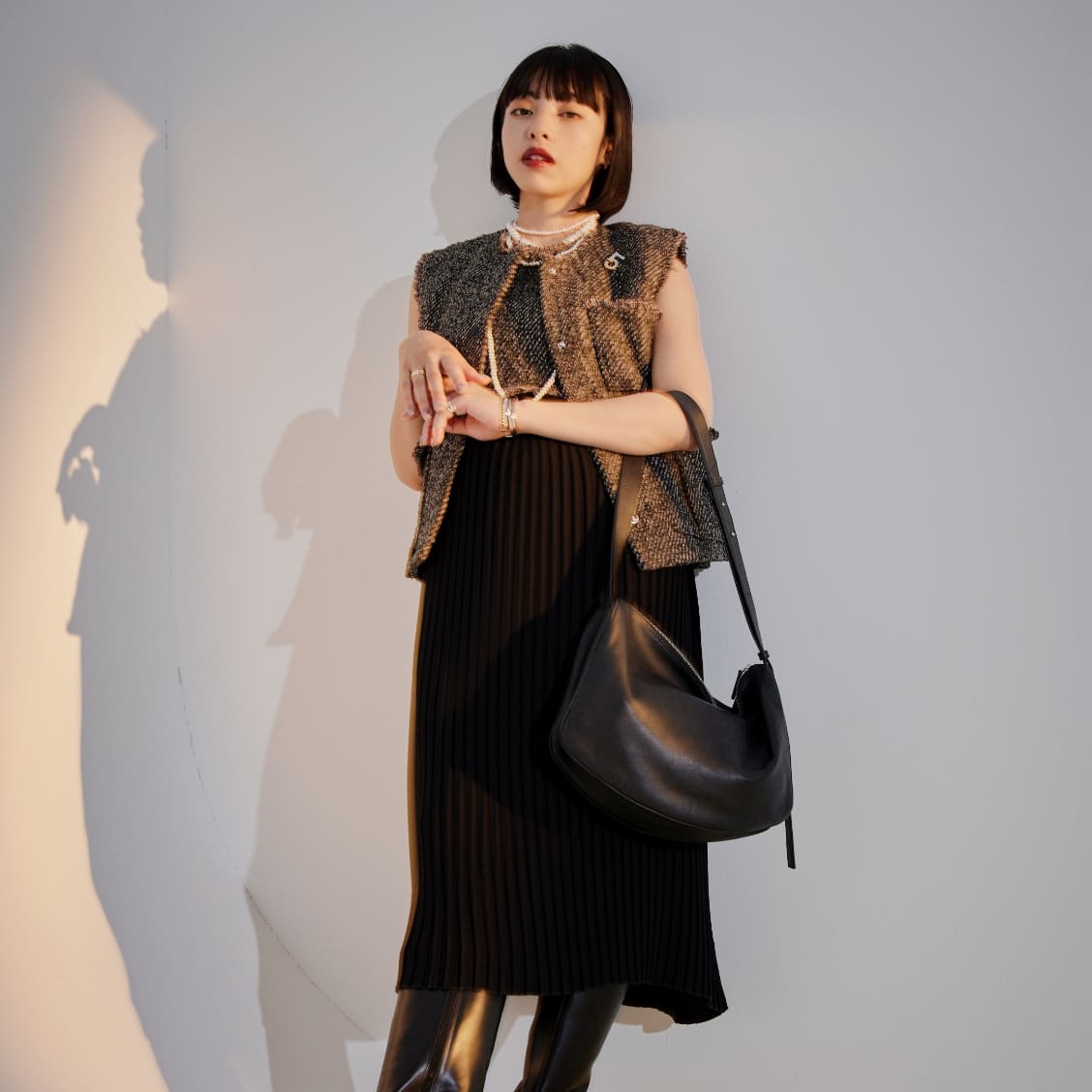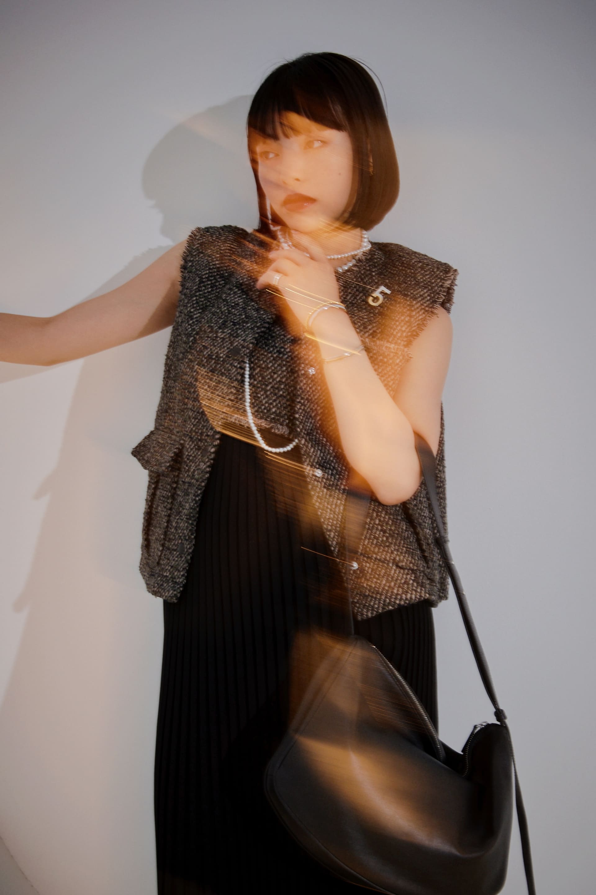 プリーツ加工を施したジョーゼット生地とツイードを組み合わせたワンピース。細やかなボックスプリーツはスッキリとしたシルエットでありながら動くたびに異なる表情を生み出します。