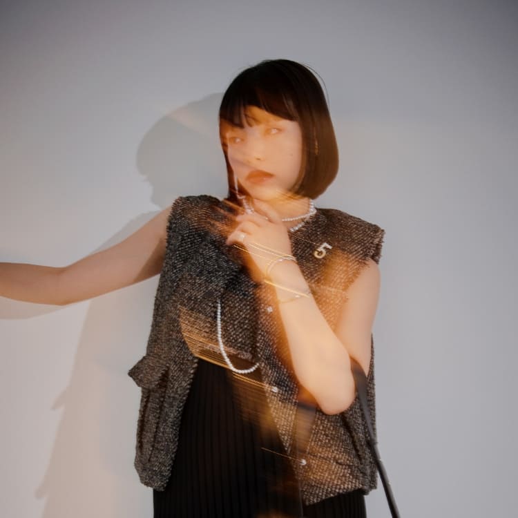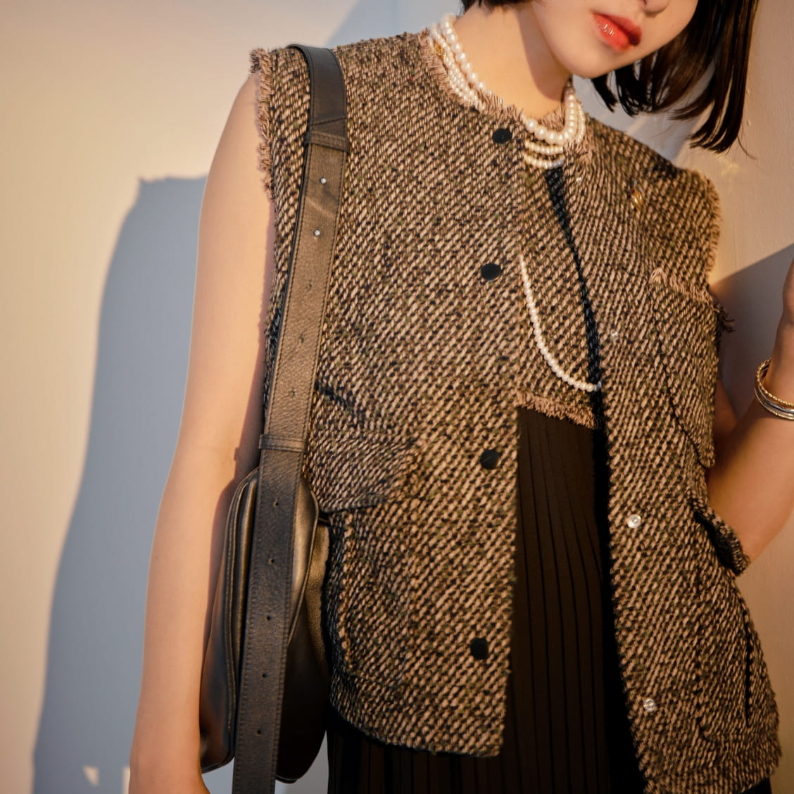 太めの糸でザックリと織り上げたミックスツイードベスト。4色の糸を使用することでクラシカルな雰囲気の中にヴィンテージ感もあるデザインに。胸元にブローチをプラスするのもおすすめ。