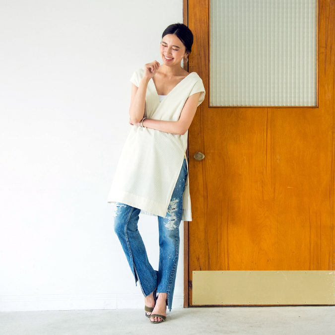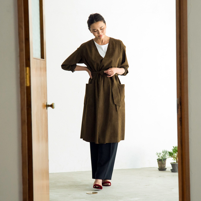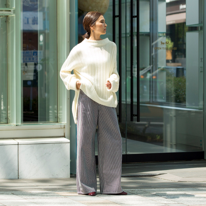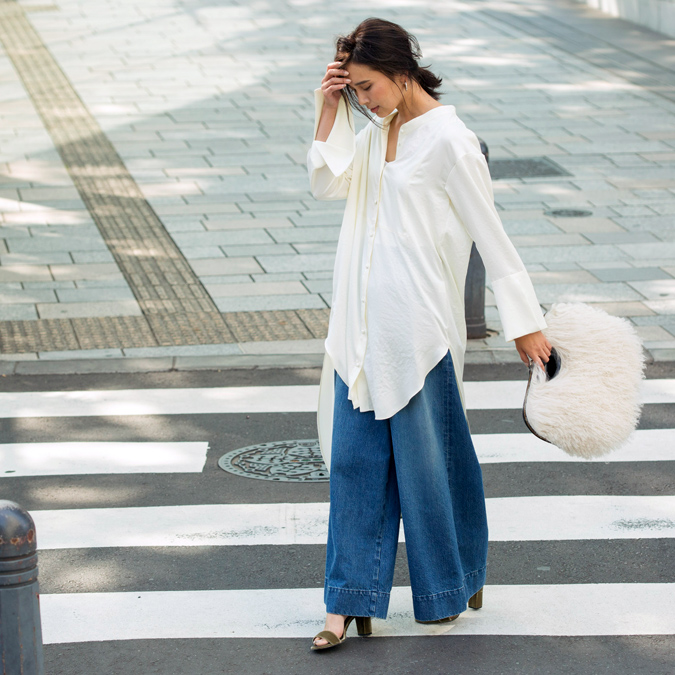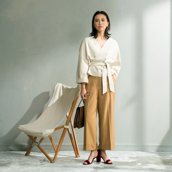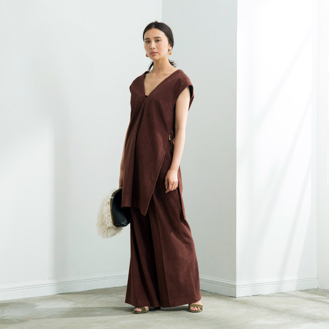 コーデュロイ素材の半袖チュニック&ワイドパンツなどを使用した