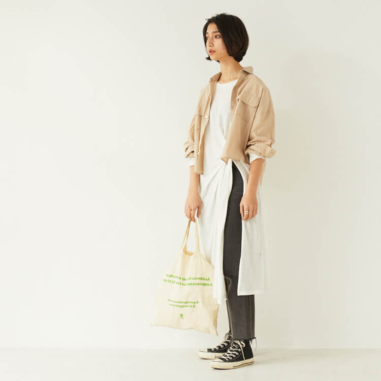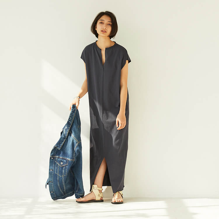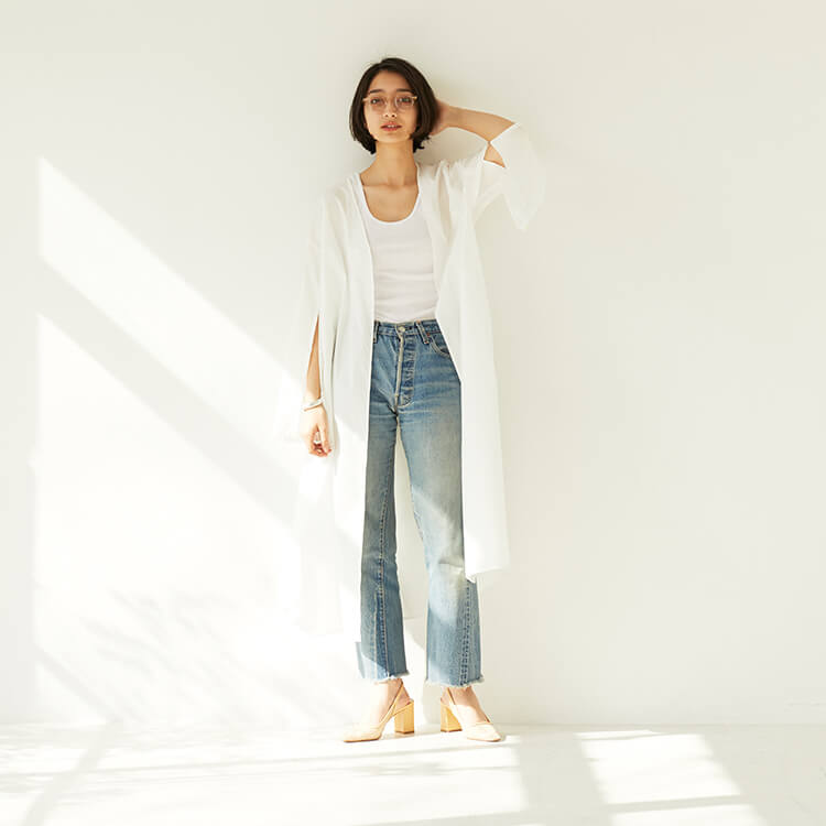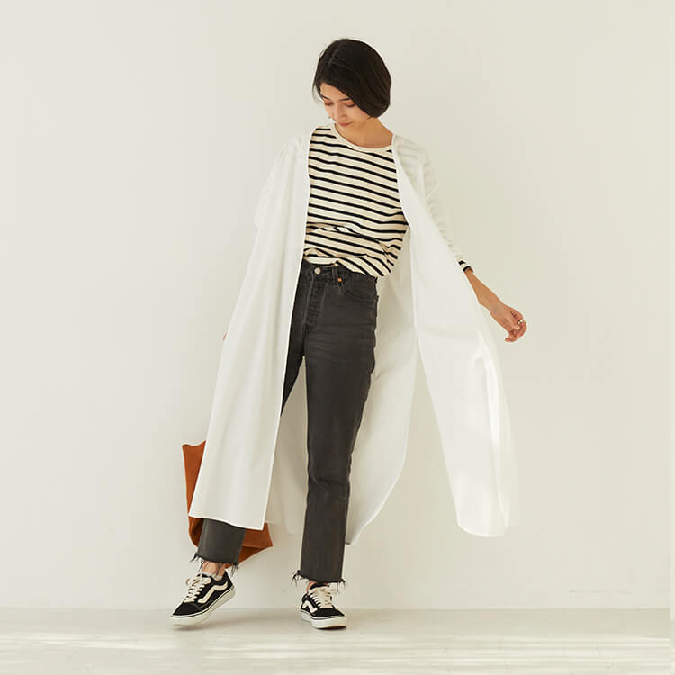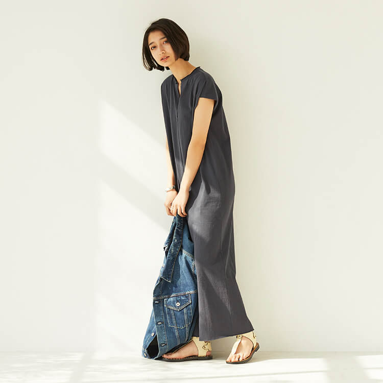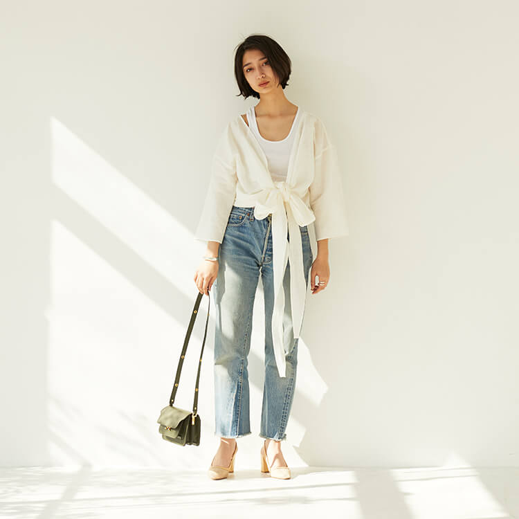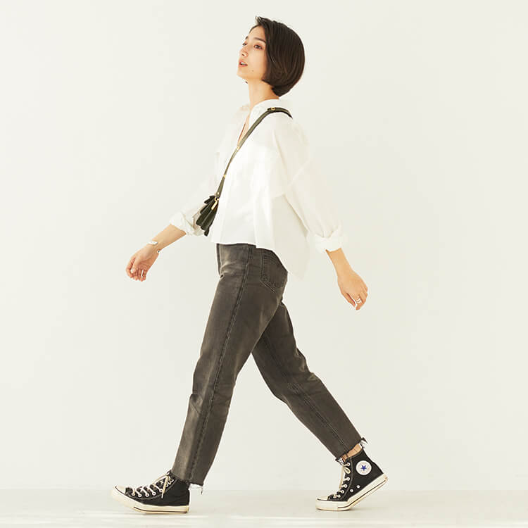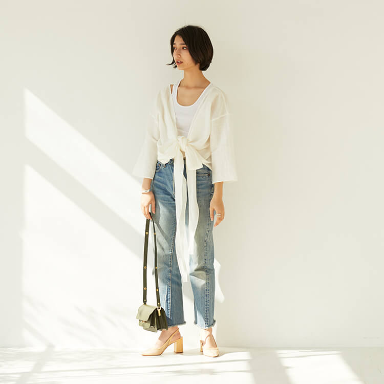 デニムやTシャツなど、ベーシックワードローブに合わせるだけで