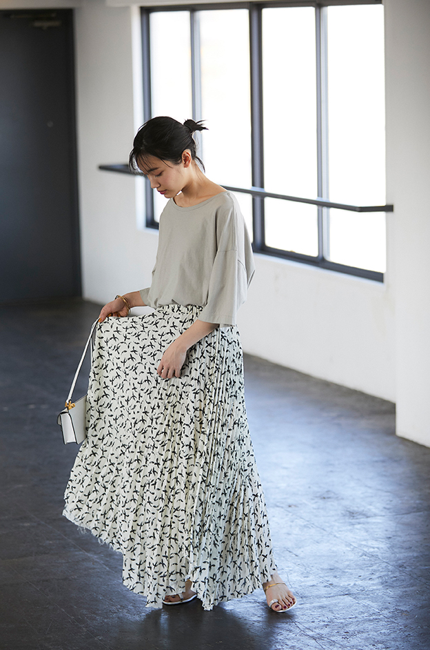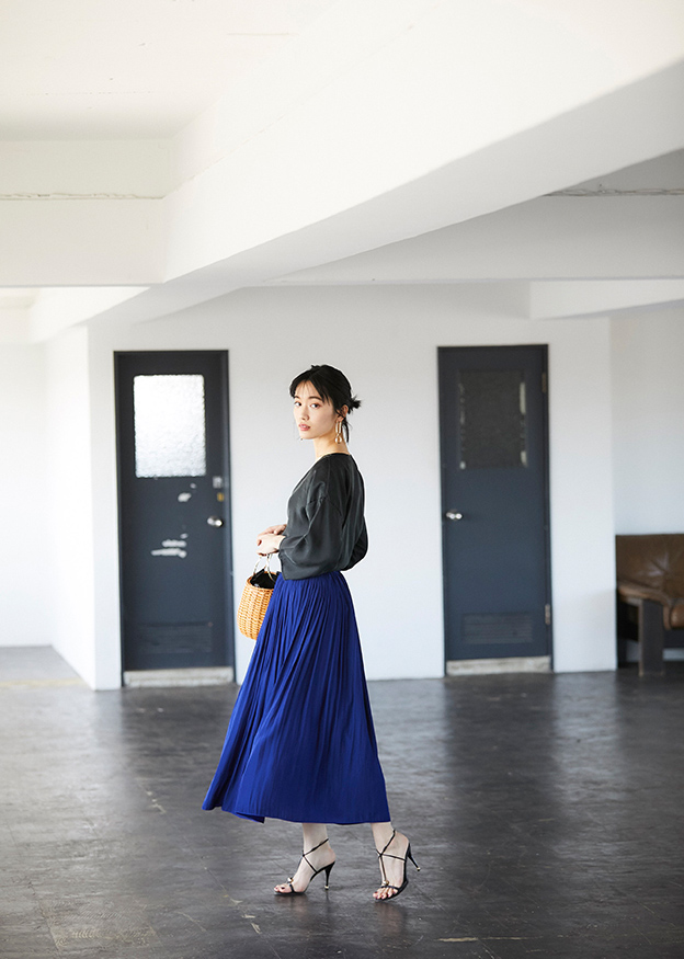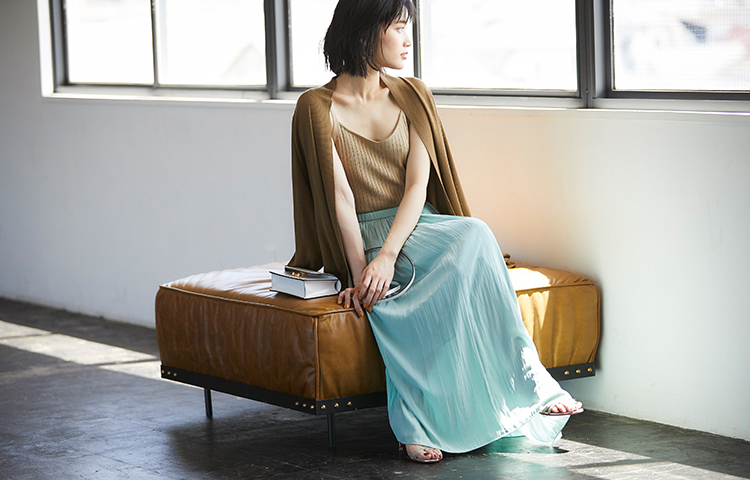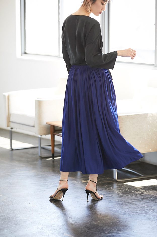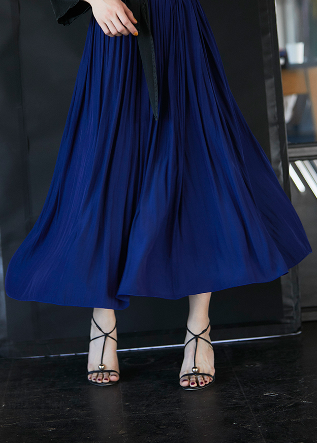 素材と分量のバランスで、肌ざわりが驚くほど滑らか。歩く姿も絵になるドラマティックなシルエットで、なんとなく気分まで華やかに。