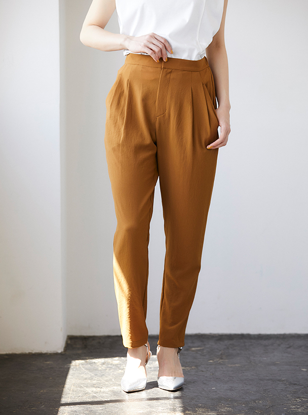 ポリエステル素材でもつや感はなく、さらっとした印象とはき心地。 ウエストに入ったタックが腰回りをゆったり見せ、柔らかい素材のおかげで着ぶくれ感のないすっきりしたシルエットで細見えが実現します。そのはき心地にプラスして、「痩せた?」と言われそうなほどに細く見せる美しいシルエット。