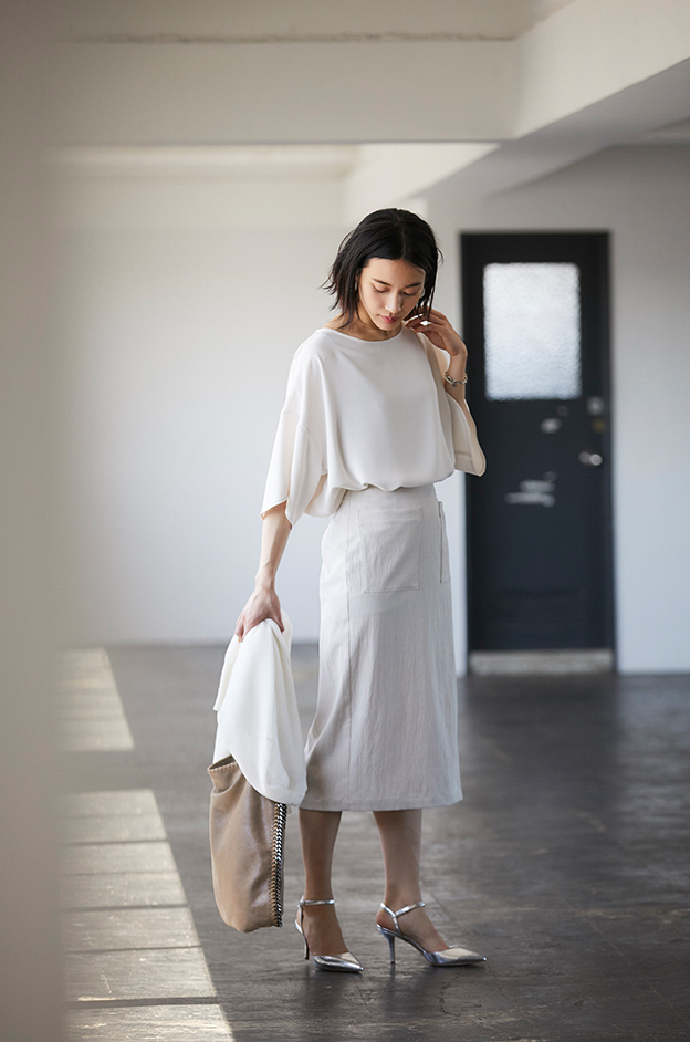 毎シーズン人気の「クールオーバーTシャツ」は、その名の通りドライタッチのコットン素材を使用したオーバーサイズのTシャツ。上品な表面感の素材なので、オフィスカジュアルにも取り入れやすく、からだのラインを拾いにくいゆったりした形ですが、横に広く開いた襟元が女性らしい首回りの華奢さを演出します。サイドスリットがビックシルエットでもすっきり見えるポイントに。