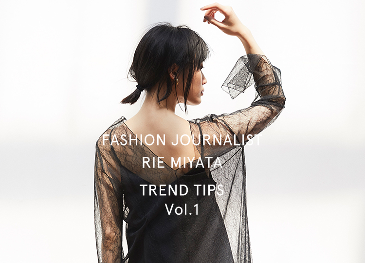 レース素材自体にも風合いにバリエーションが増えてきました。こちらのようなとろみを帯びたレースは自然な落ち感が出るおかげで、縦長いイメージが寄り添います。カシュクールタイプのトップスと合わせて、さらにフェミニンな風情に。