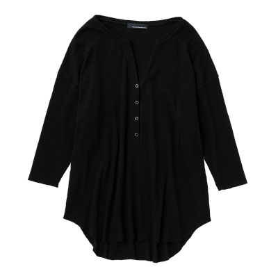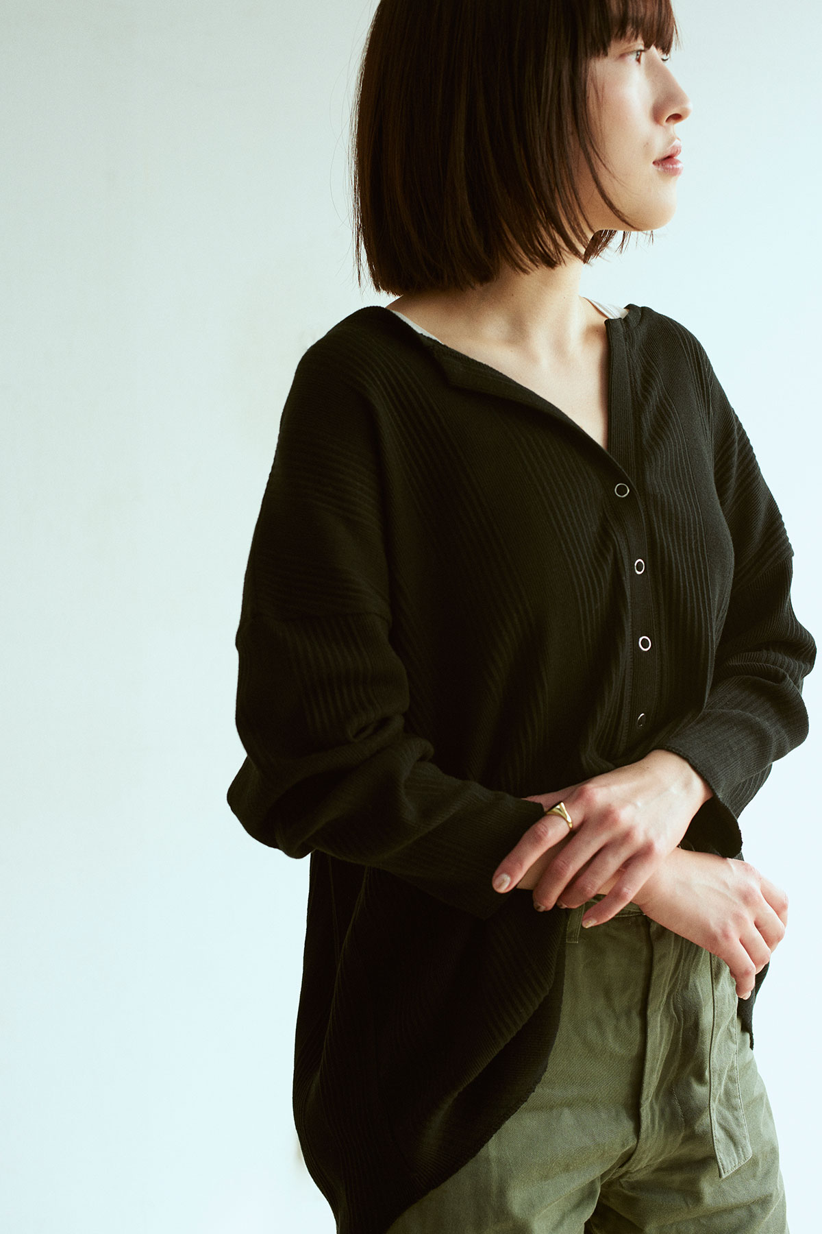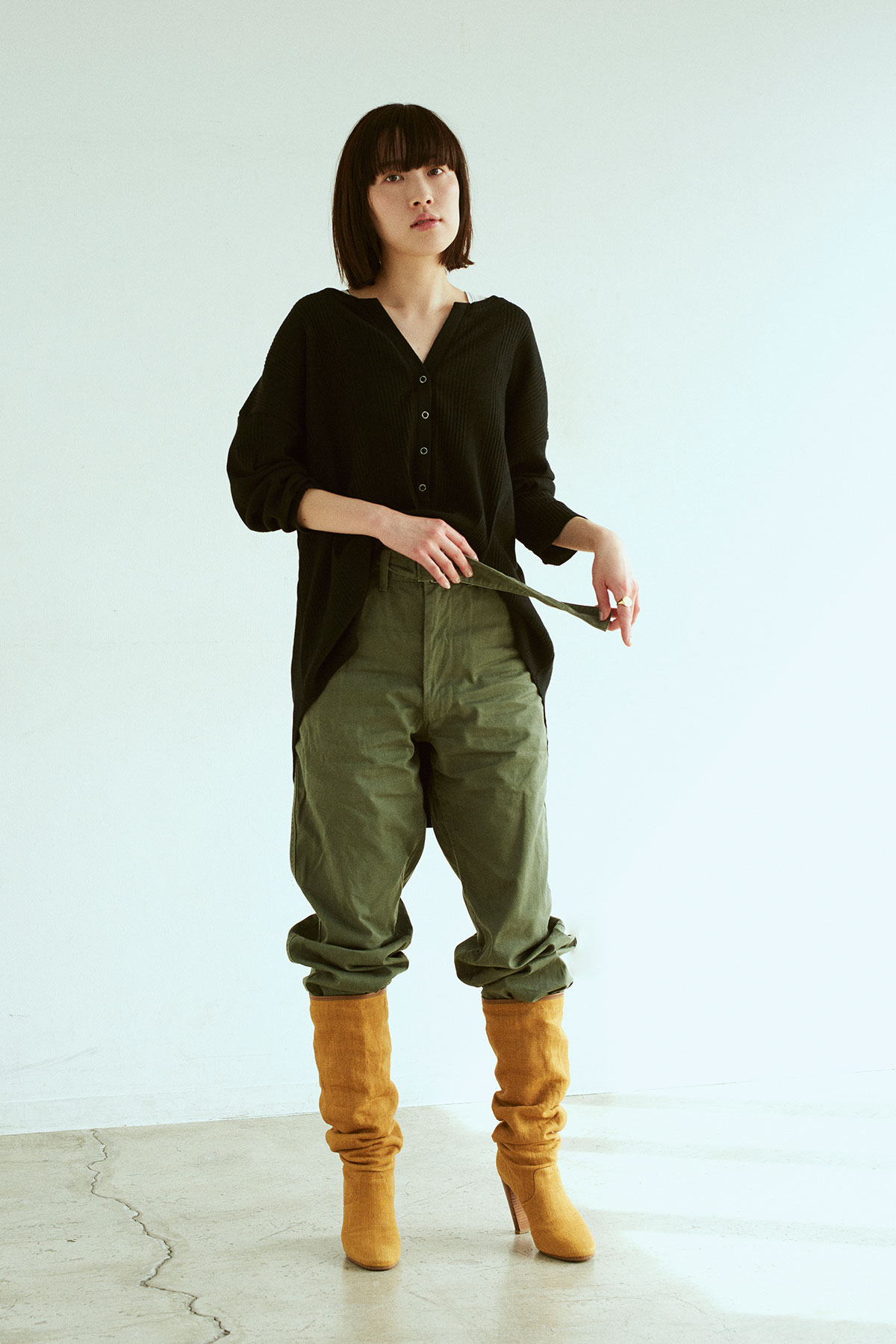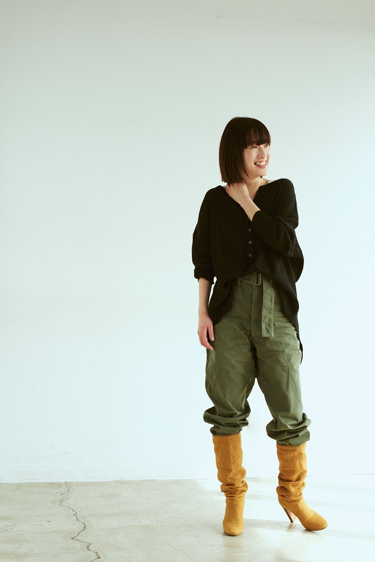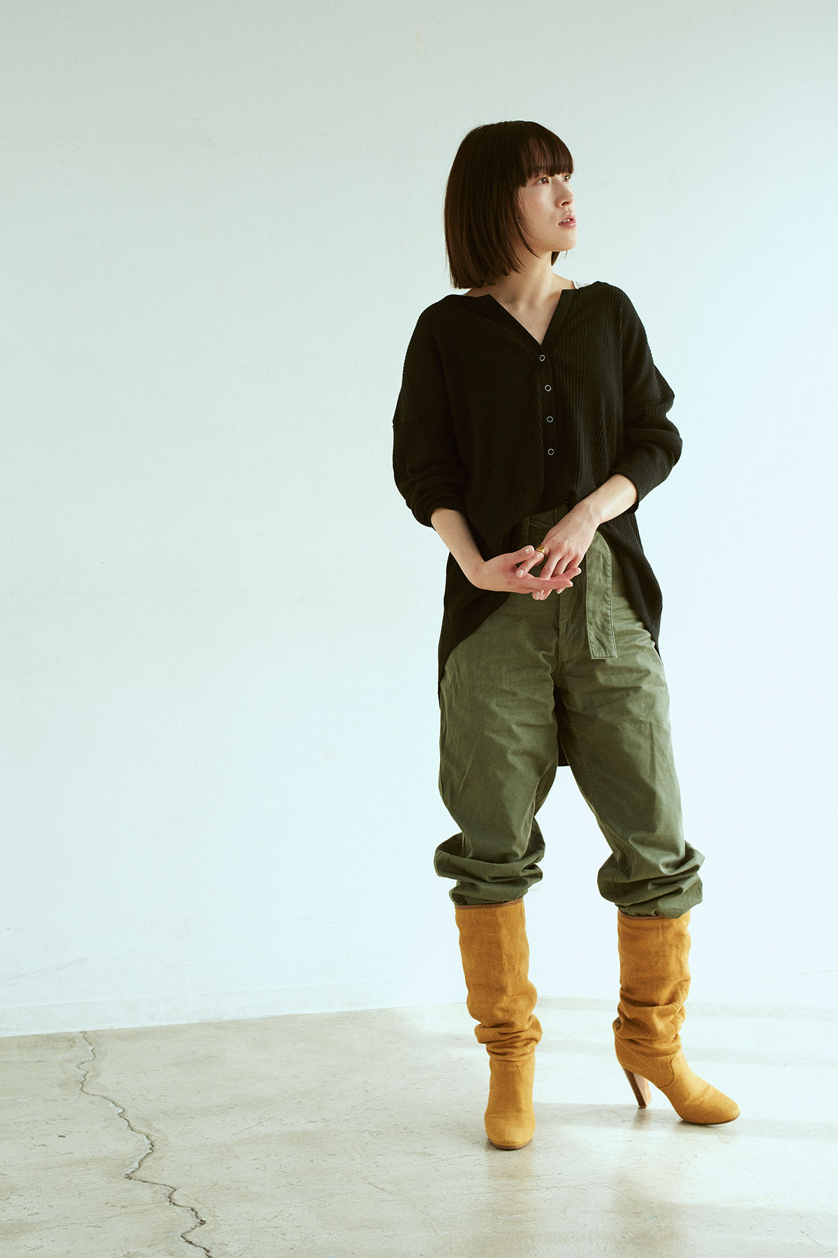ヘンリーネックのカジュアルなディテールとハイウエストのカーゴパンツにブーツ。